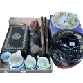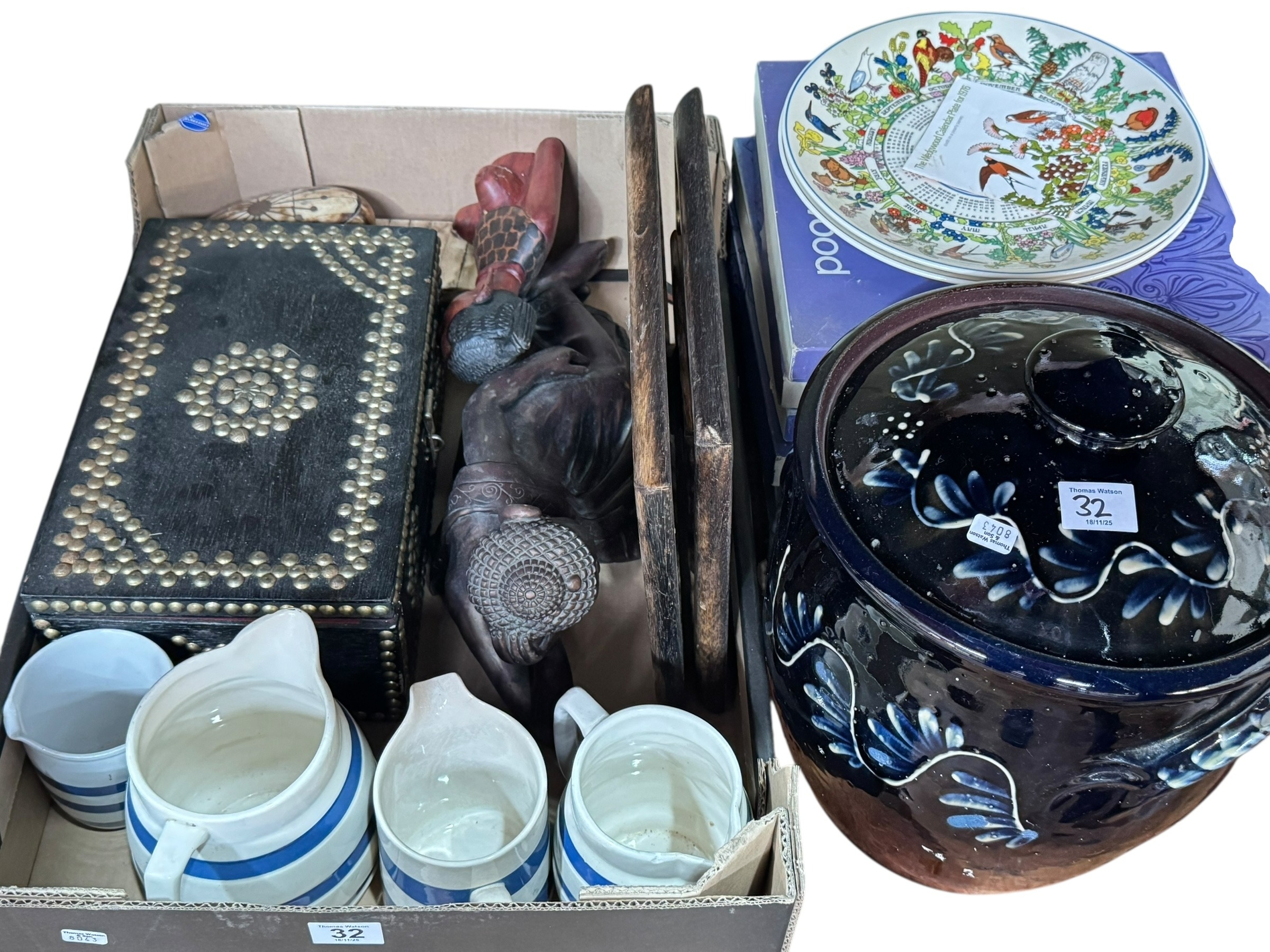 Wedgwood plates, large stoneware jar, vintage studded box, etc.