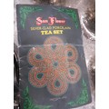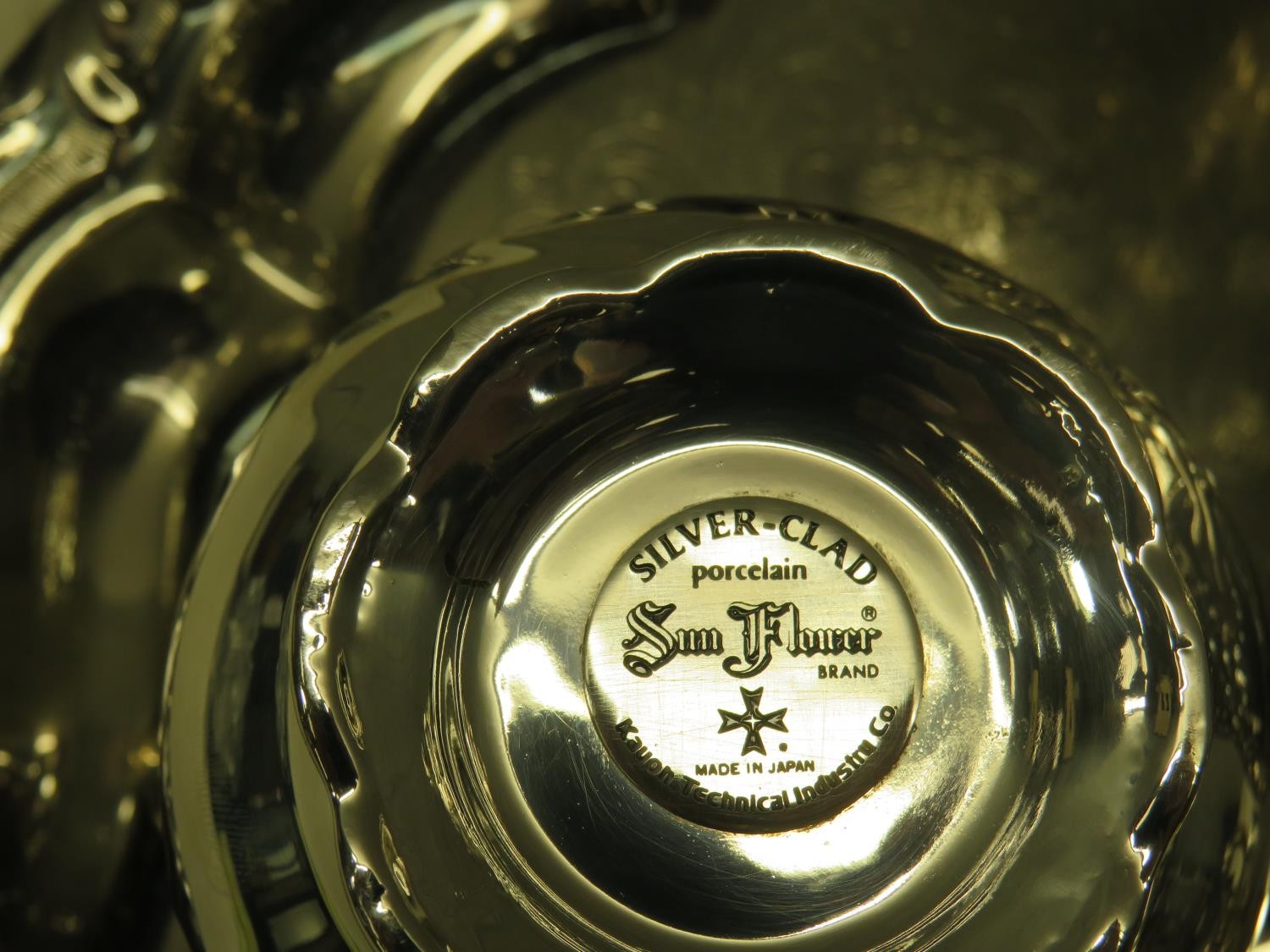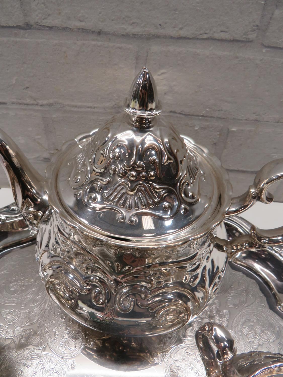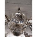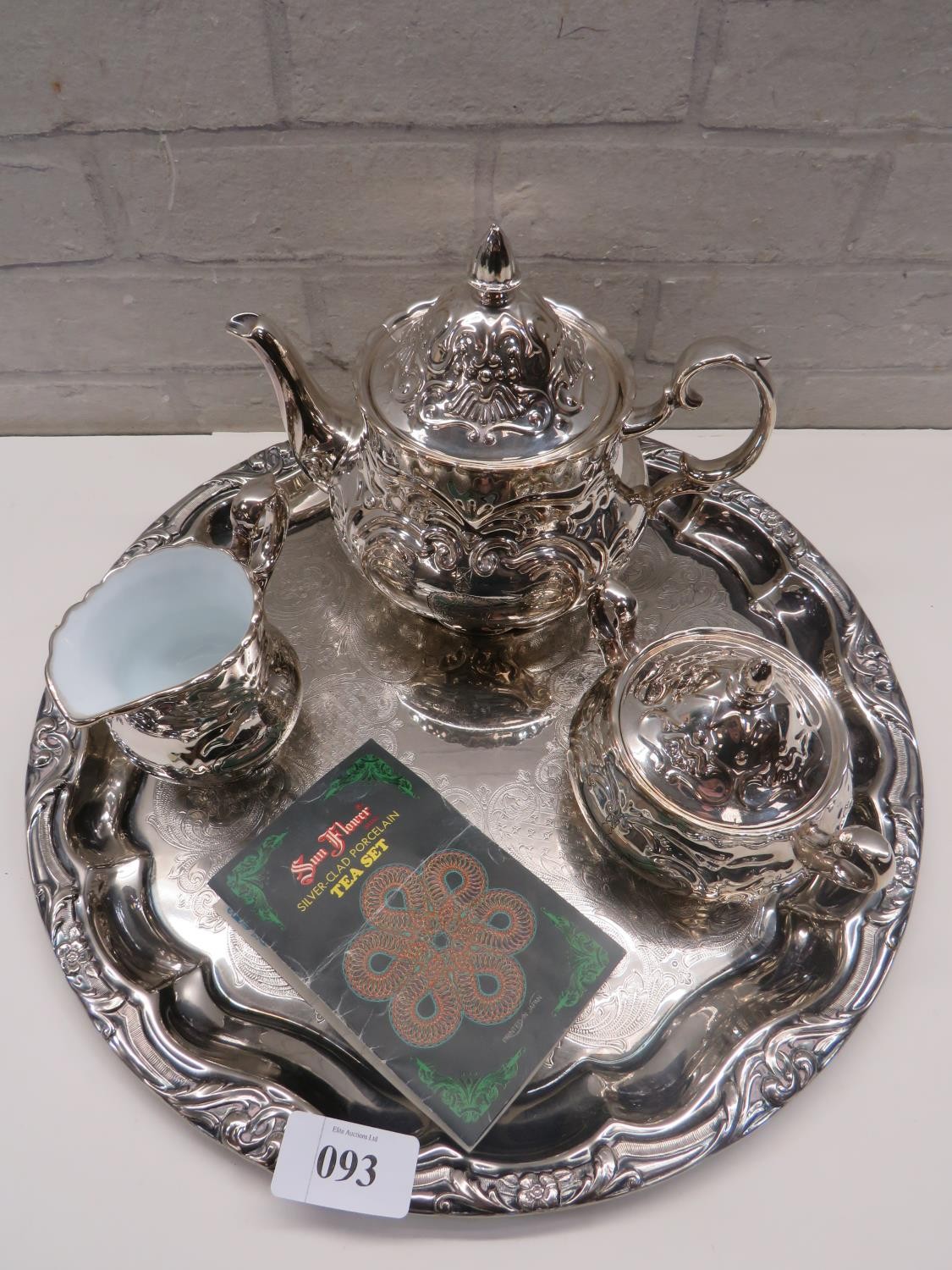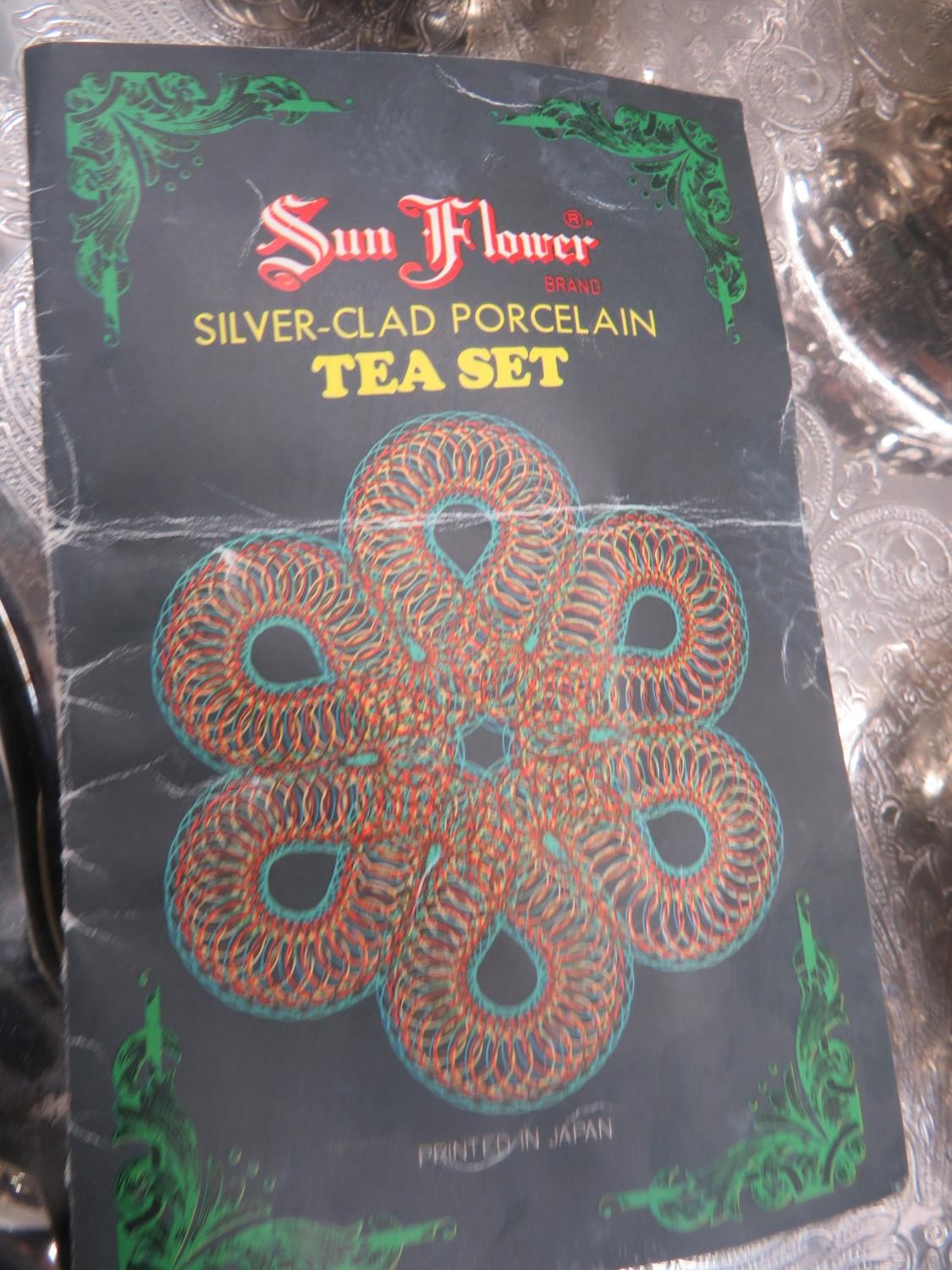 SILVER CLAD PORCELAIN SUN FLOWER BRAND JAPANESE TEAPOT, SUGAR BOWL & MILK JUG WITH A SILVER PLATED SERVING TRAY