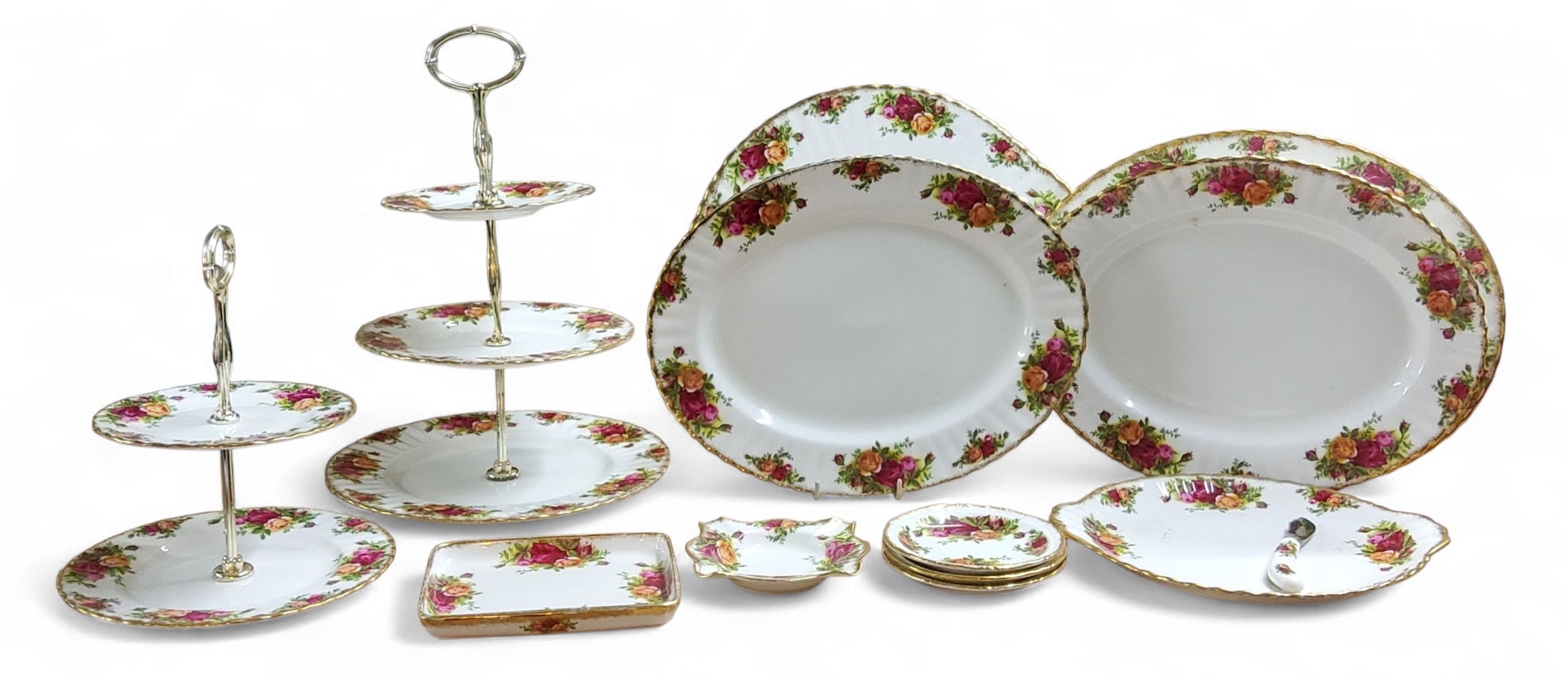 A Royal Albert Old Country Roses three tier cake stand; another, two tier; a large serving plate; others; trinket dishes; etc