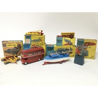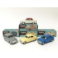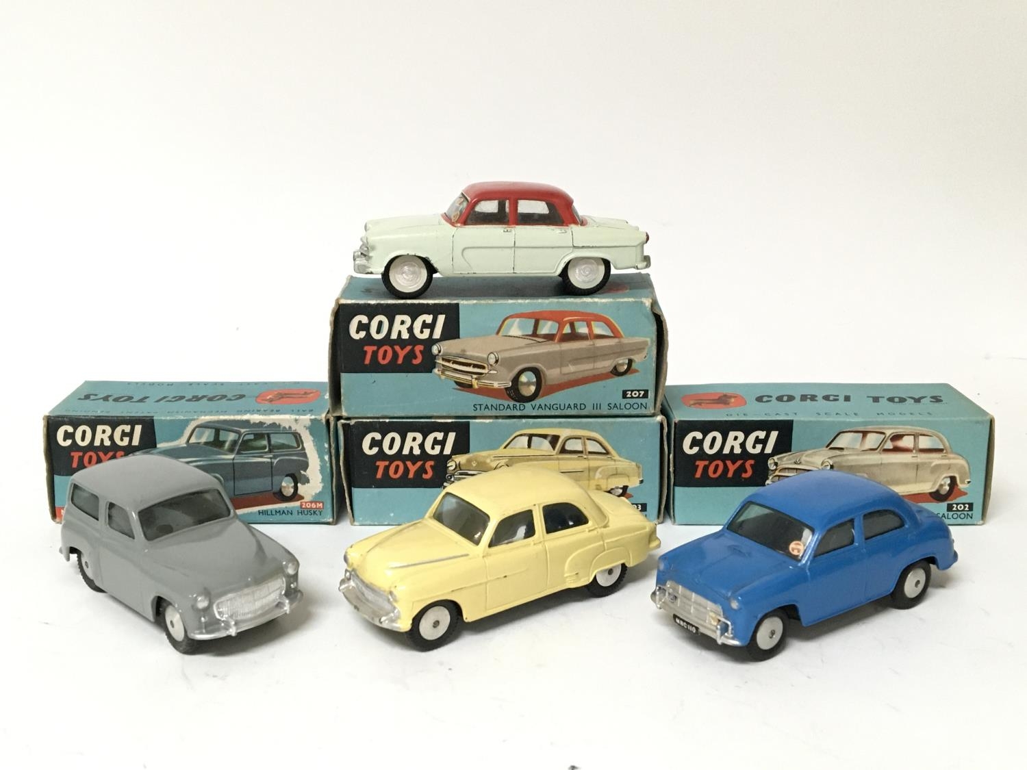 Corgi toys, #202 Morris Crowley saloon, #206M Hillman Husky, #207 Standard Vanguard saloon and #203 Vauxhall Velux saloon, boxed