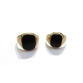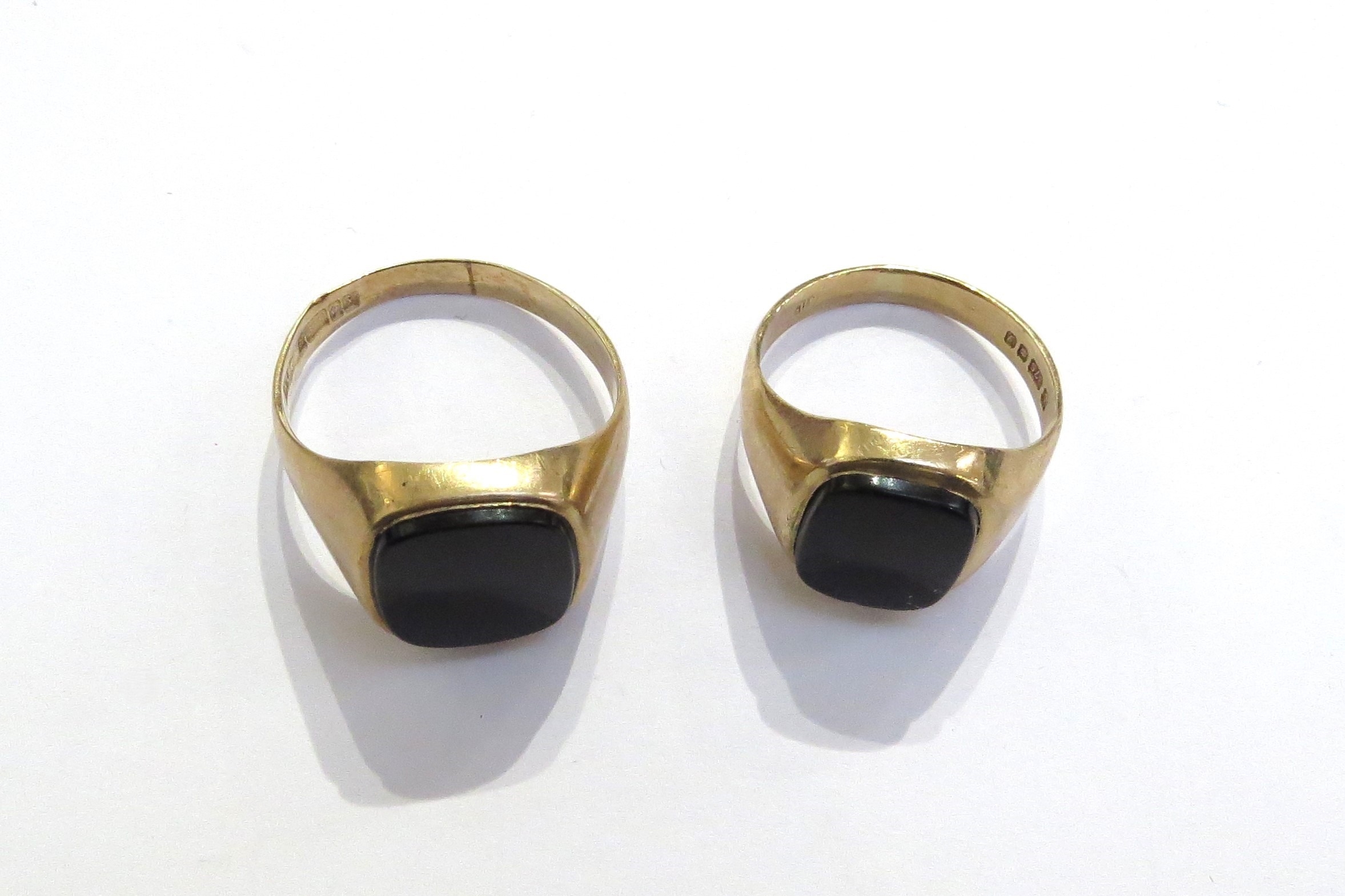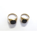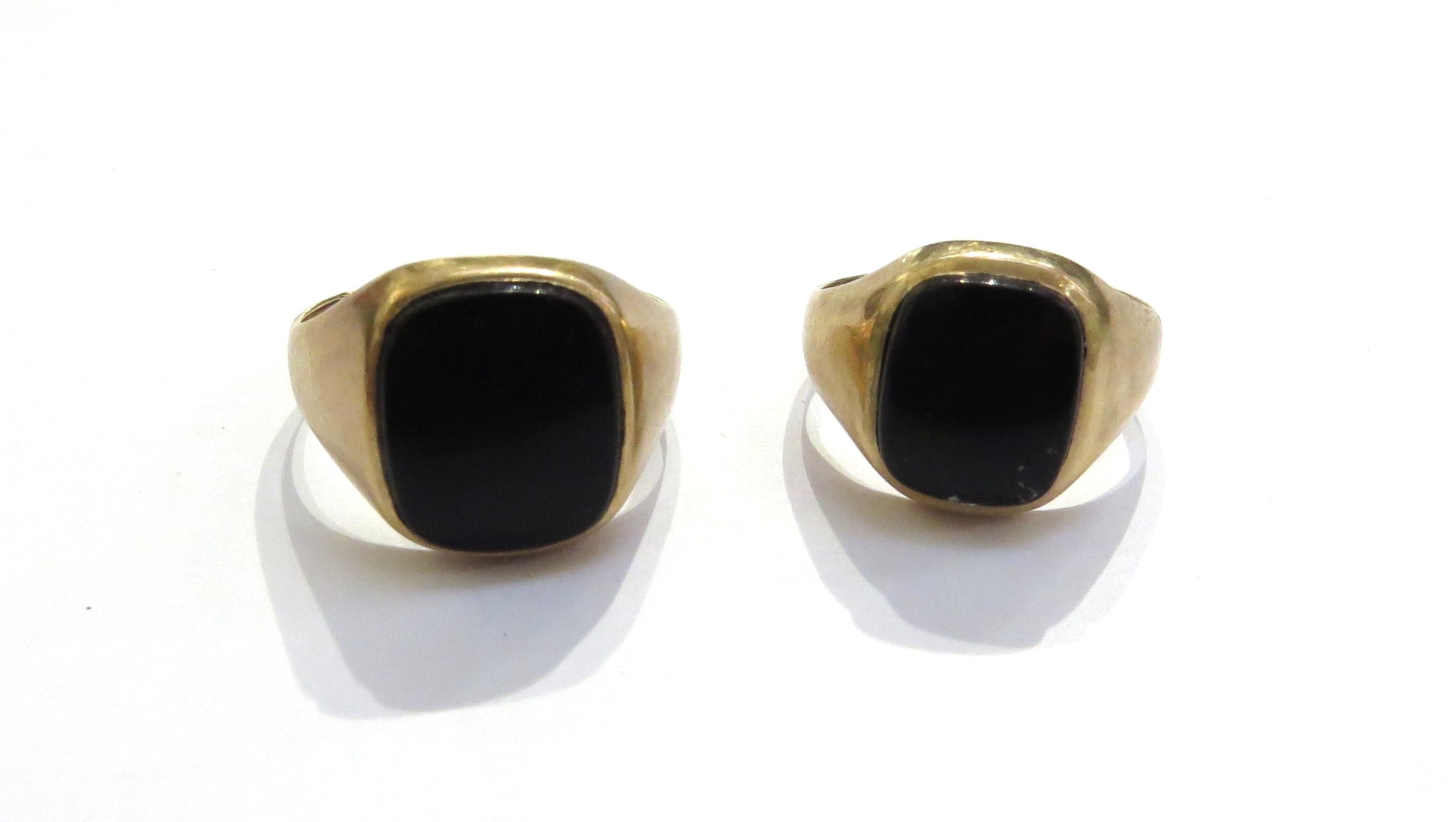 Two 9ct gold signet rings both with oval black onyx, sizes U/V, slightly bent and P/Q, 8.1g total