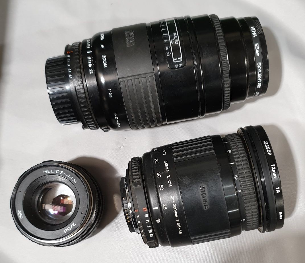 A Sigma 75-200mm zoom lens, a Helios-44M lens and a Sigma 28-200mm zoom lens.