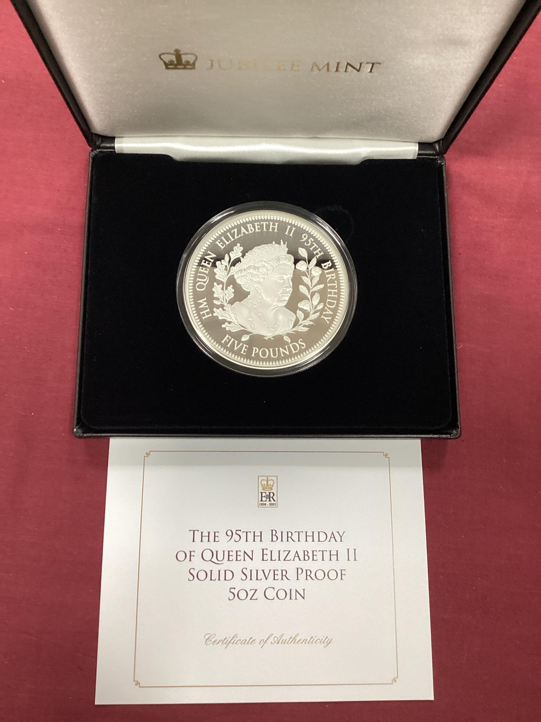 2021 QEII 95th Birthday Silver Proof Five Ounce Coin, cased with a certificate of authenticity.