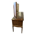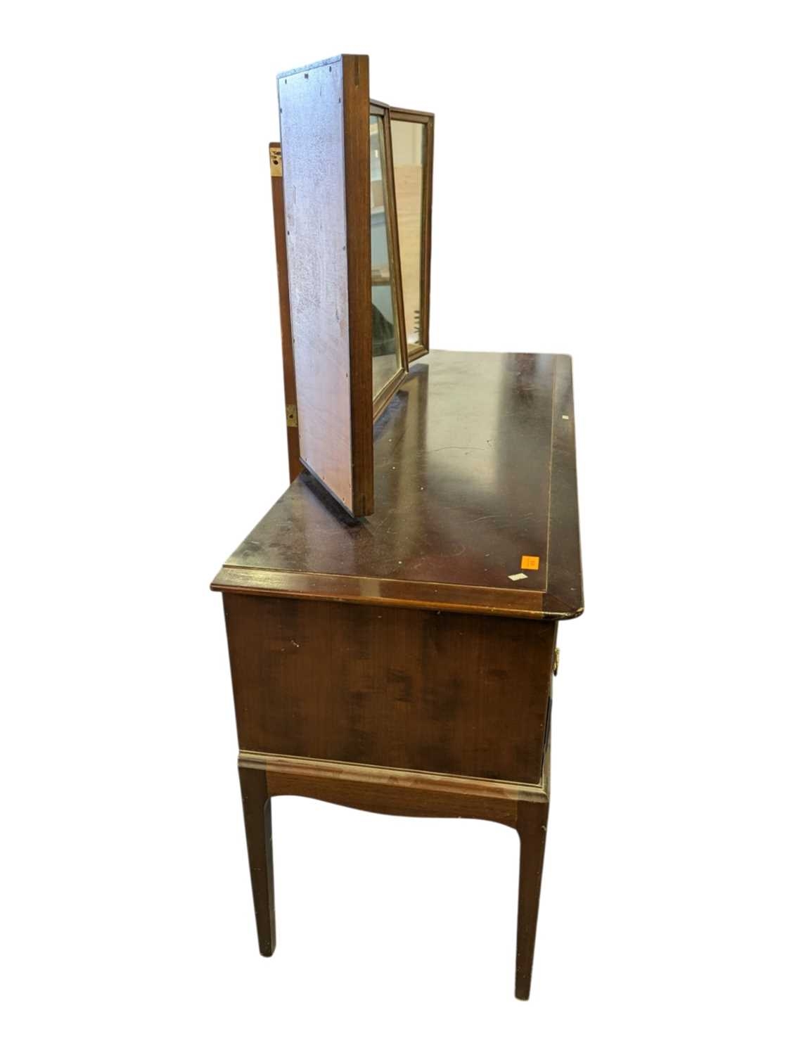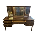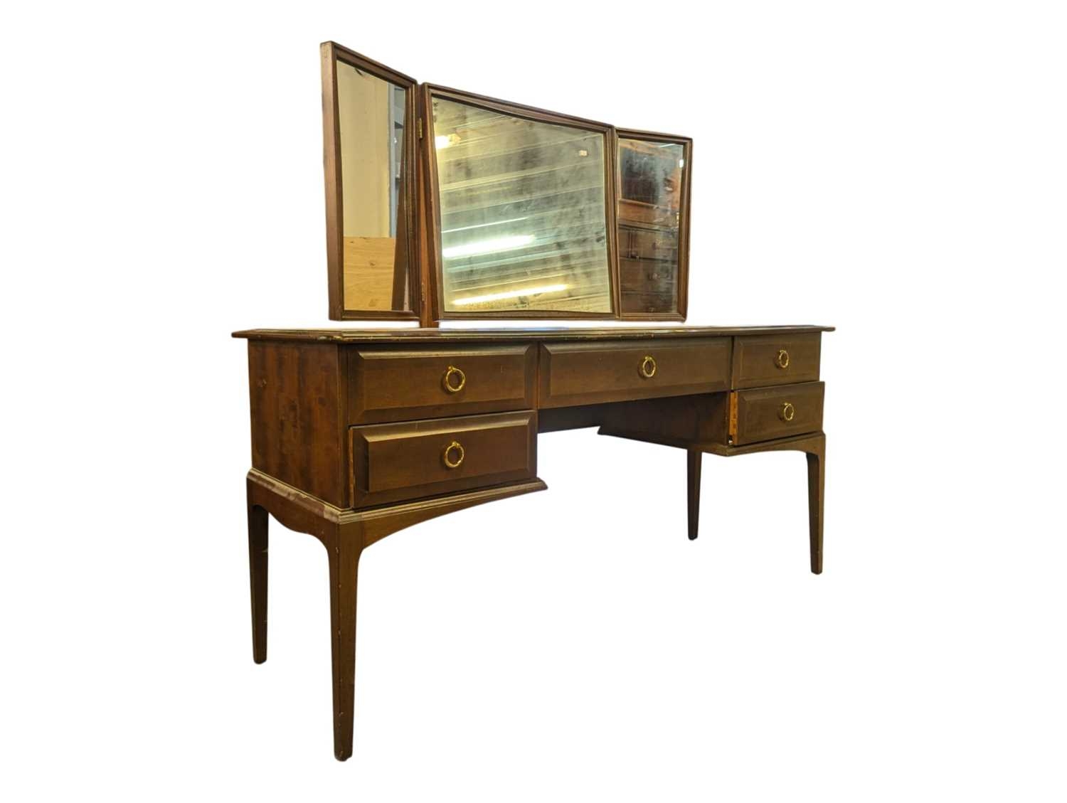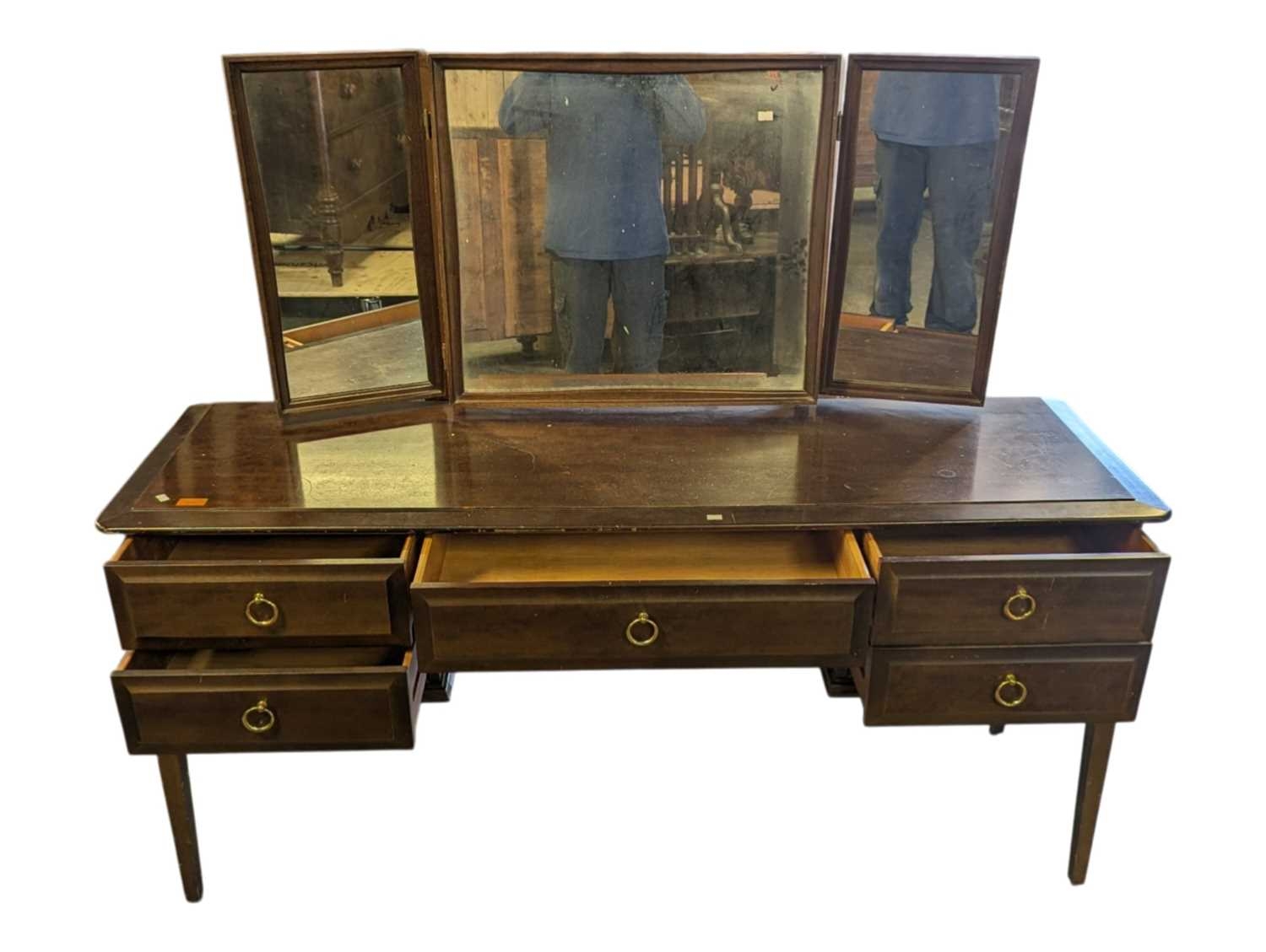 Stag Furniture - Minstrel Range - vintage 20th century mahogany dressing table. Having knee hole centre with drawer above, flanked by a bank of to drawers with ring pull handles. Triptych mirror above raised on tapering legs. Measures approx: 131x153x50cm