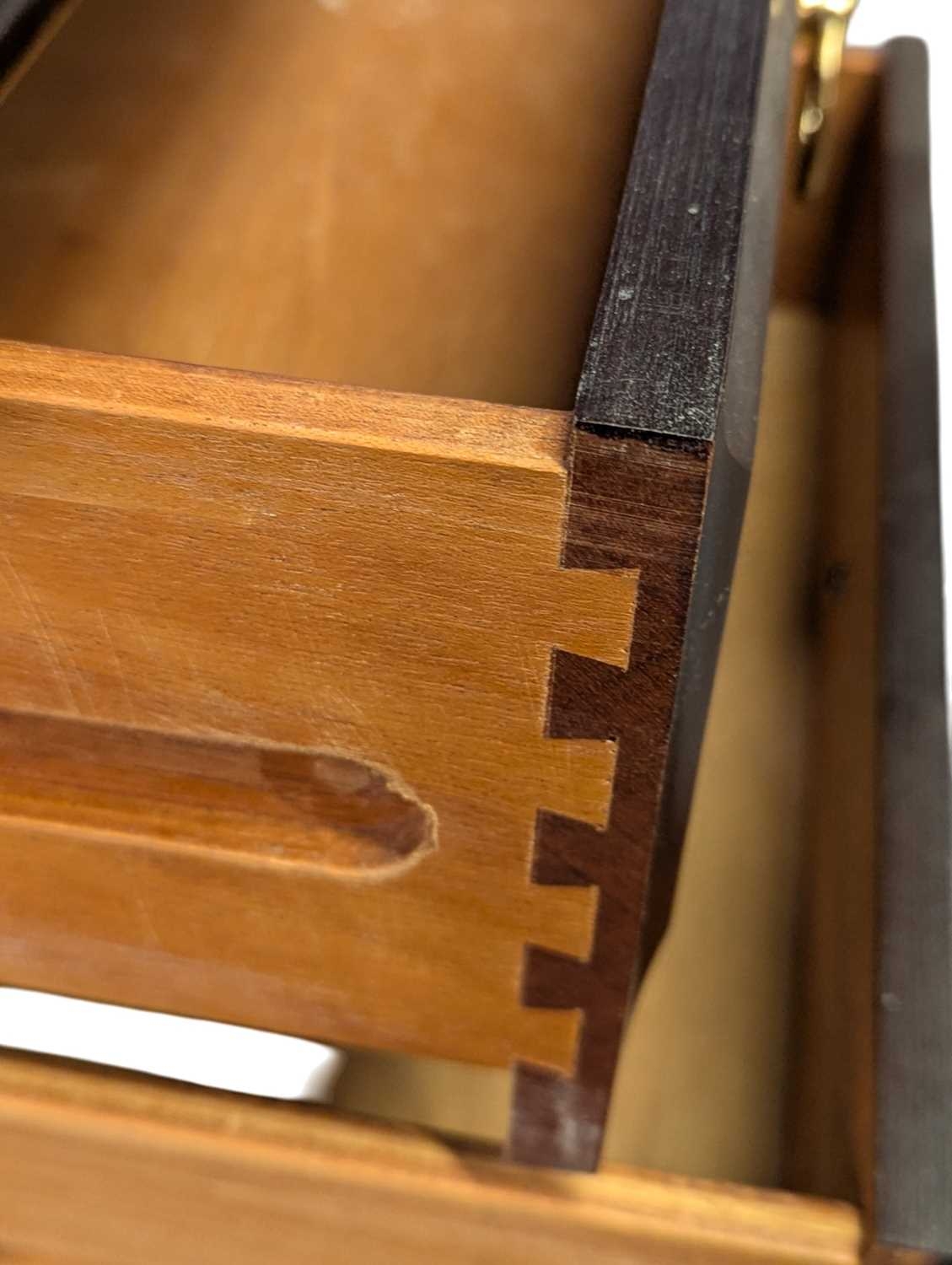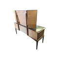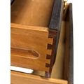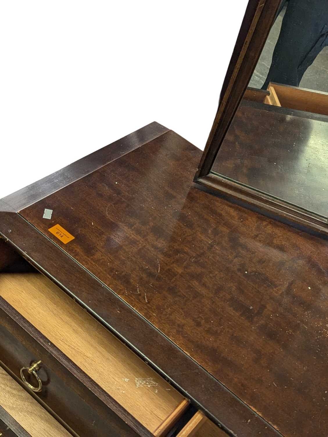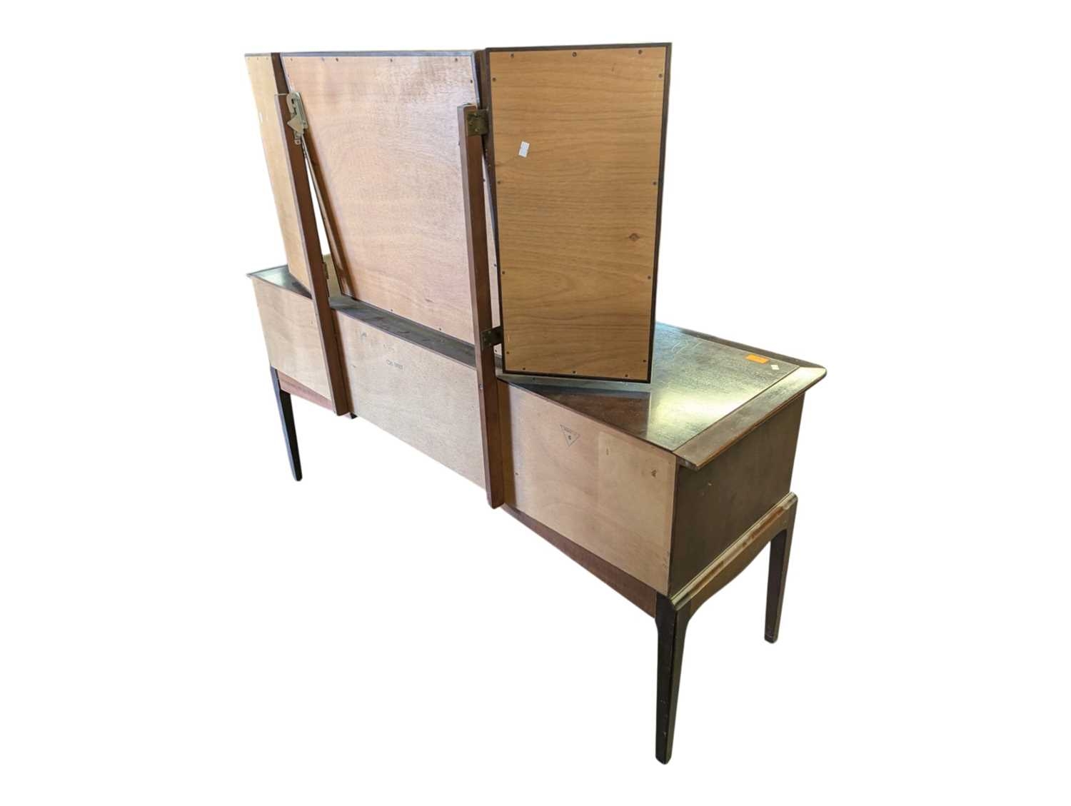 Stag Furniture - Minstrel Range - vintage 20th century mahogany dressing table. Having knee hole centre with drawer above, flanked by a bank of to drawers with ring pull handles. Triptych mirror above raised on tapering legs. Measures approx: 131x153x50cm