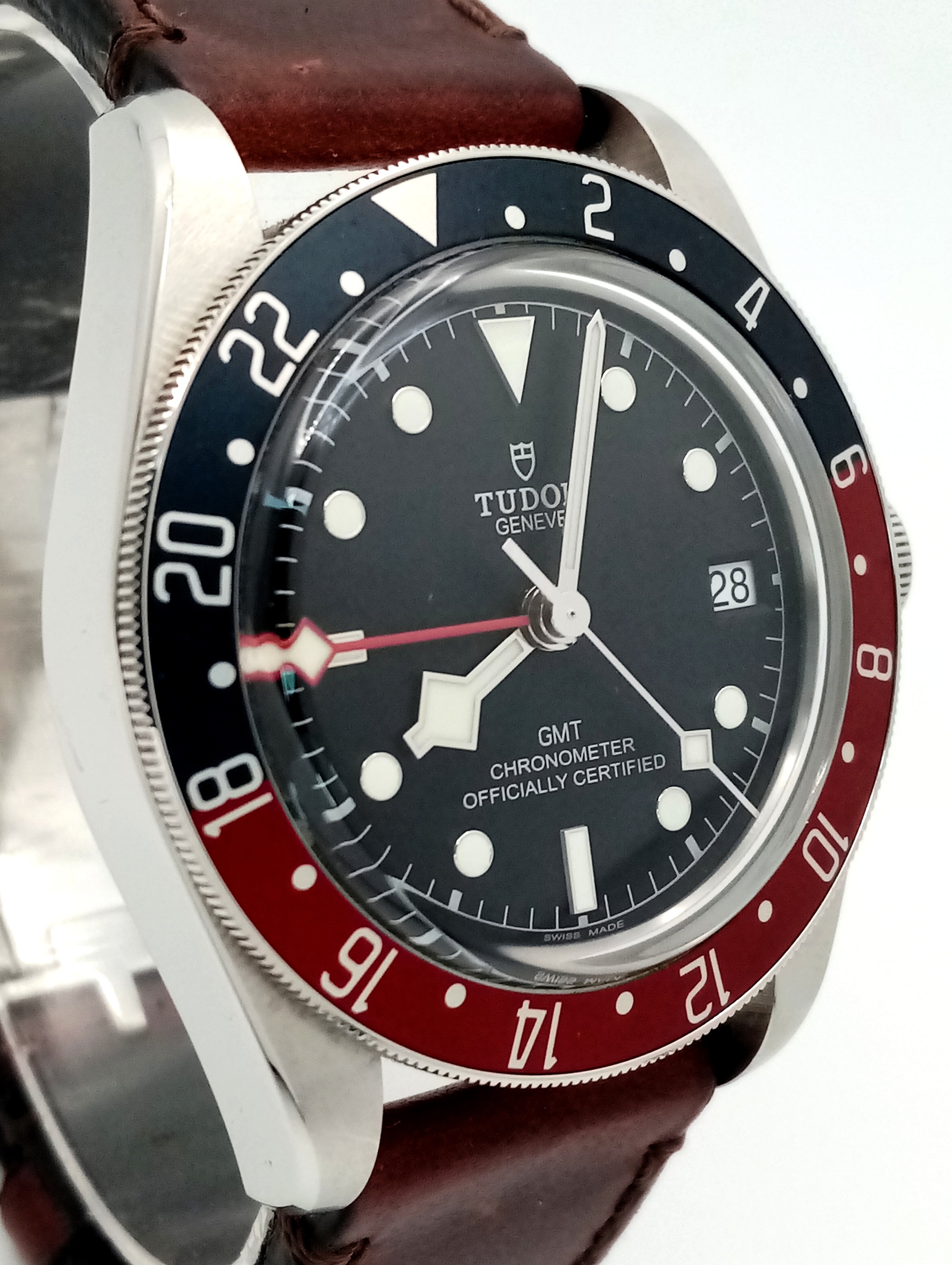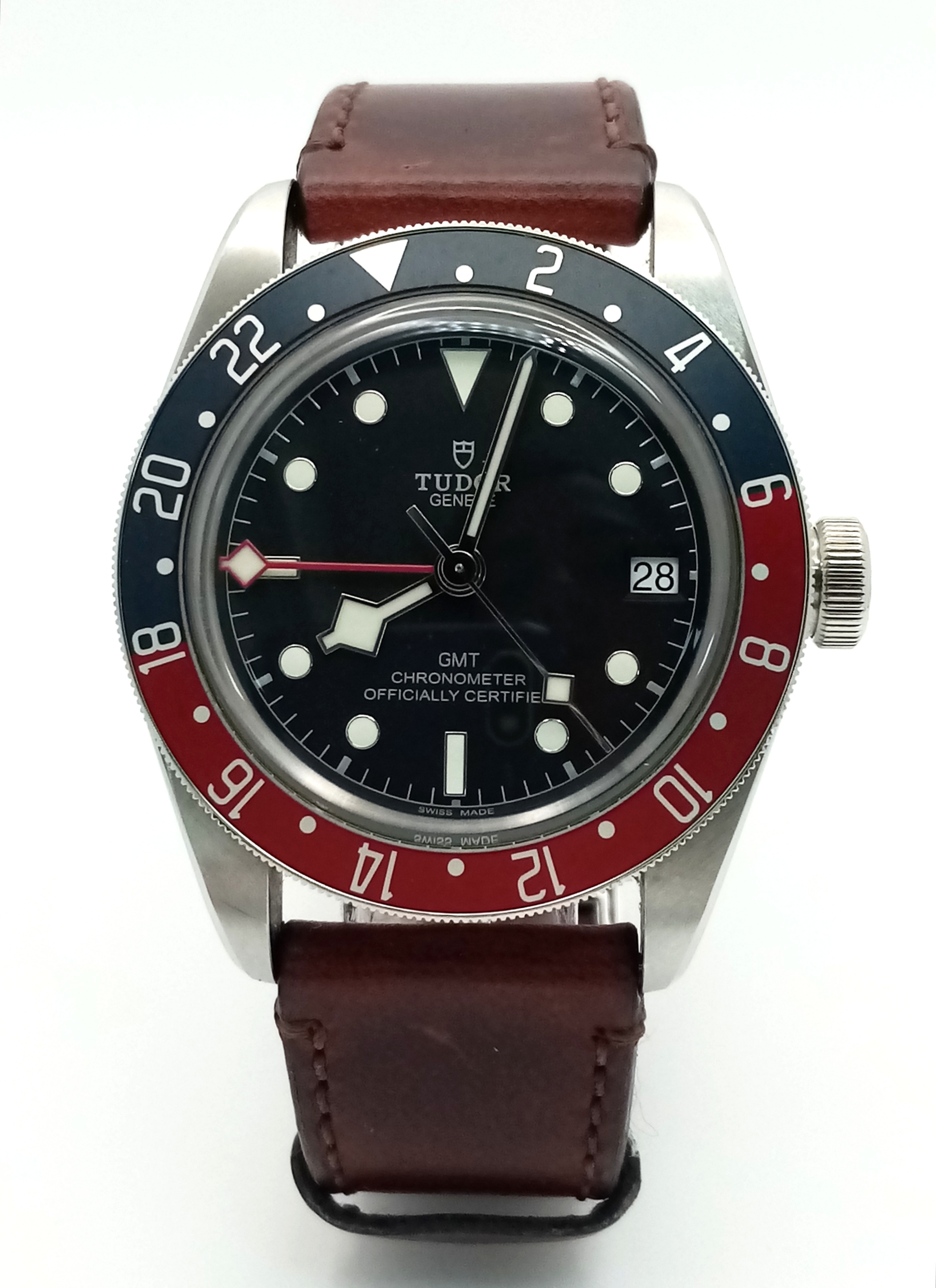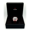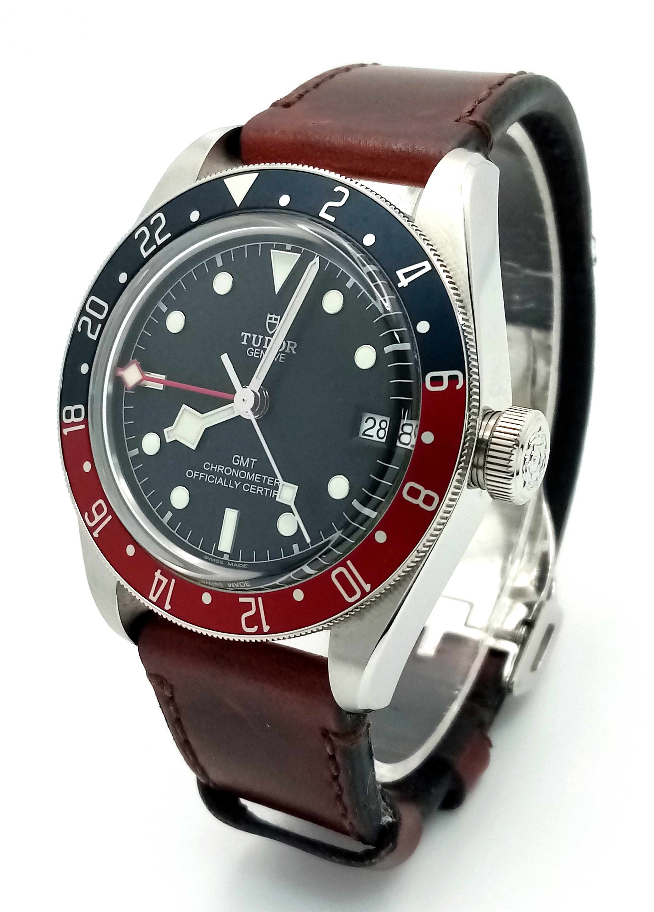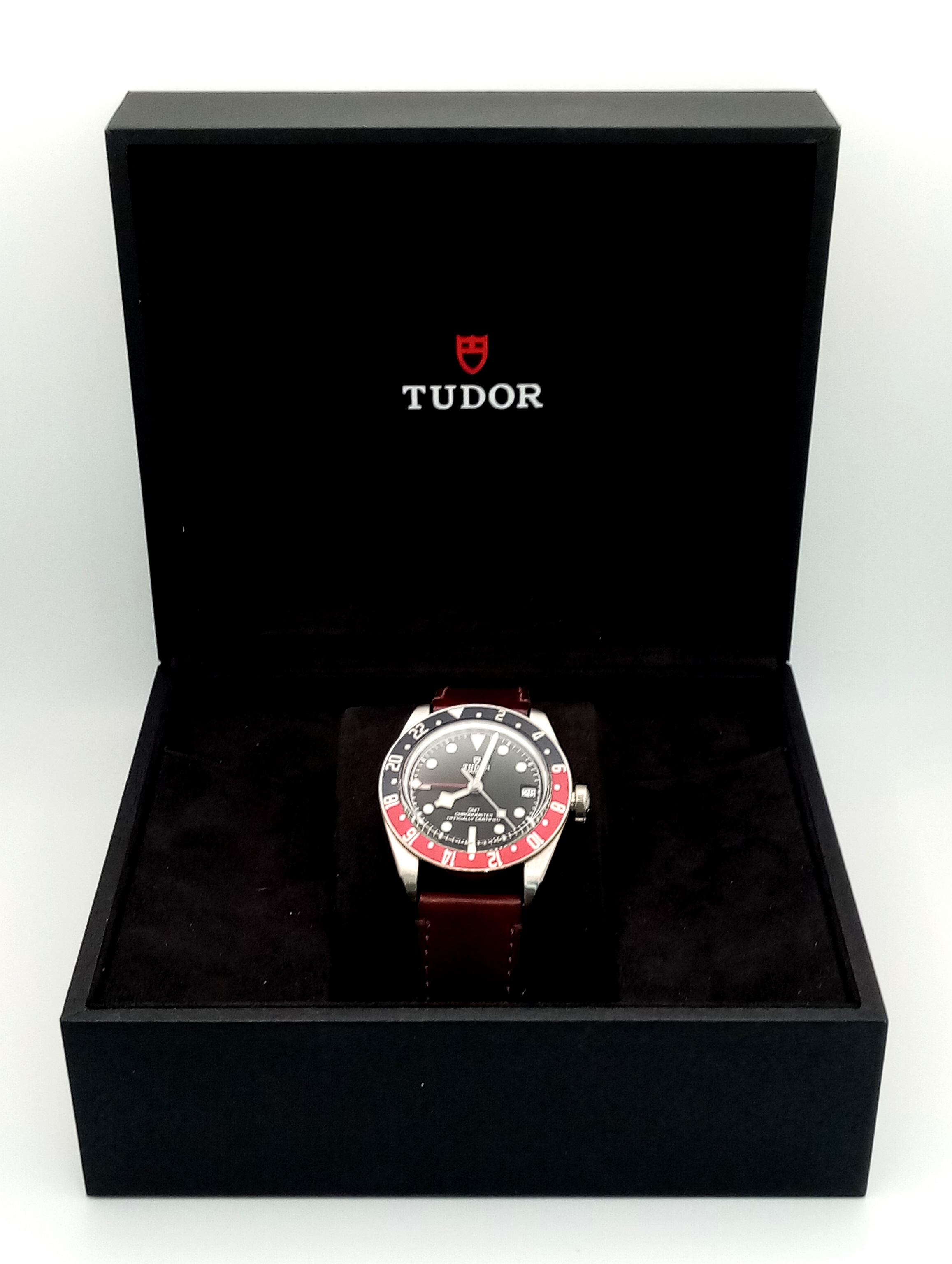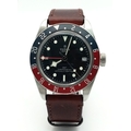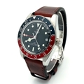 A Tudor GMT Automatic Gents Watch. Model 79830RB. Brown leather strap. Stainless steel case - 42mm. Black dial with date window. Rotating 'Pepsi' Bezel. In good condition and working order. Comes with box and papers. . REF: STK024710