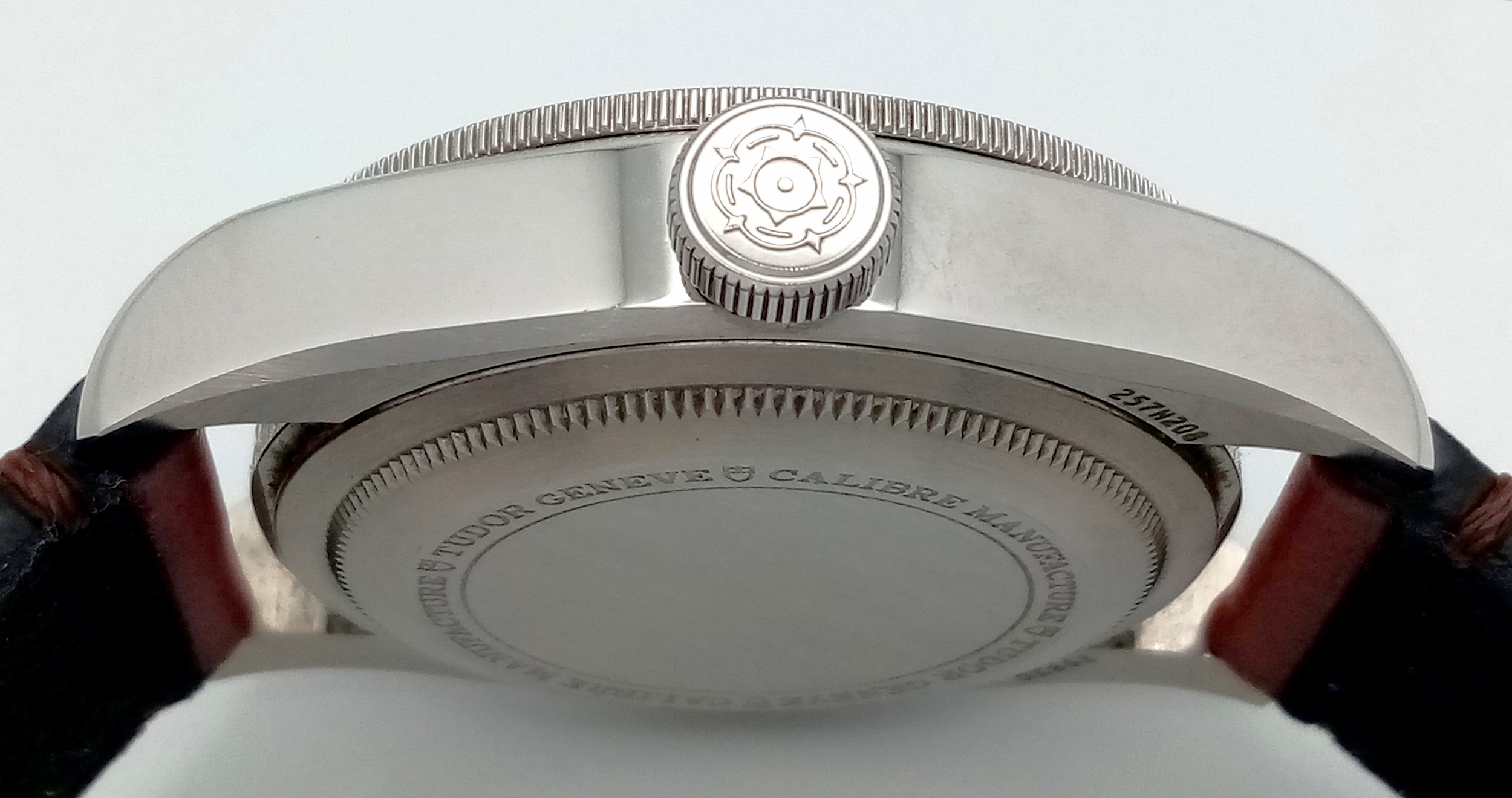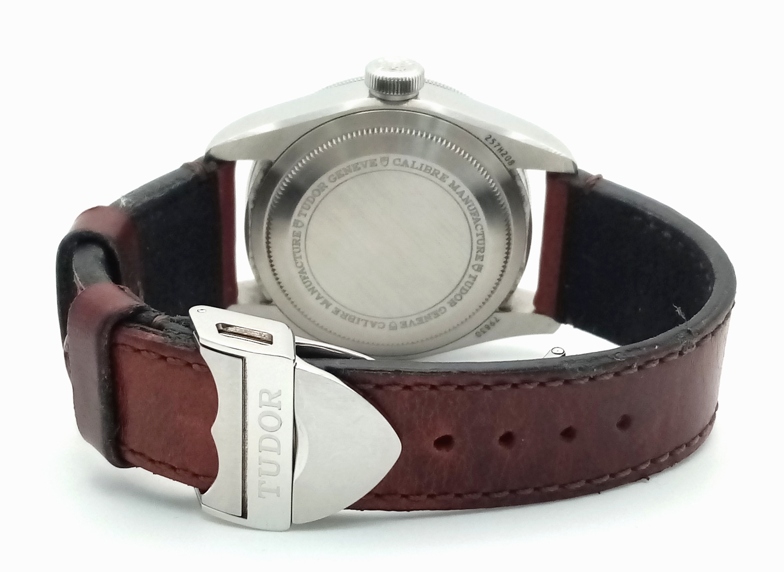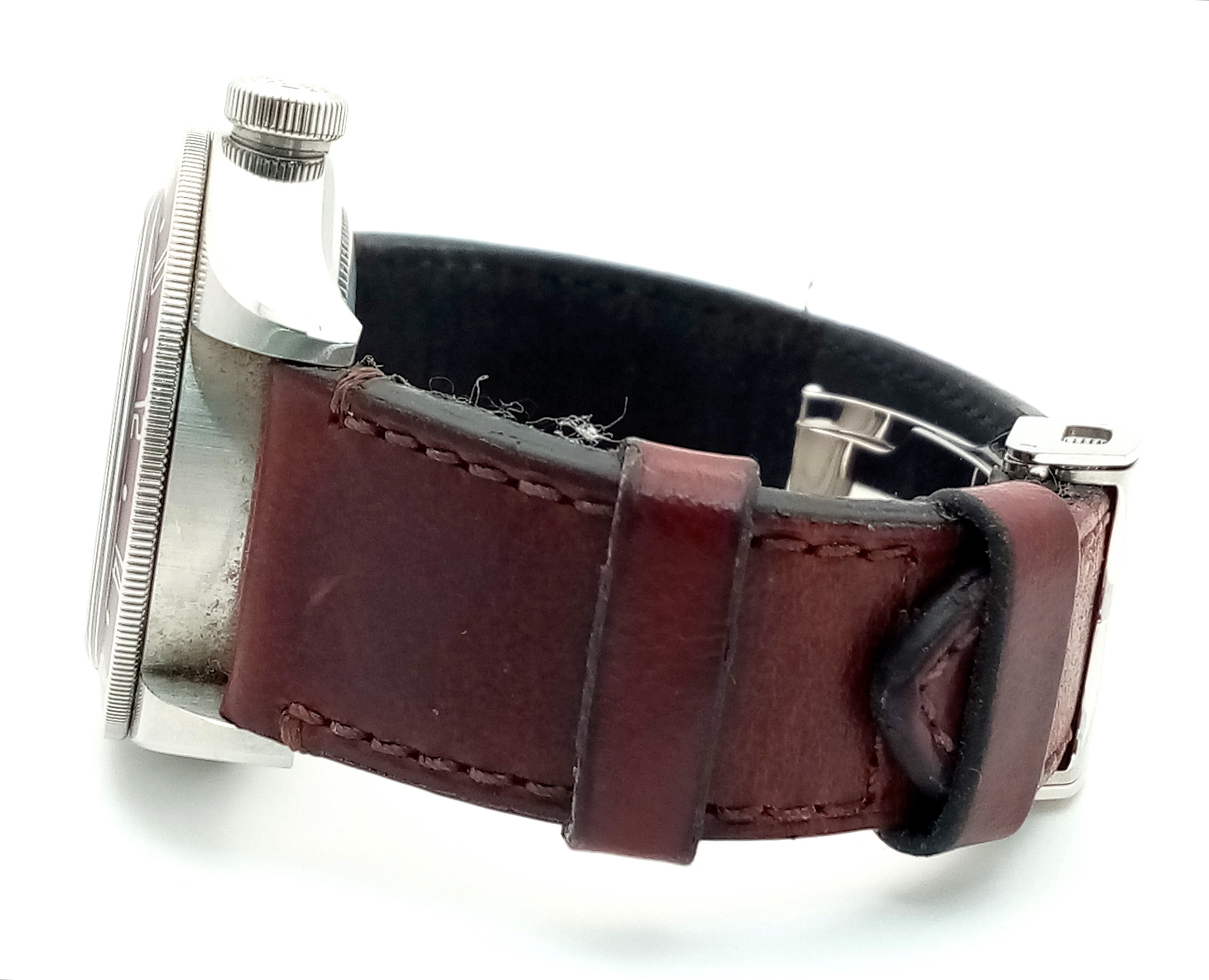A Tudor GMT Automatic Gents Watch. Model 79830RB. Brown leather strap. Stainless steel case - 42mm. Black dial with date window. Rotating 'Pepsi' Bezel. In good condition and working order. Comes with box and papers. . REF: STK024710