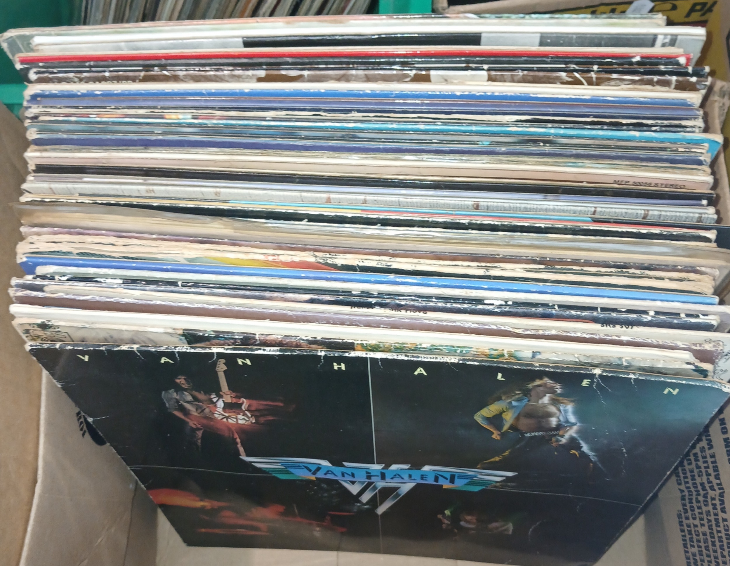 A box of LPs, mixed genres, including Van Halen, Byrds, Pink Floyd, Gerry Rafferty, ELO, BTO, Moody Blues, Cream, Johnny Cash, Jethro Tull, film soundtracks etc