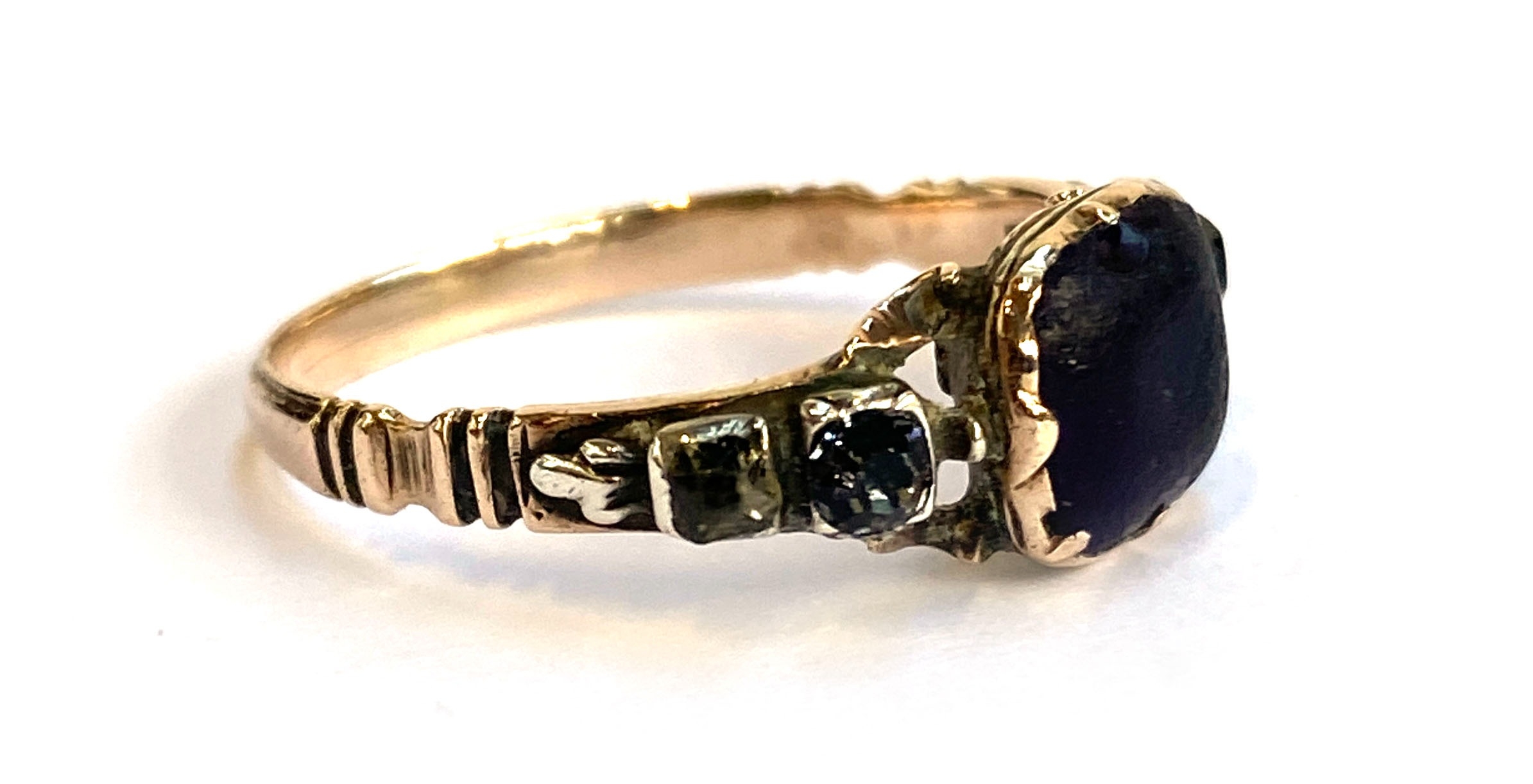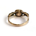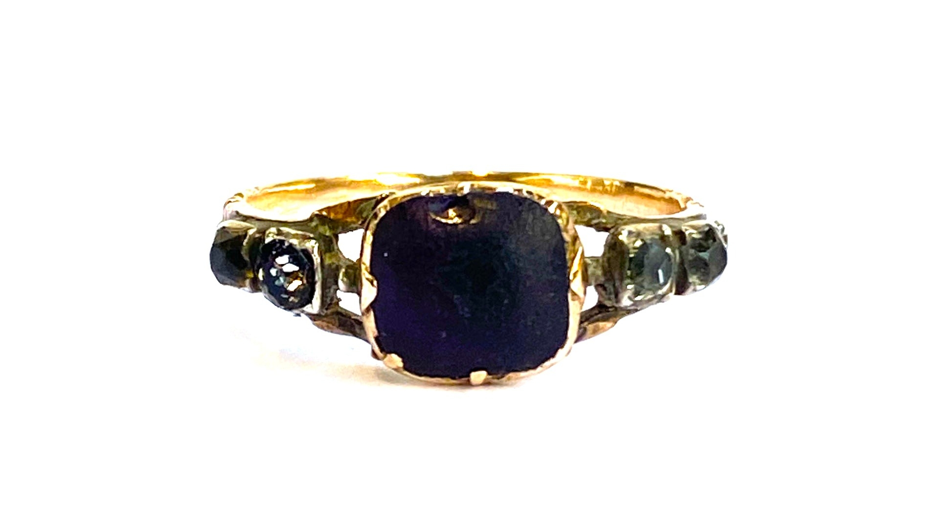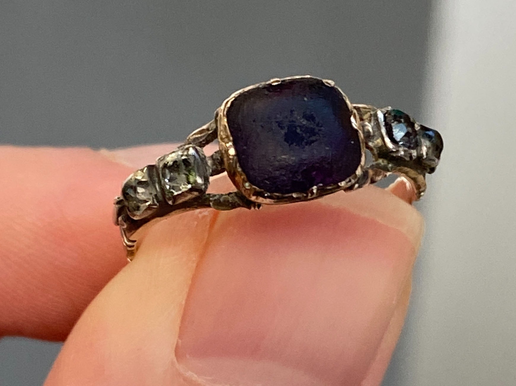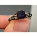 A late 18th century Georgian gold and silver ring set with an amethyst paste in basket back setting flanked by rock crystal and paste, size P 1/2, 2.2g
