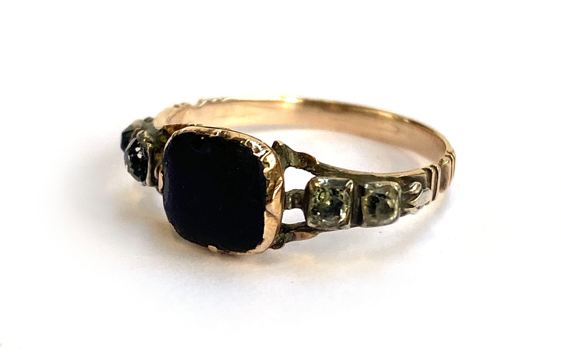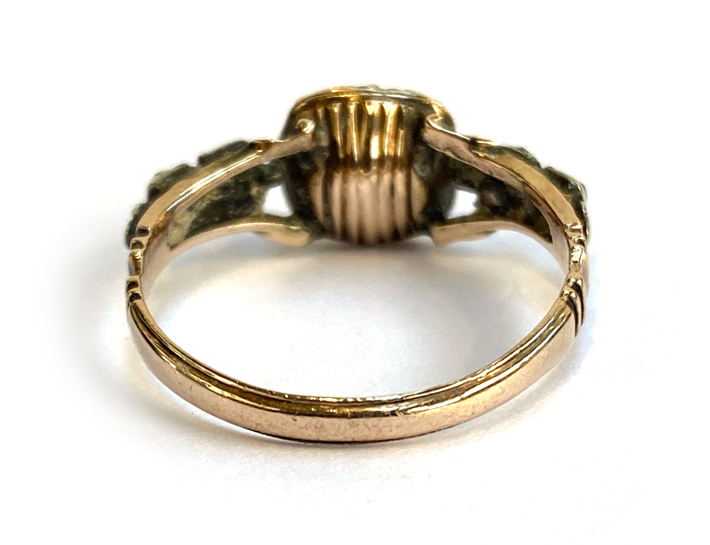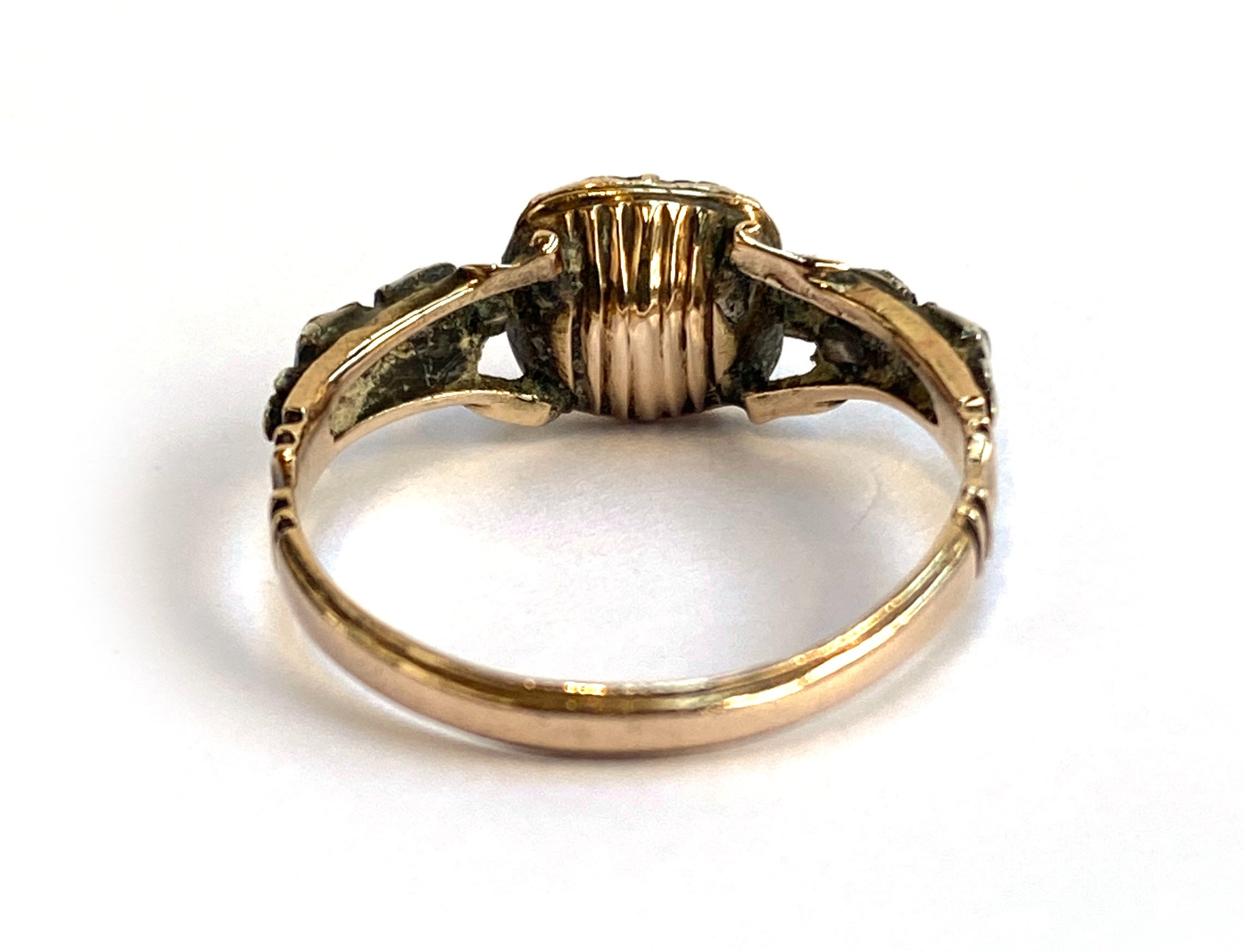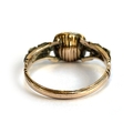 A late 18th century Georgian gold and silver ring set with an amethyst paste in basket back setting flanked by rock crystal and paste, size P 1/2, 2.2g