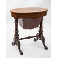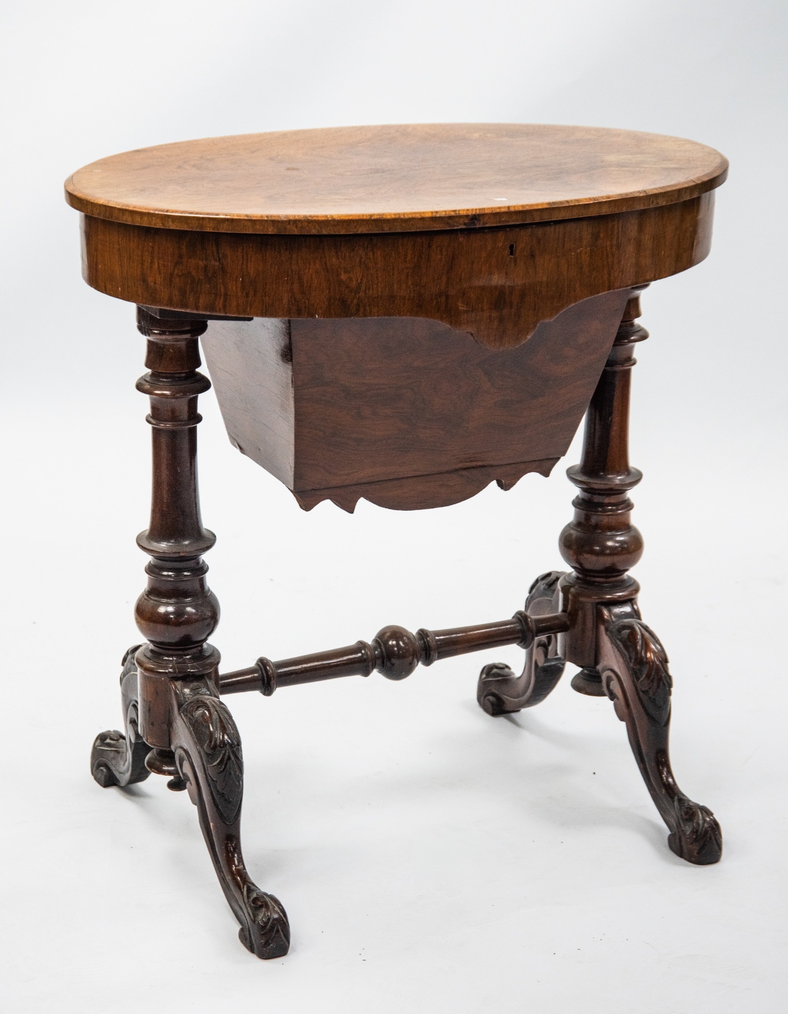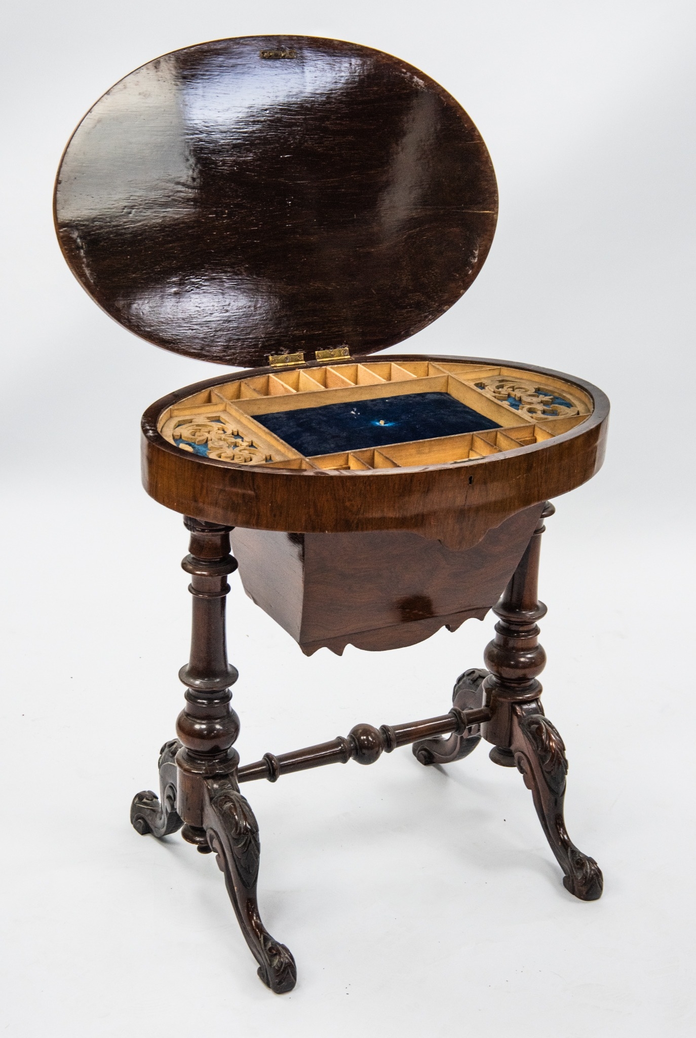NINETEENTH CENTURY ROSEWOOD SEWING TABLE, the oval top enclosing a fitted interior with pierced covers to the end compartments and central well beneath the removable blue plush cover, set above a shaped frieze, and raised on turned and carved end supports with leaf capped downswept supports tied by a turned stretcher, 26 ½” (67.3cm) high, 26” x 18 ½” (66cm x 47cm), losses and later pieces to the interior