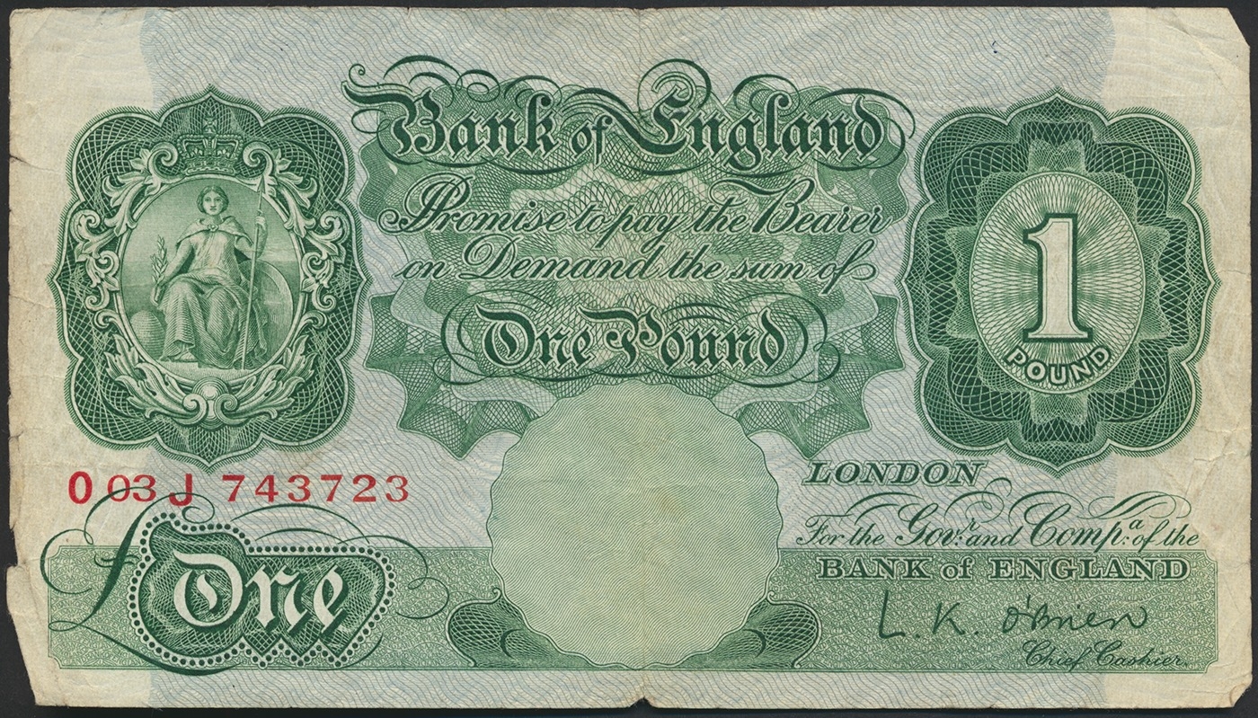 L.K. O'Brien. 1955 £1 O03J 743723 error, missing top right serial number with partial two digit serial number printed at 45 degree angle on top left of reverse, near very fine. (BNYB E3b) (N)