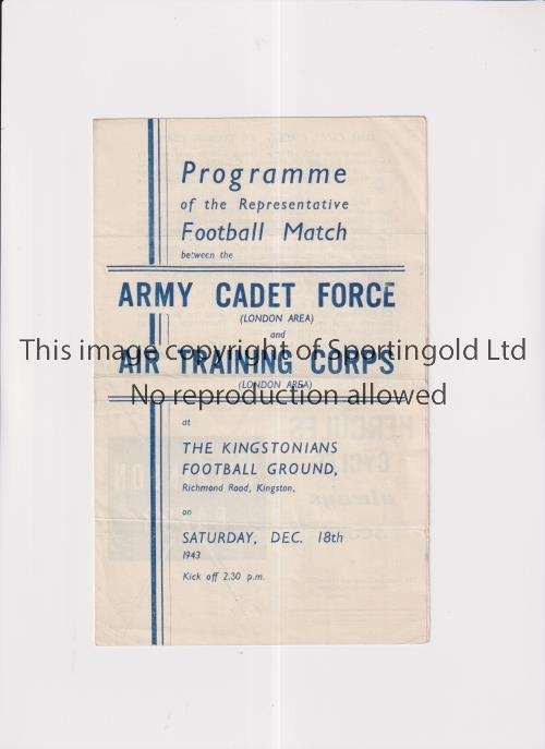SERVICES FOOTBALL AT KINGSTONIAN F.C. 1943 Programme for Army Cadet Force (London) v Air Training Corps (London) 18/12/1943, slightly creased and scores entered. Generally good