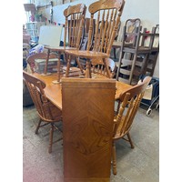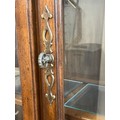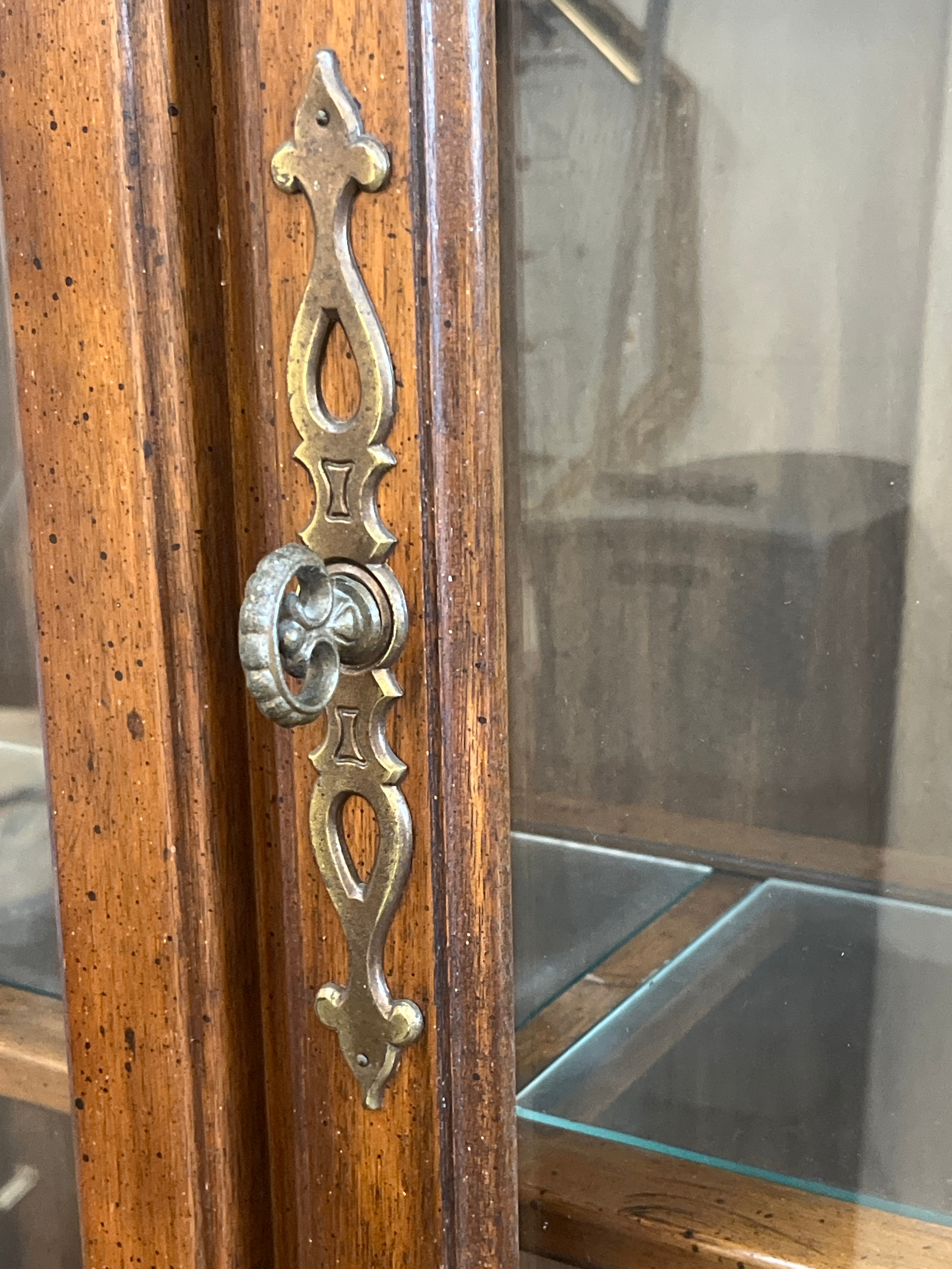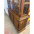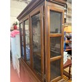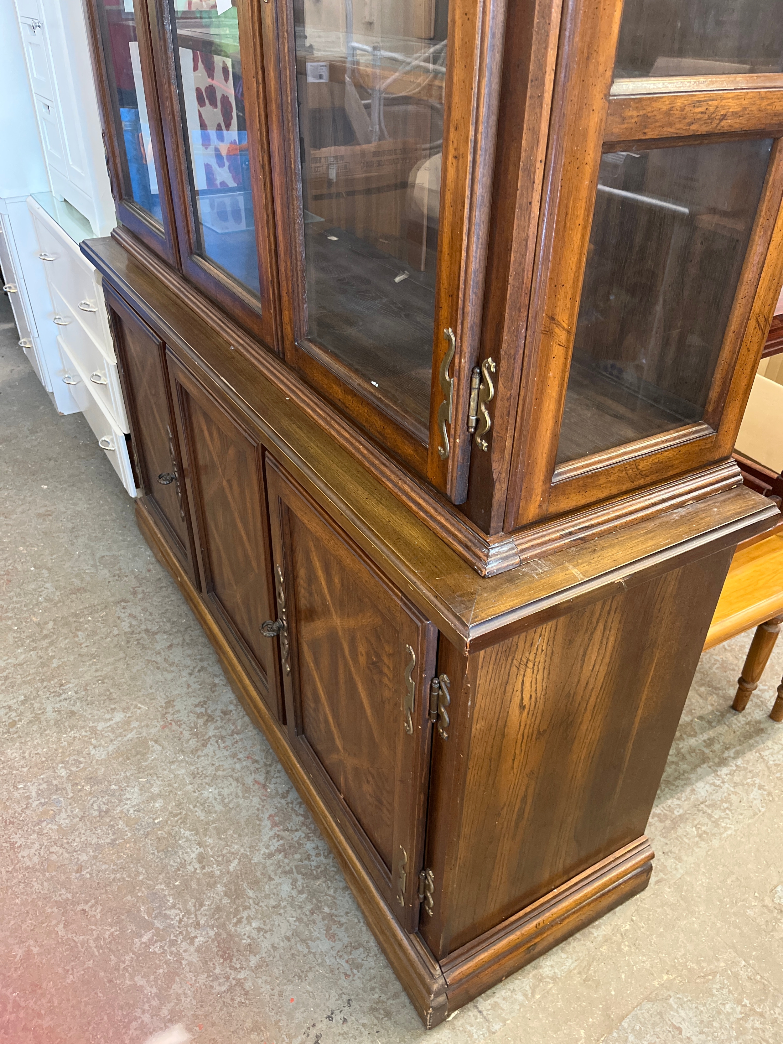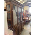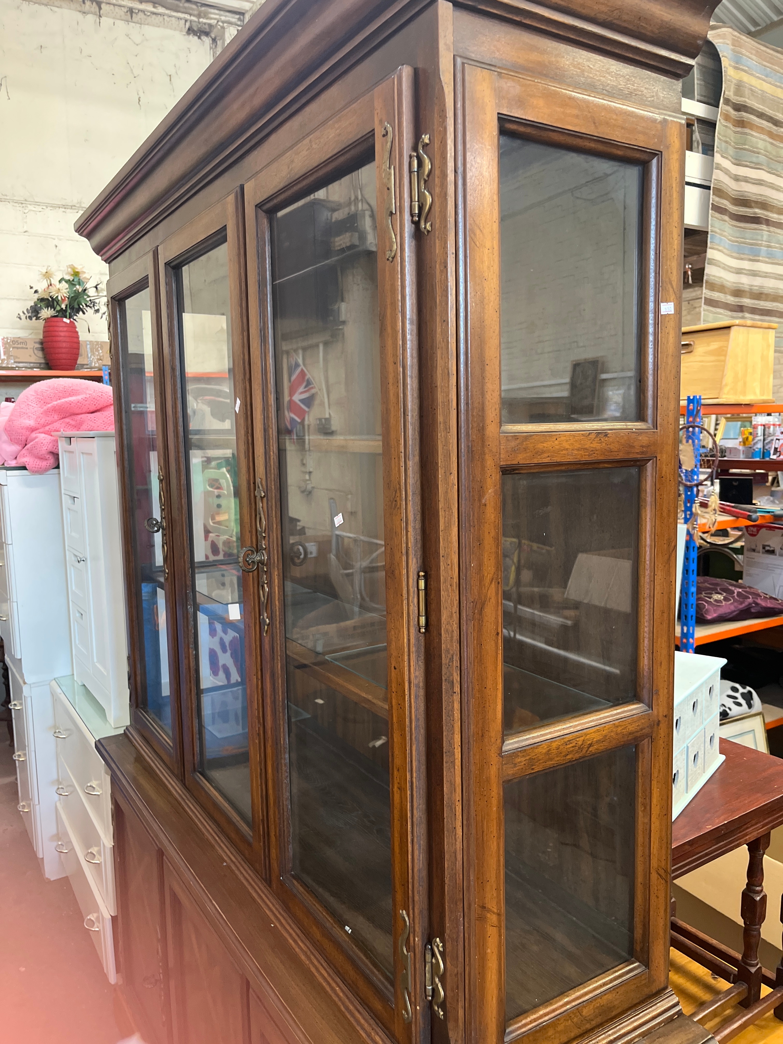 Large display cabinet with glass doors and 3 lower cupboards inside concealing a cutlery tray, decorative medieval style handles