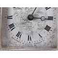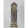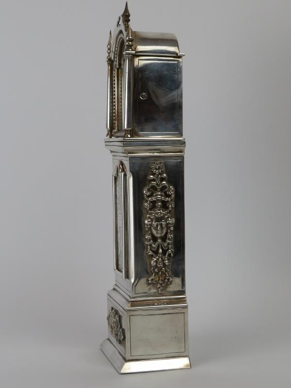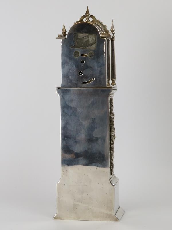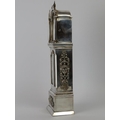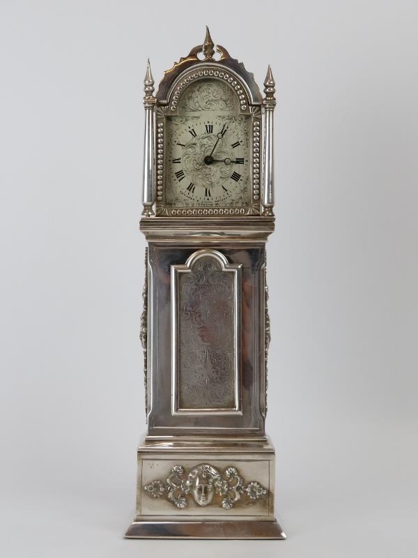 A Victorian silver plated miniature grandfather clock by Edwards & Jones of Regent Street, London. With foliate engraved Roman numeral dial. Key and winder included. 30.6 cm height.