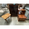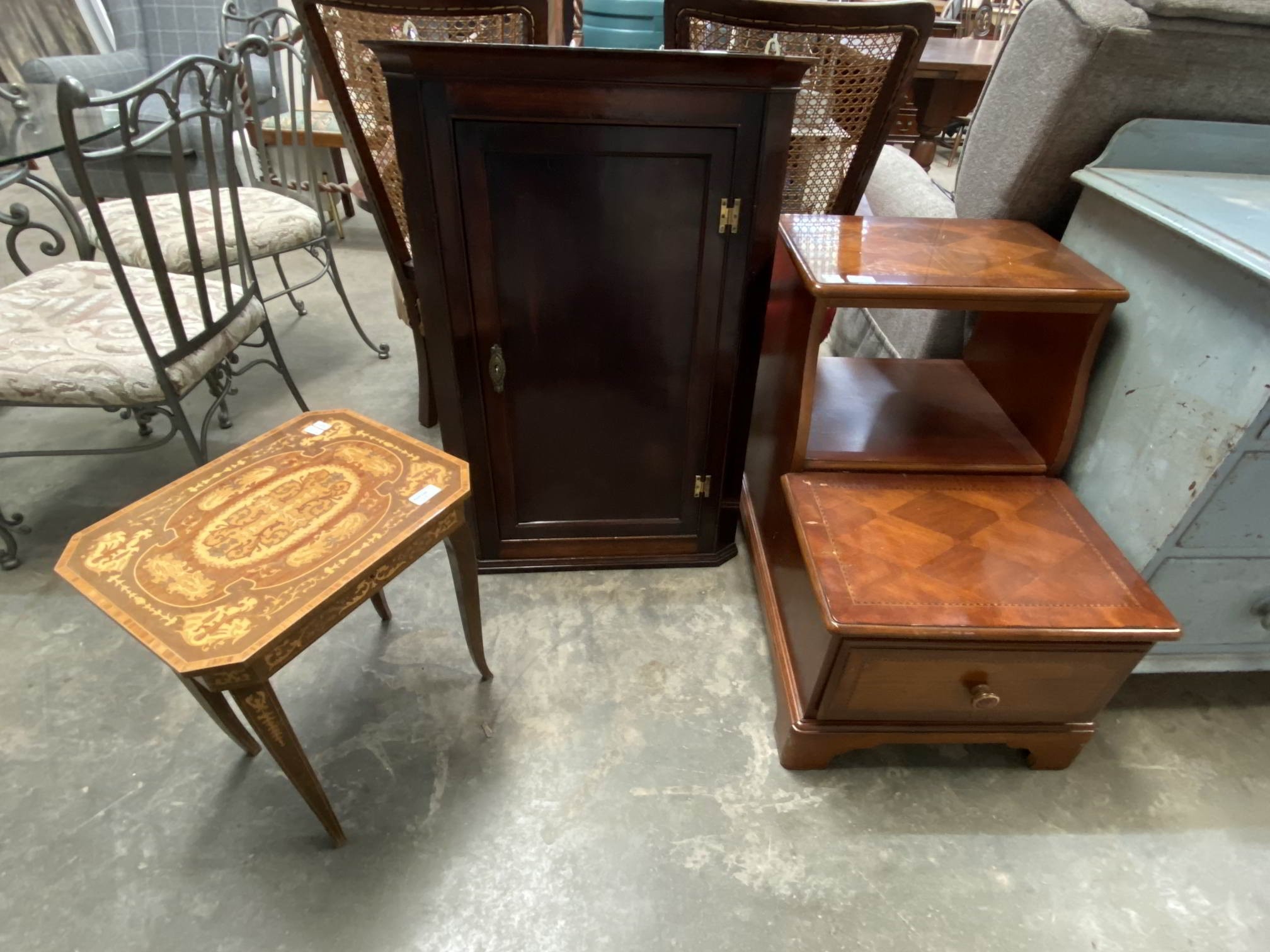 Georgian oak corner cupboard 93H 65W 31D, Italian musical occasional table 47H 41W 33D and a yew wood telephone table 67H 49W 70D