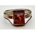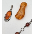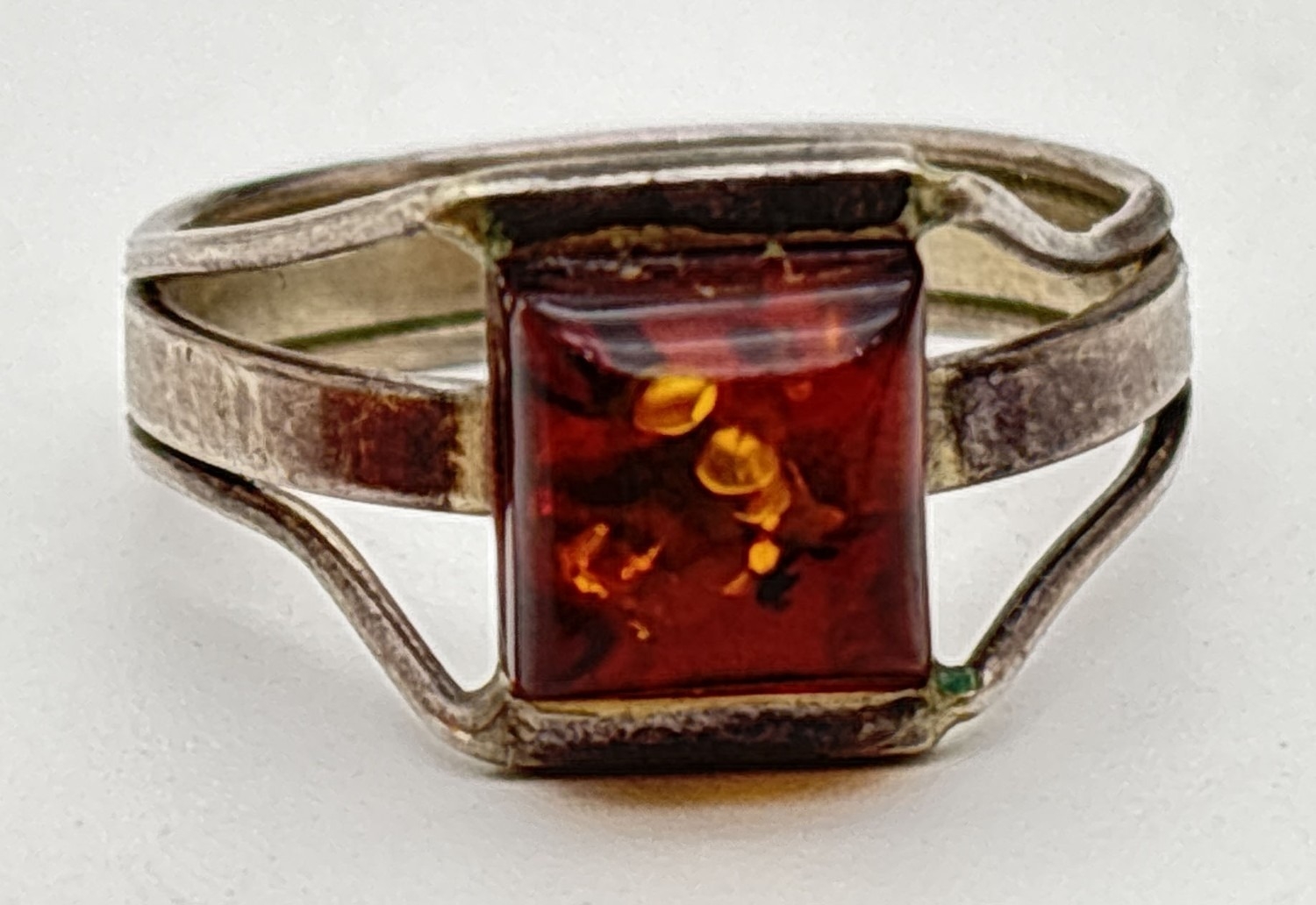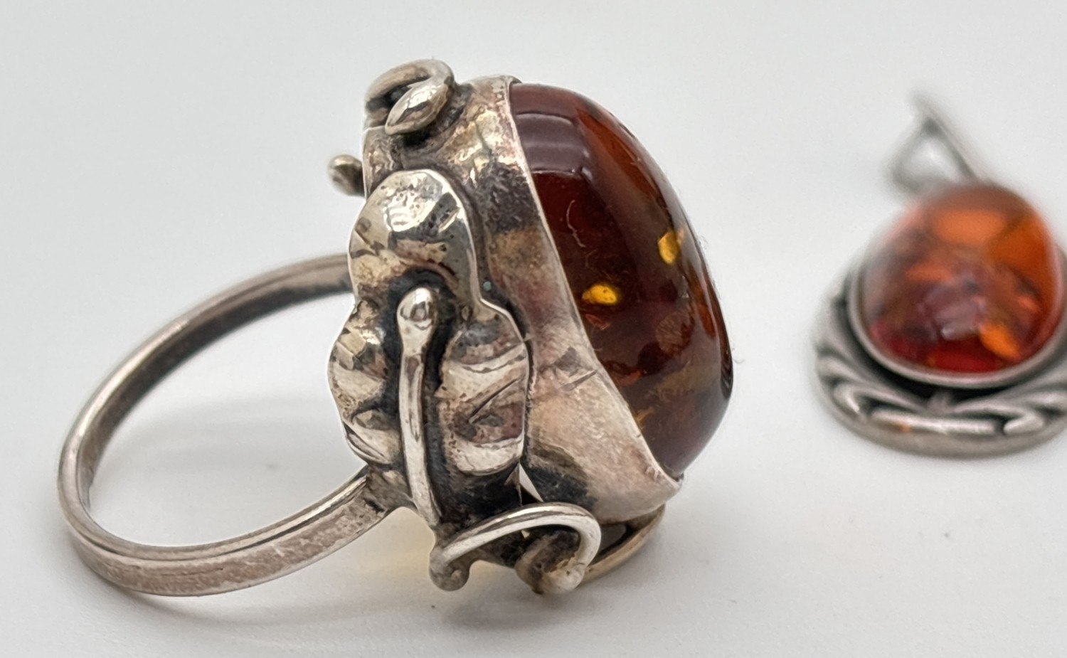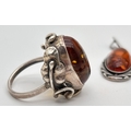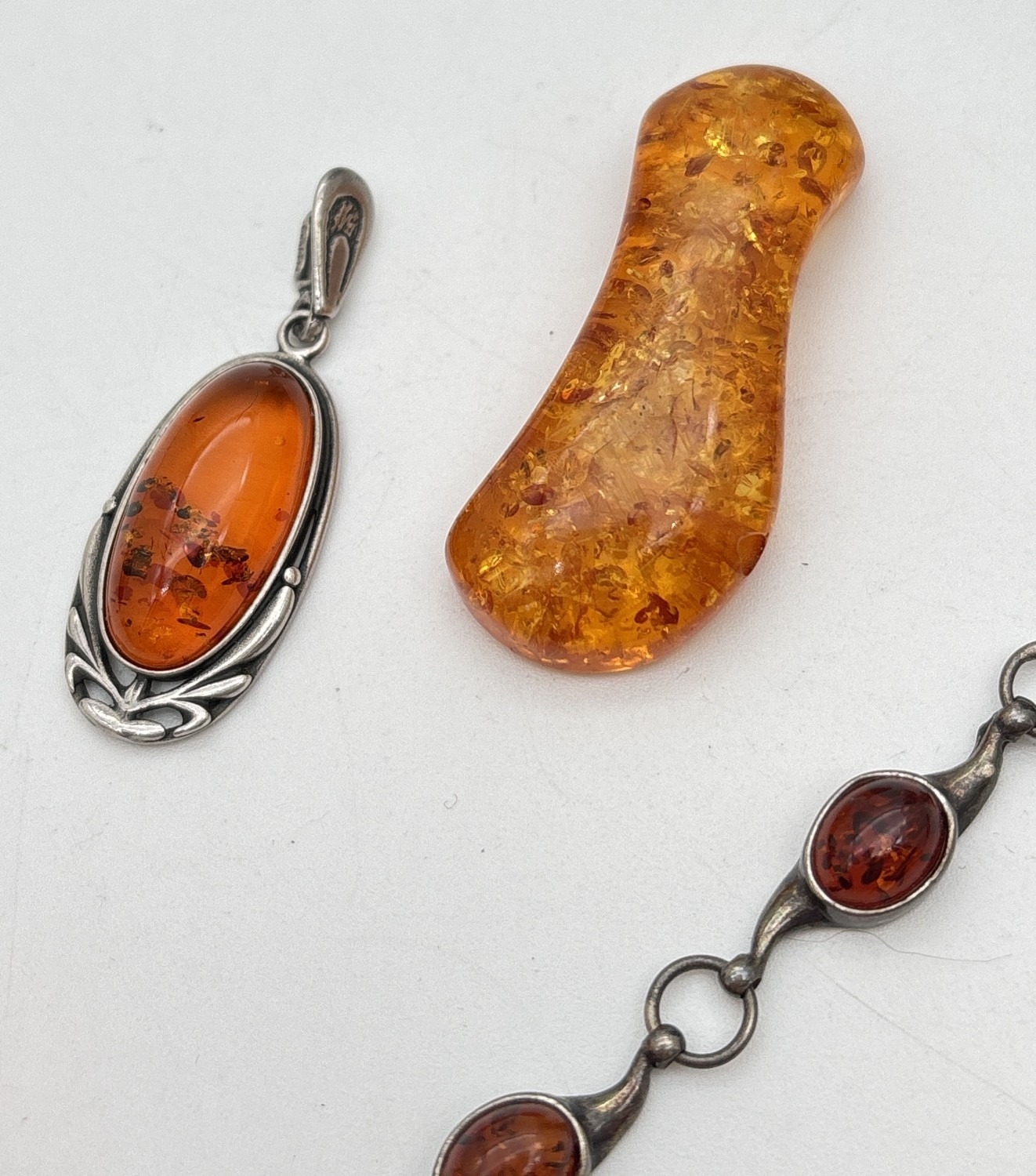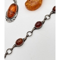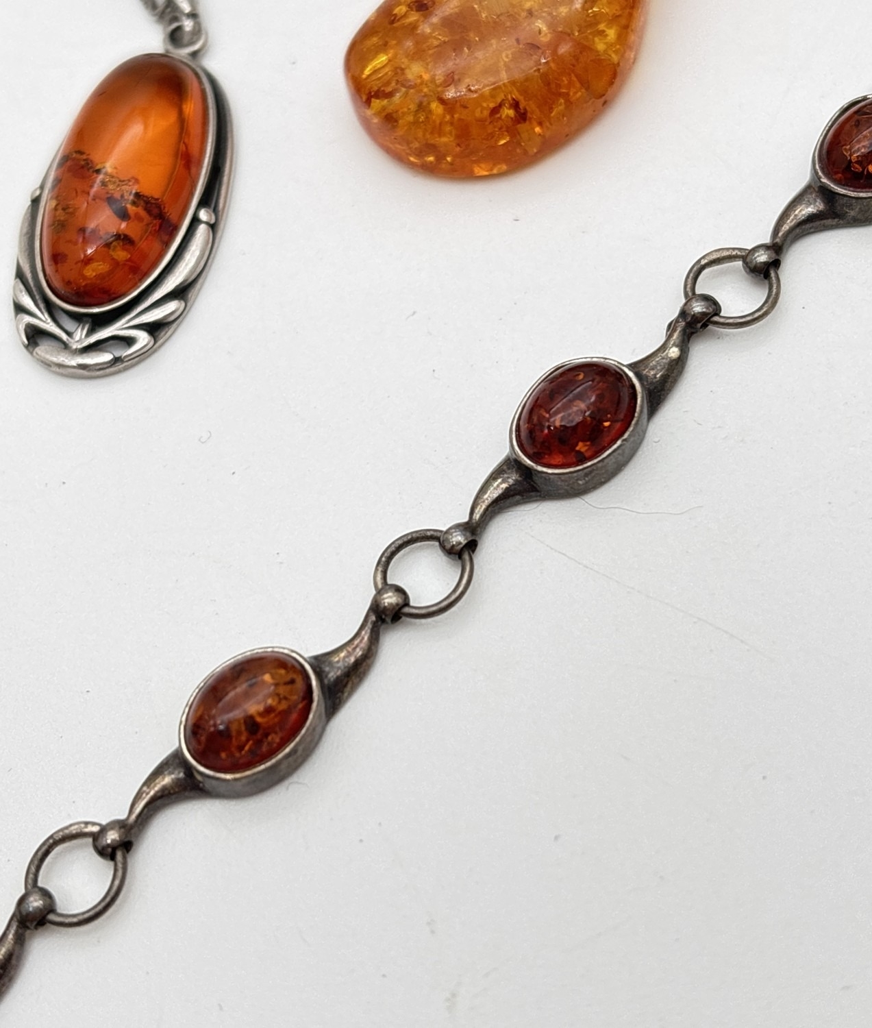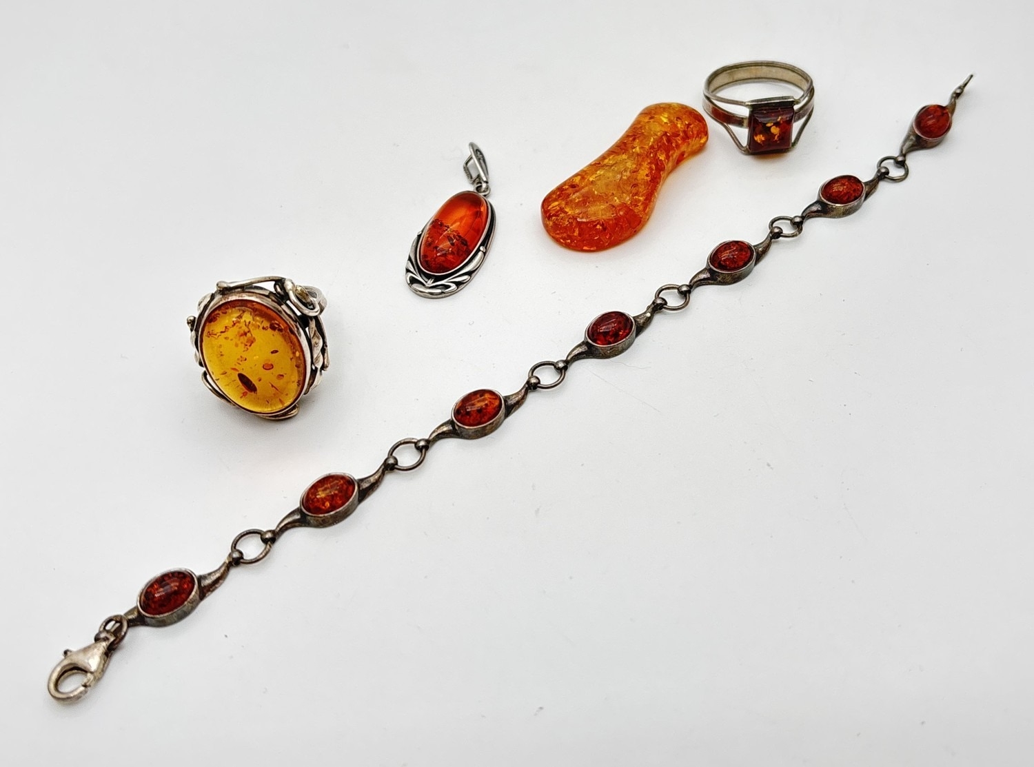 A collection of assorted vintage amber and silver (& white metal) jewellery to include large ring with oval cabochon of amber and decorative floral design mount. Also includes a 7.5" bracelet with lobster claw clasp, pendant with decorative hanging bale and ring set with square shaped piece of amber. Large ring, bracelet and pendant all stamped 925. Ring sizes O½ & P.
