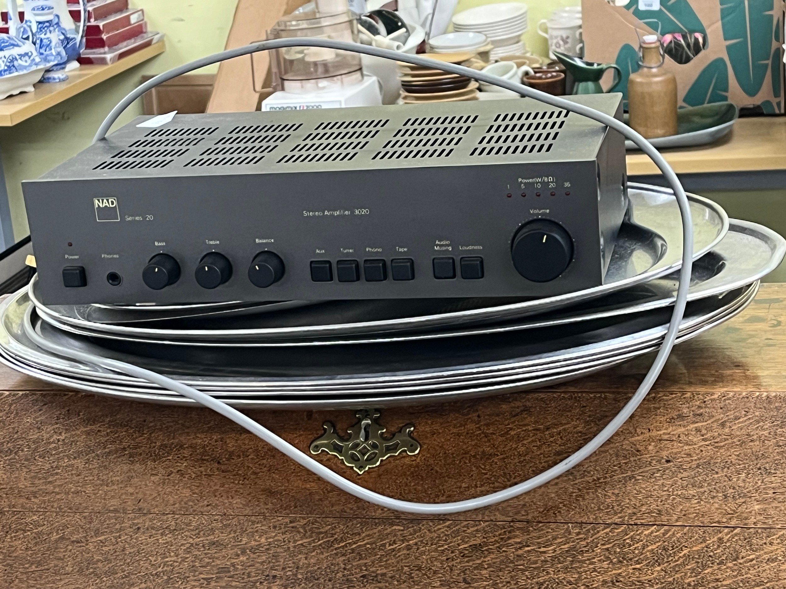 Collection of Stainless steel meat trays and a NAD Amplifier