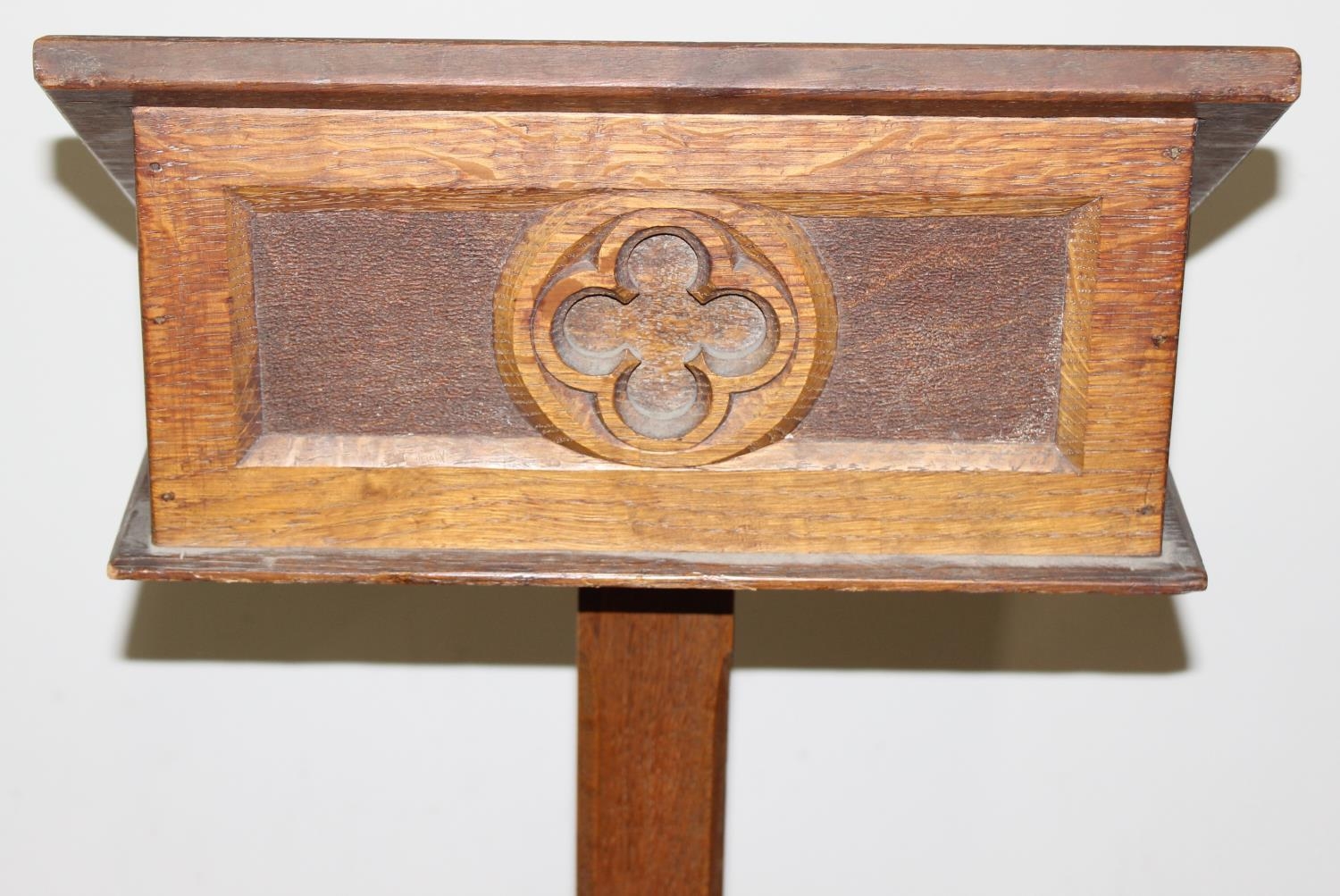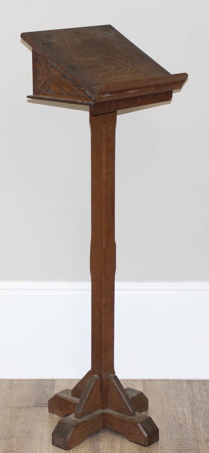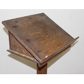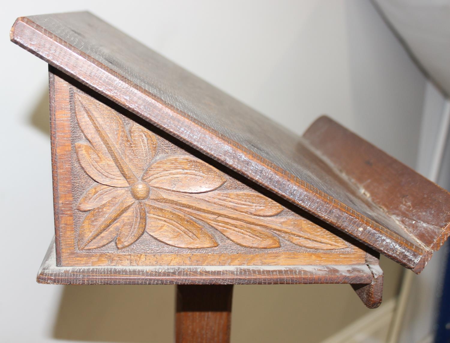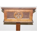 A vintage oak lectern with carved details, approx 40cm wide x 40cm deep x 124cm tall