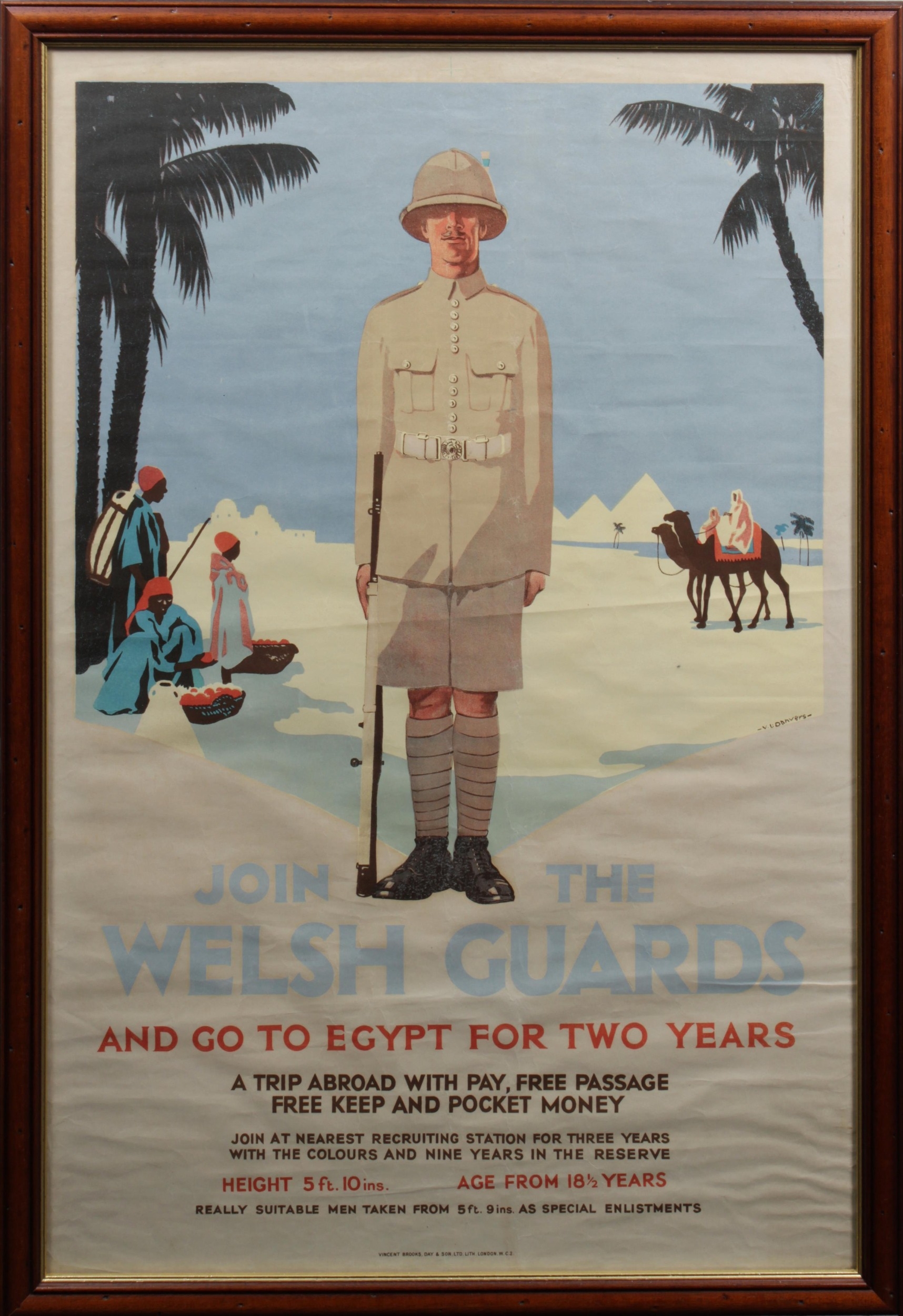 An early 20th century British Army recruitment poster - "JOIN THE WELSH GUARDS AND GO TO EGYPT FOR TWO YEARS", framed & glazed, artwork by V. L`Danvers, 81.5 x 55.5cm. overall.