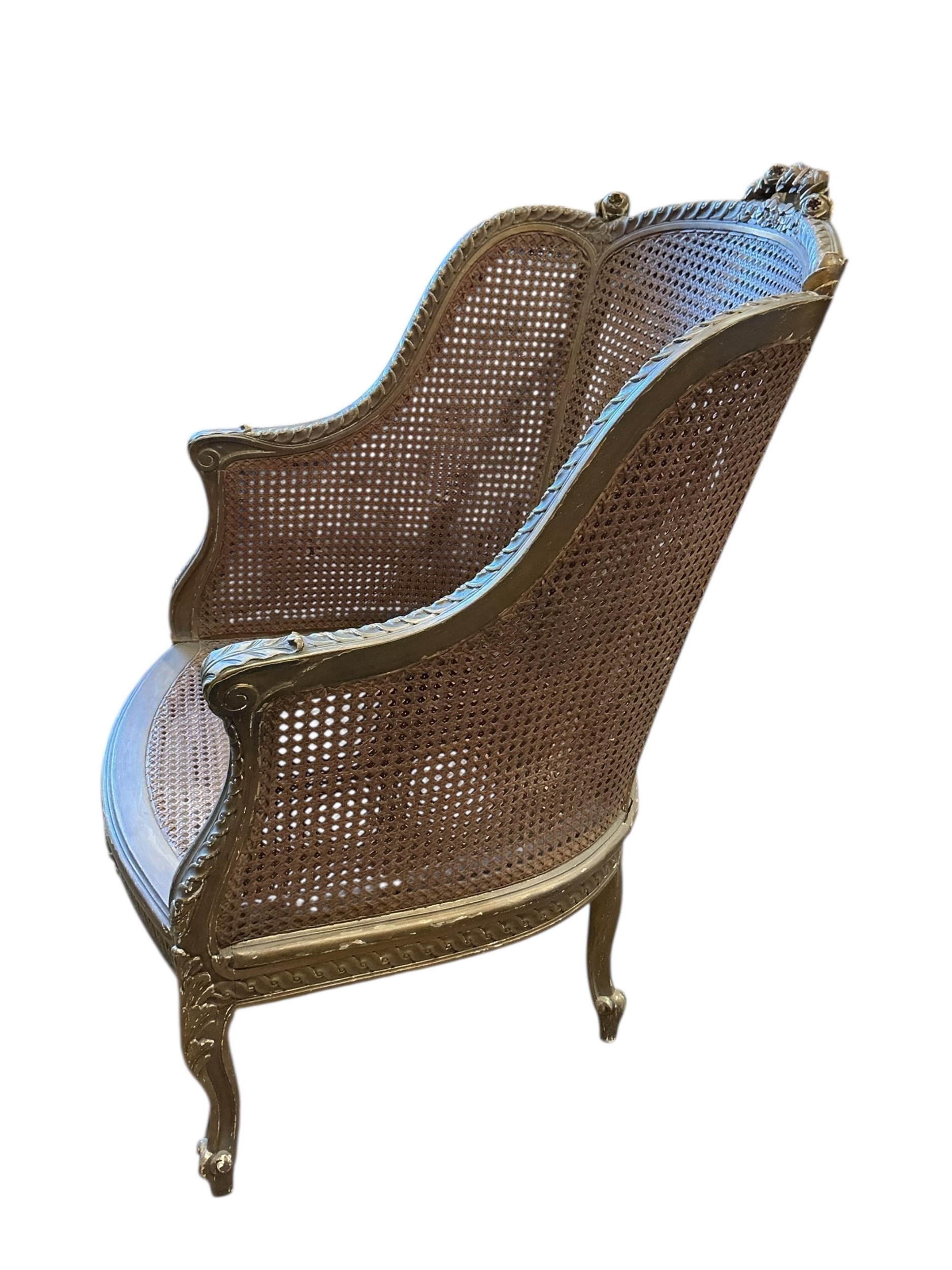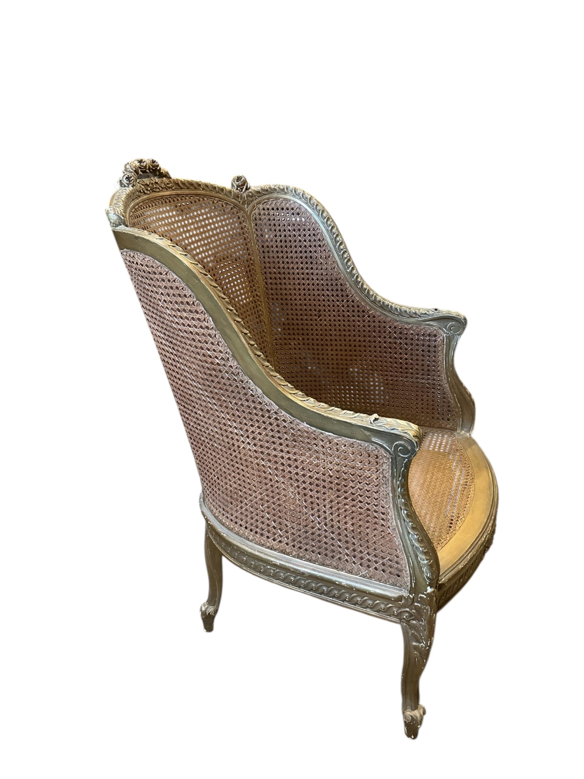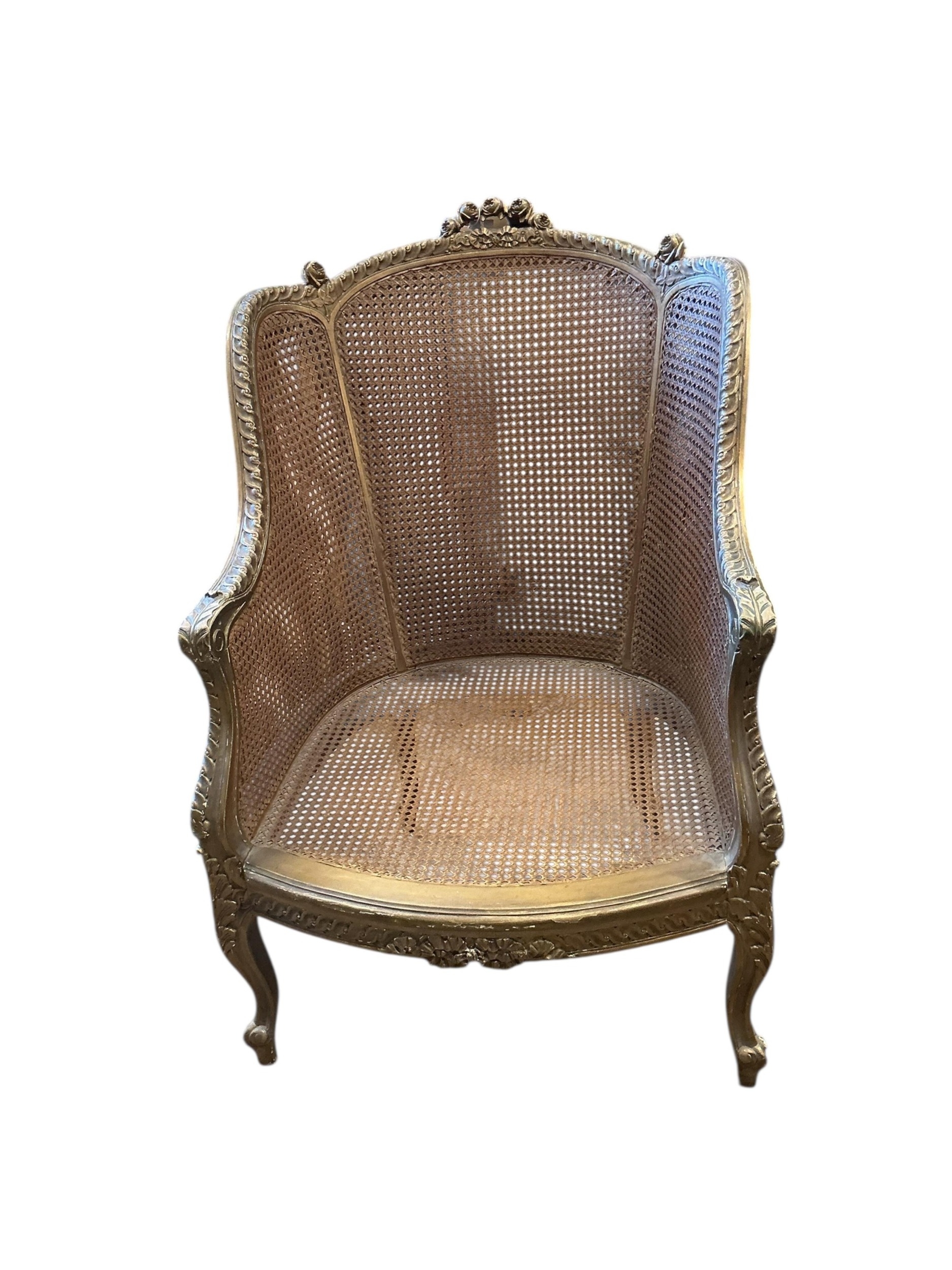 A Louis XVI style giltwood and canework bergere armchair, width 66cm, depth 62cm, height 102cm