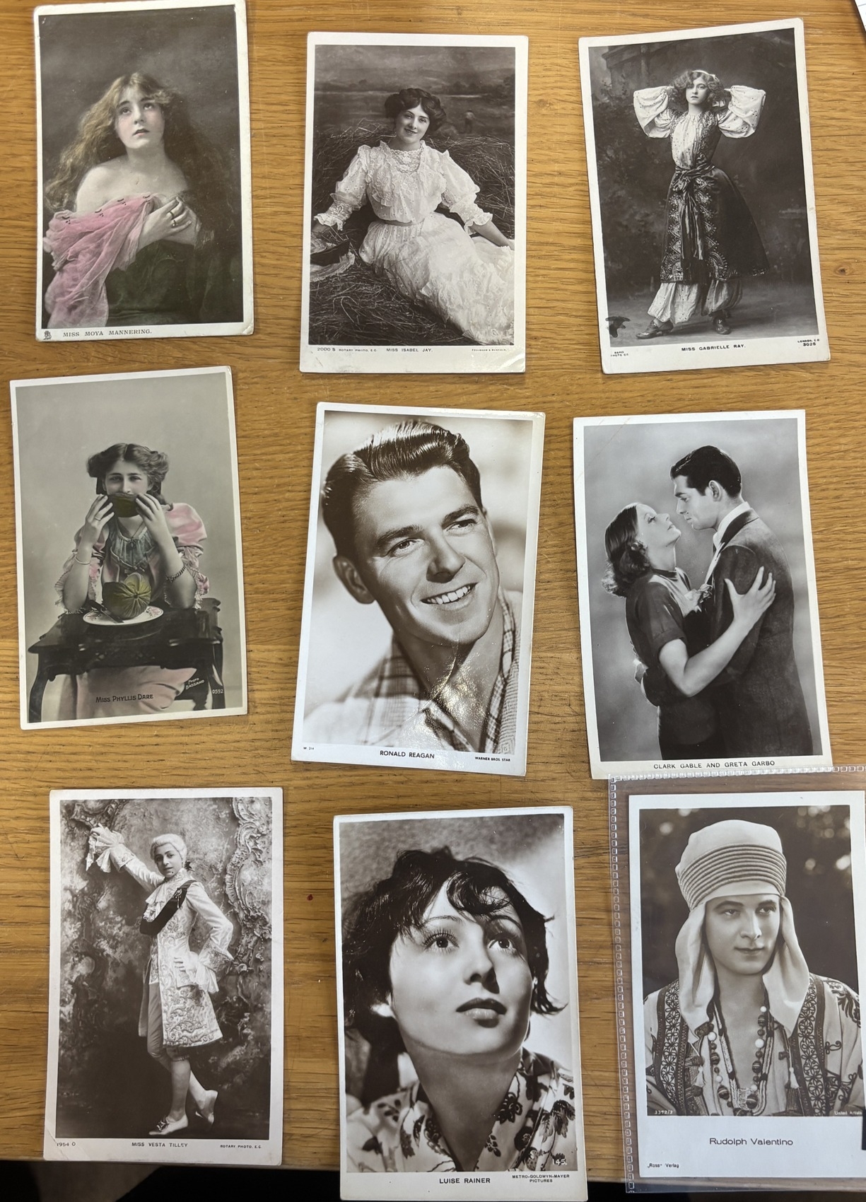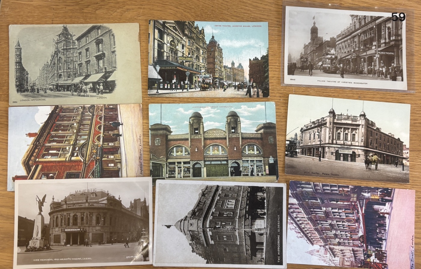 Theatrical. Coln. of vintage cards with theatres and actors/actresses, incl. stage actors and film stars with Clark Gable, Gabrielle Ray, Greta Garbo, Luise Rainer, Isabel Jay, Moya Mannering, Phyllis Dare, Ronald Reagan, Rudolph Valentino, Vesta Tilley, etc, theatres with Majestic Cinema Leeds, The Hippodrome Aldershot, The Tiroli London, Imperial Theatre London, Hippodrome Great Yarmouth, Palace Theatre Halifax, London Hippodrome, Empire Theatre London, Palace Theatre of Varieties Machester, etc. Qty. Approx. 100+. (R)