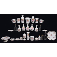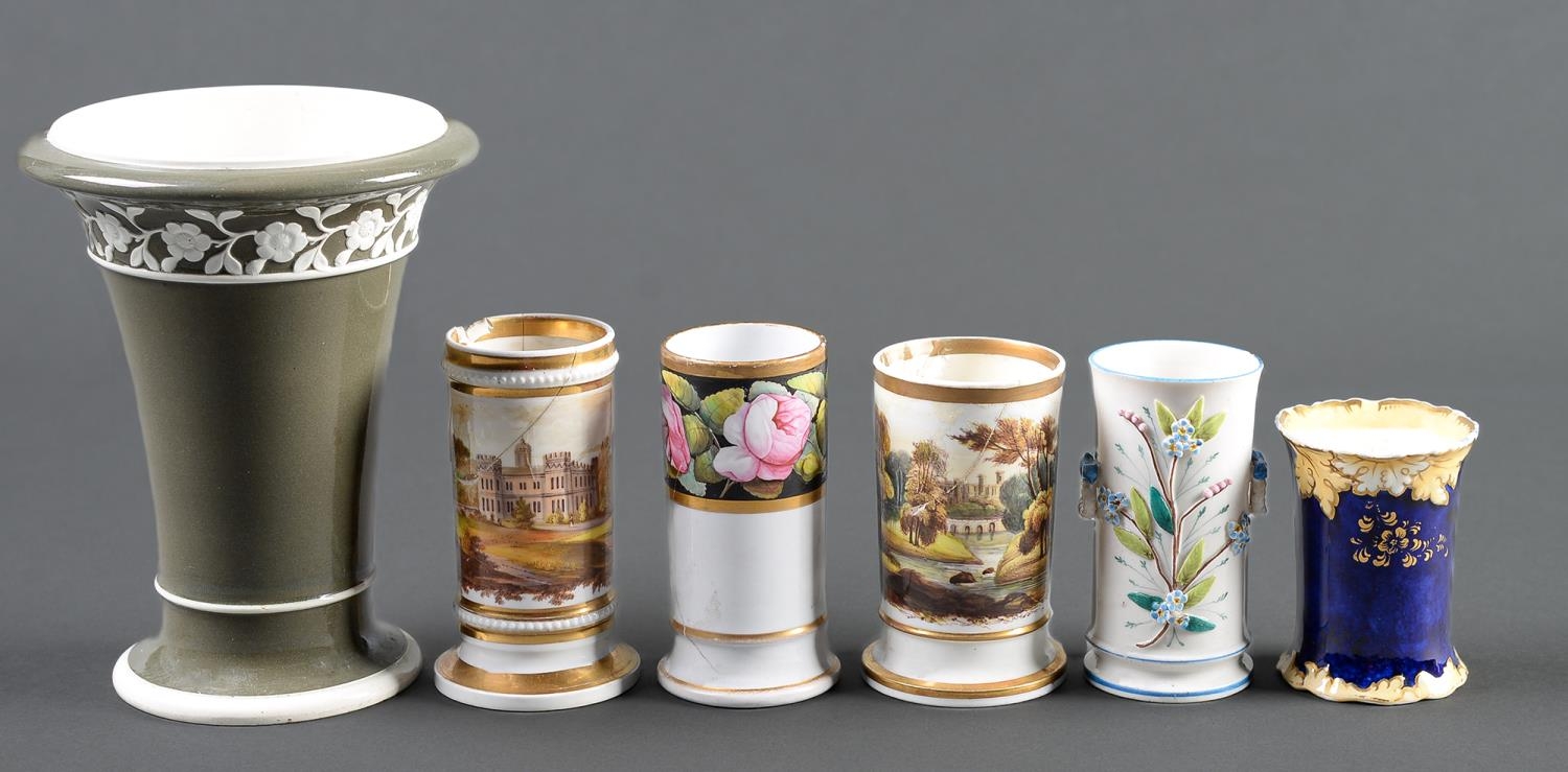 Three Spode and other bone china spill vases, early 19th c, painted with roses or landscapes, 11cm h and circa, two others and a larger flared cylindrical buff ground pearlware vase, with moulded floral border (6)