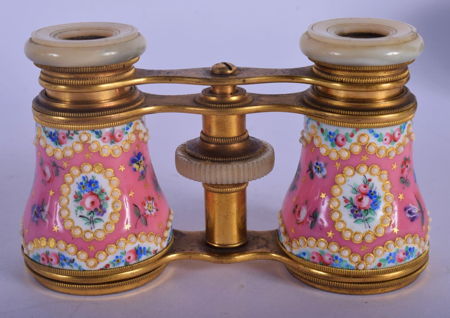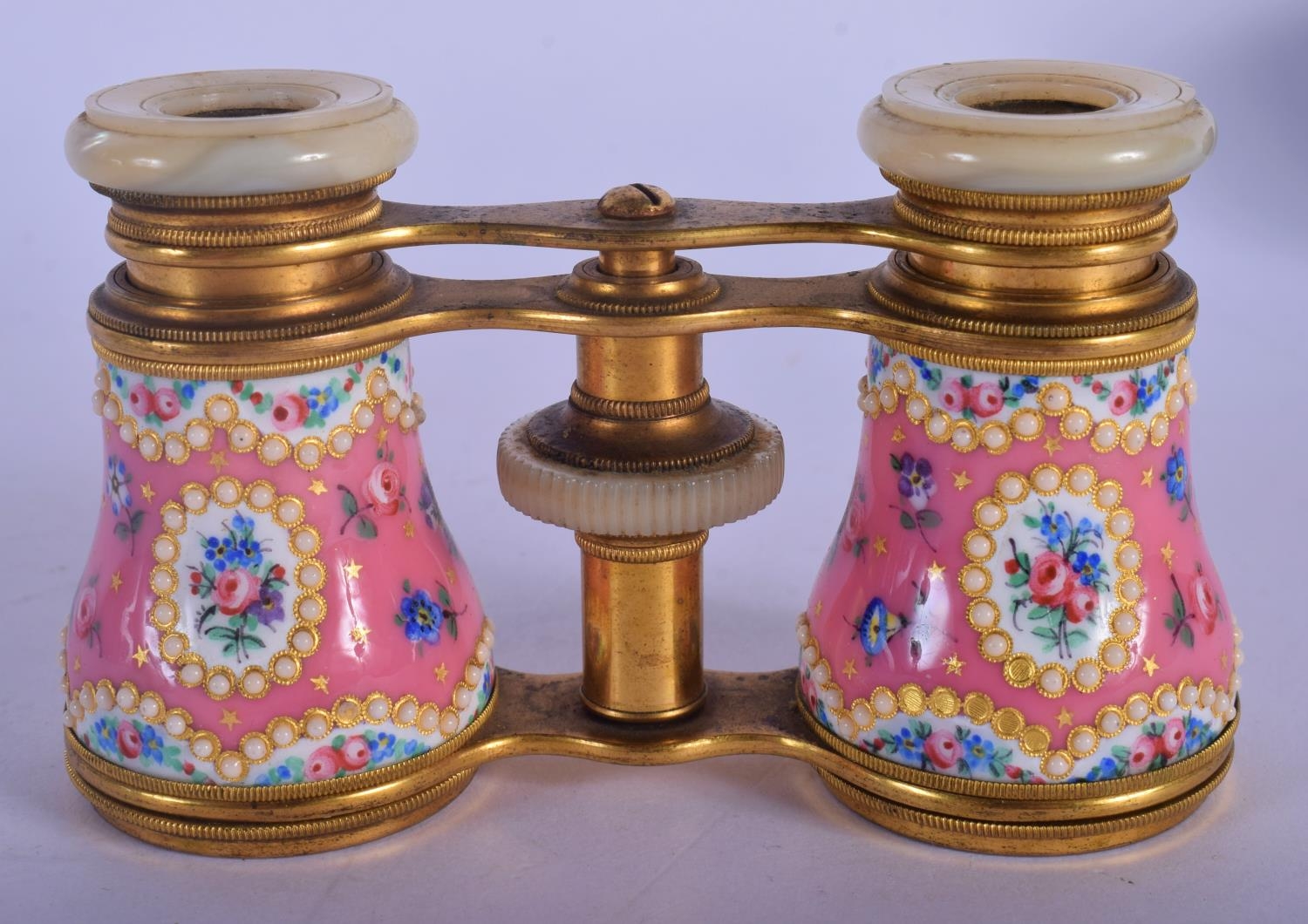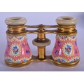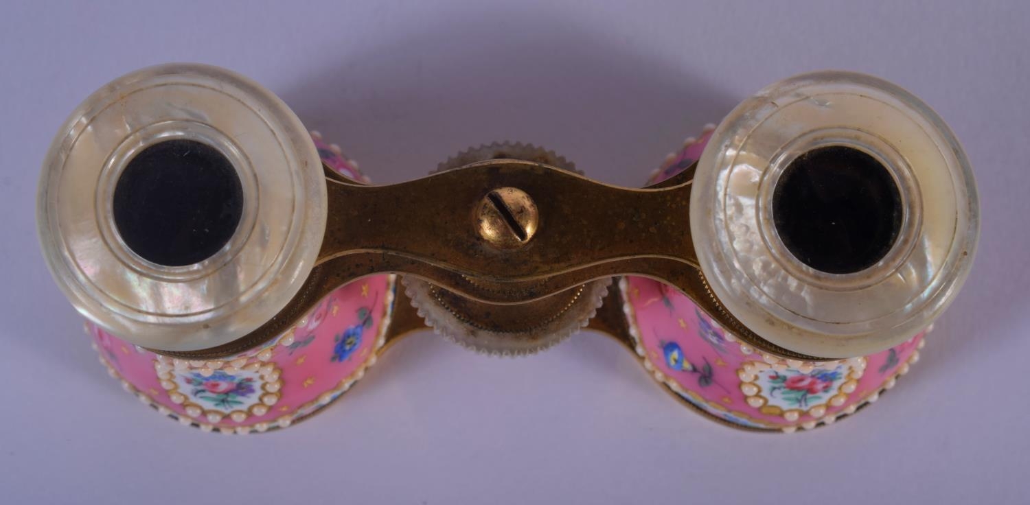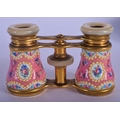 A PAIR OF EARLY 20TH CENTURY EUROPEAN ENAMELLED OPERA GLASSES painted with flowers. 9 cm x 7 cm extended.