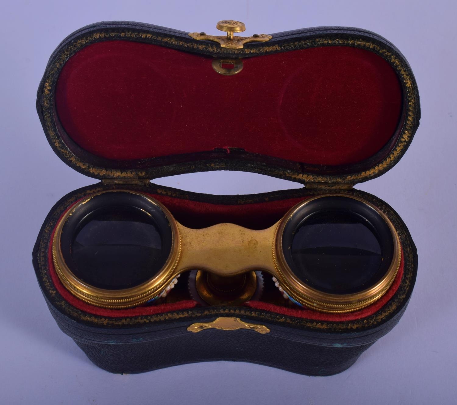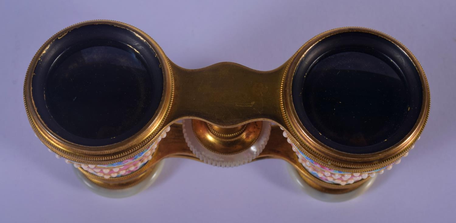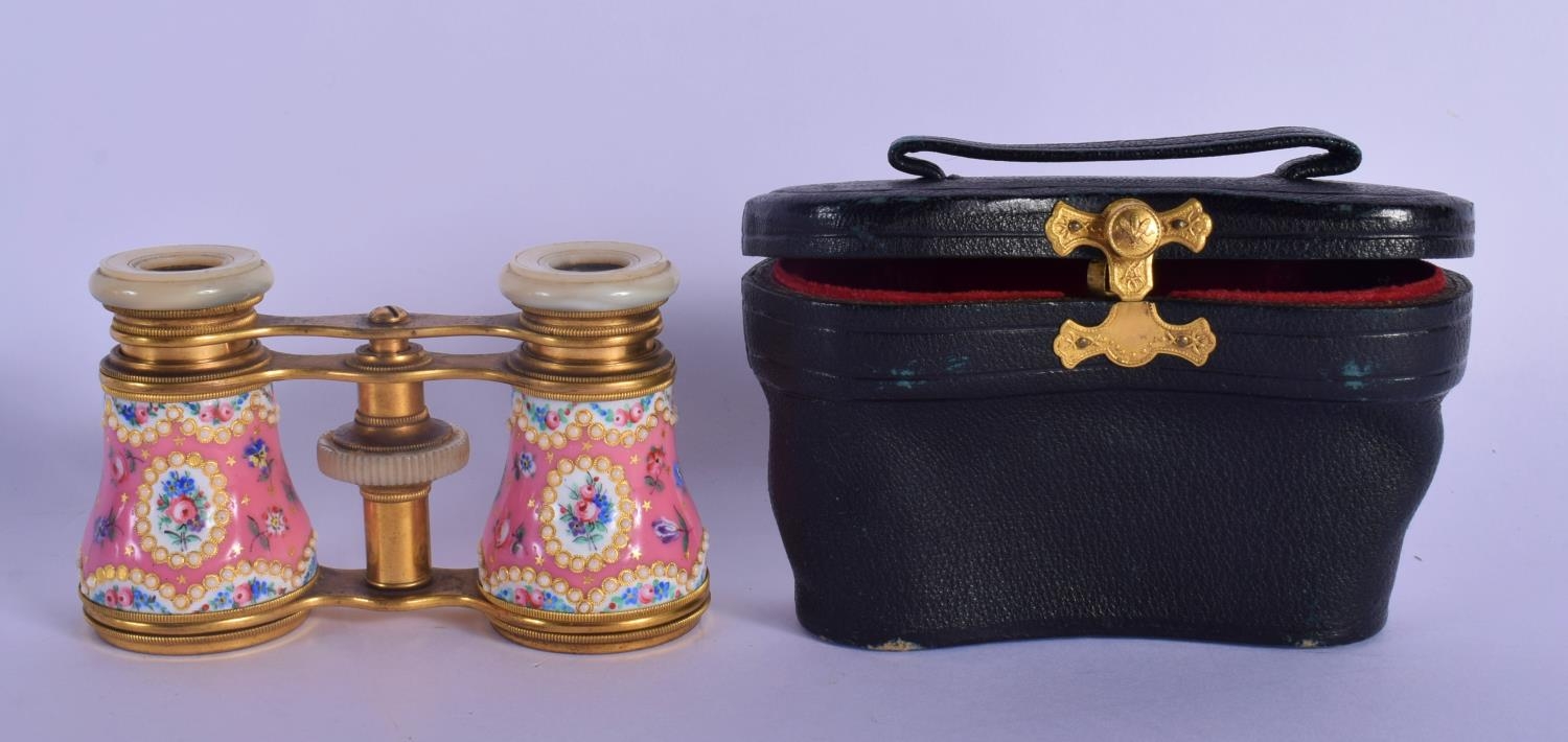 A PAIR OF EARLY 20TH CENTURY EUROPEAN ENAMELLED OPERA GLASSES painted with flowers. 9 cm x 7 cm extended.