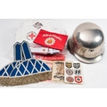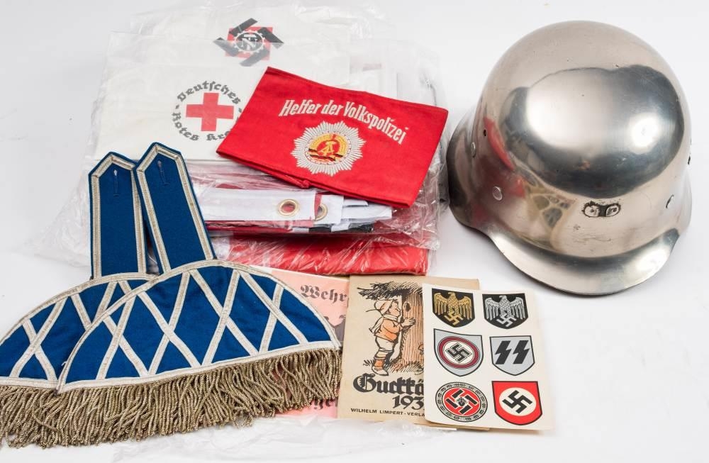 A post war German Police M43 pattern polished steel helmet: with liner, together with a group of reproduction German flags and armbands etc.