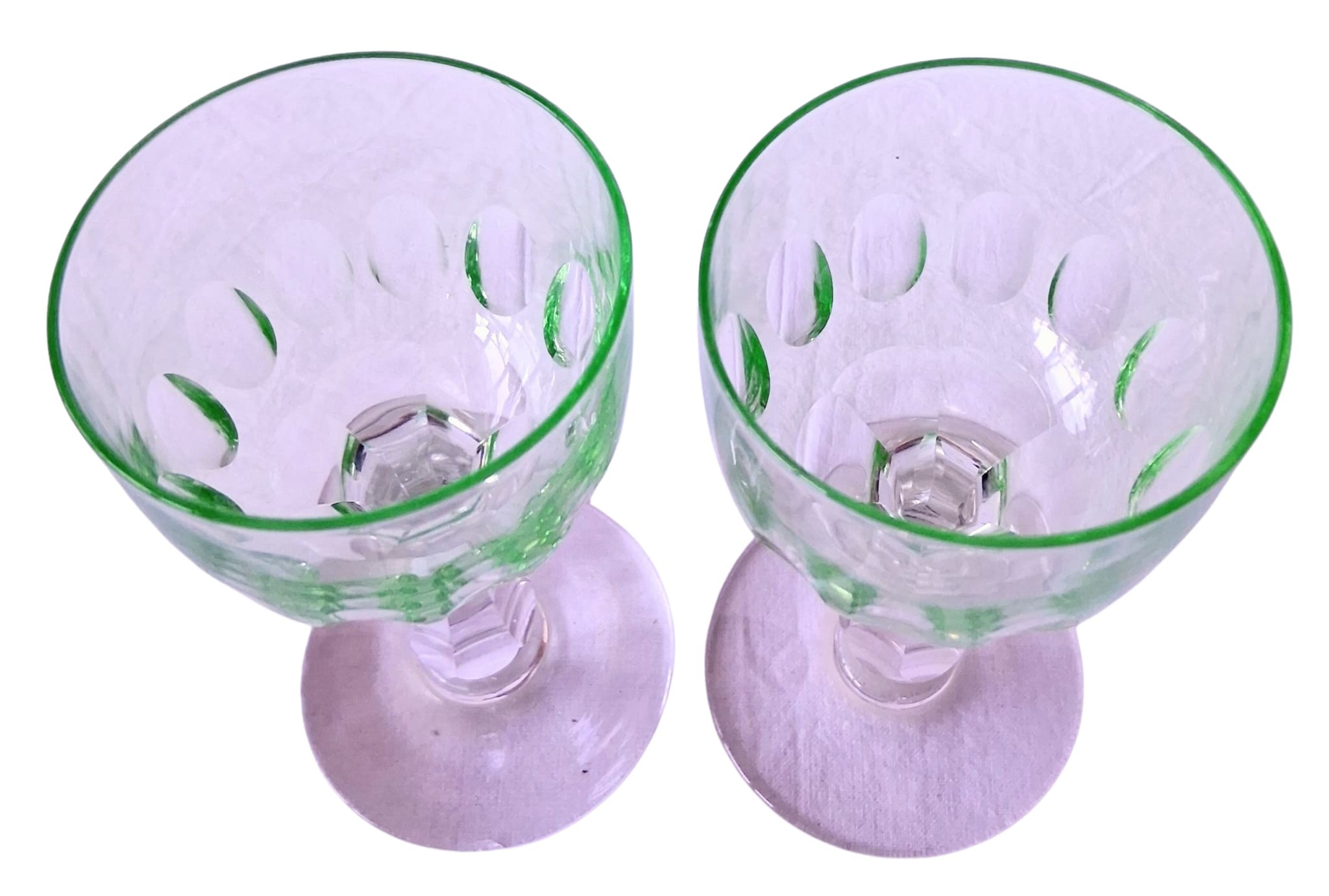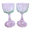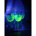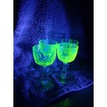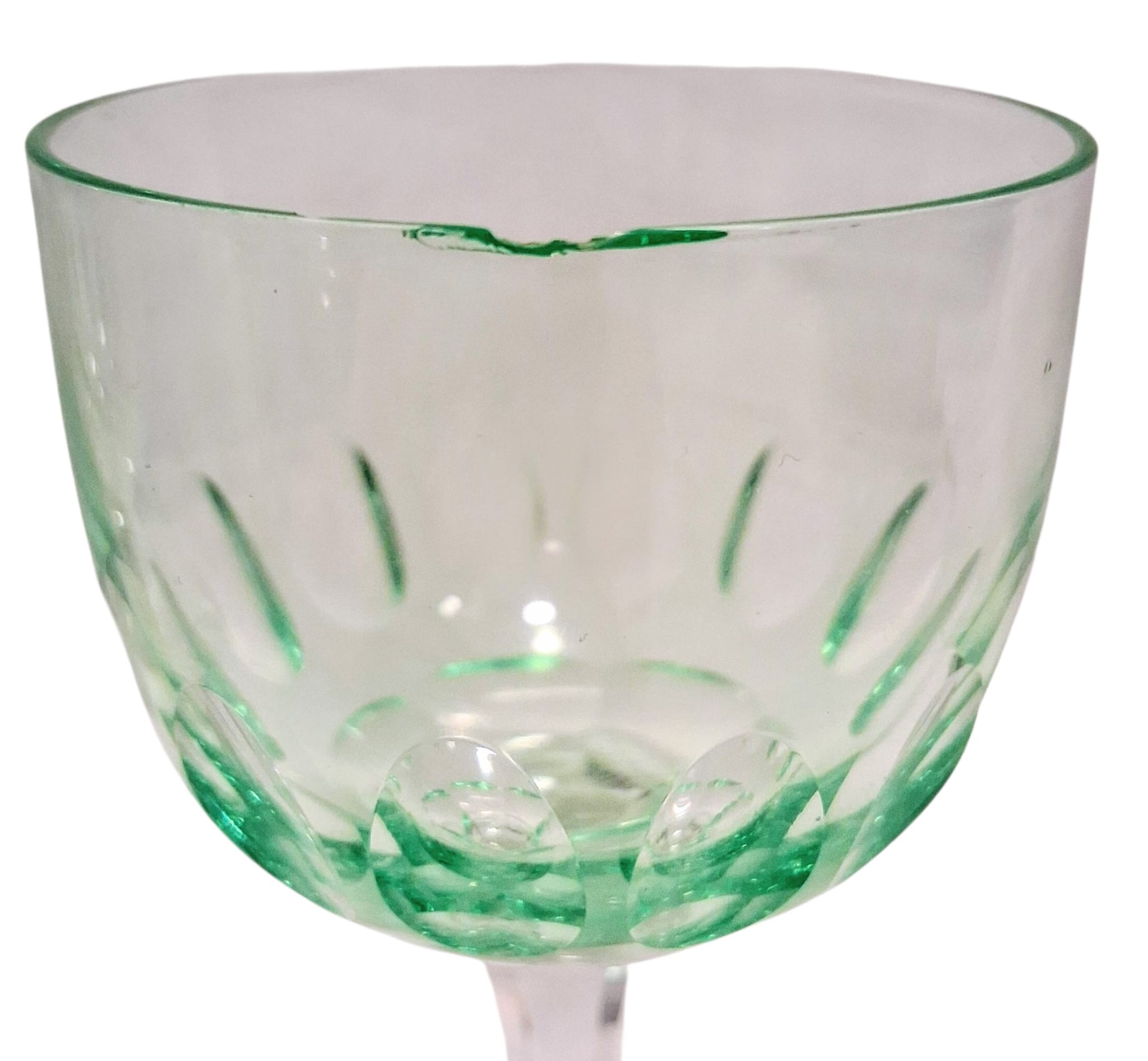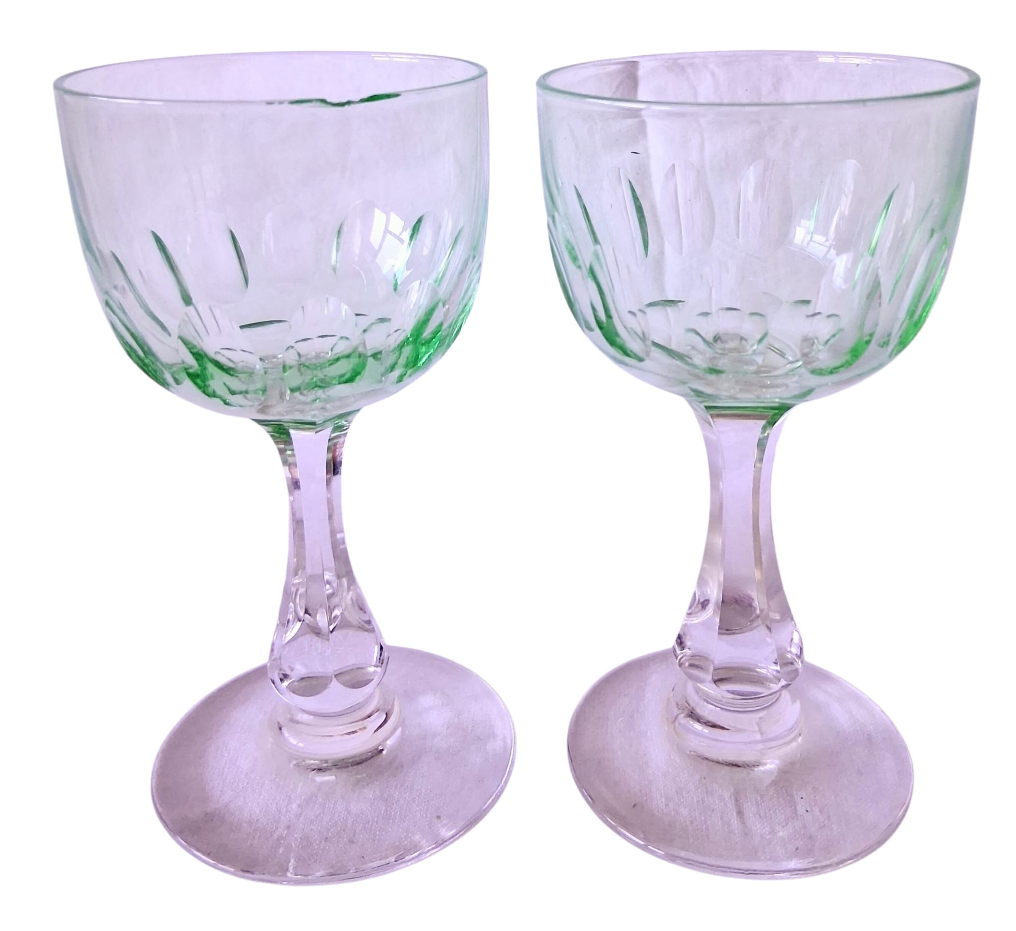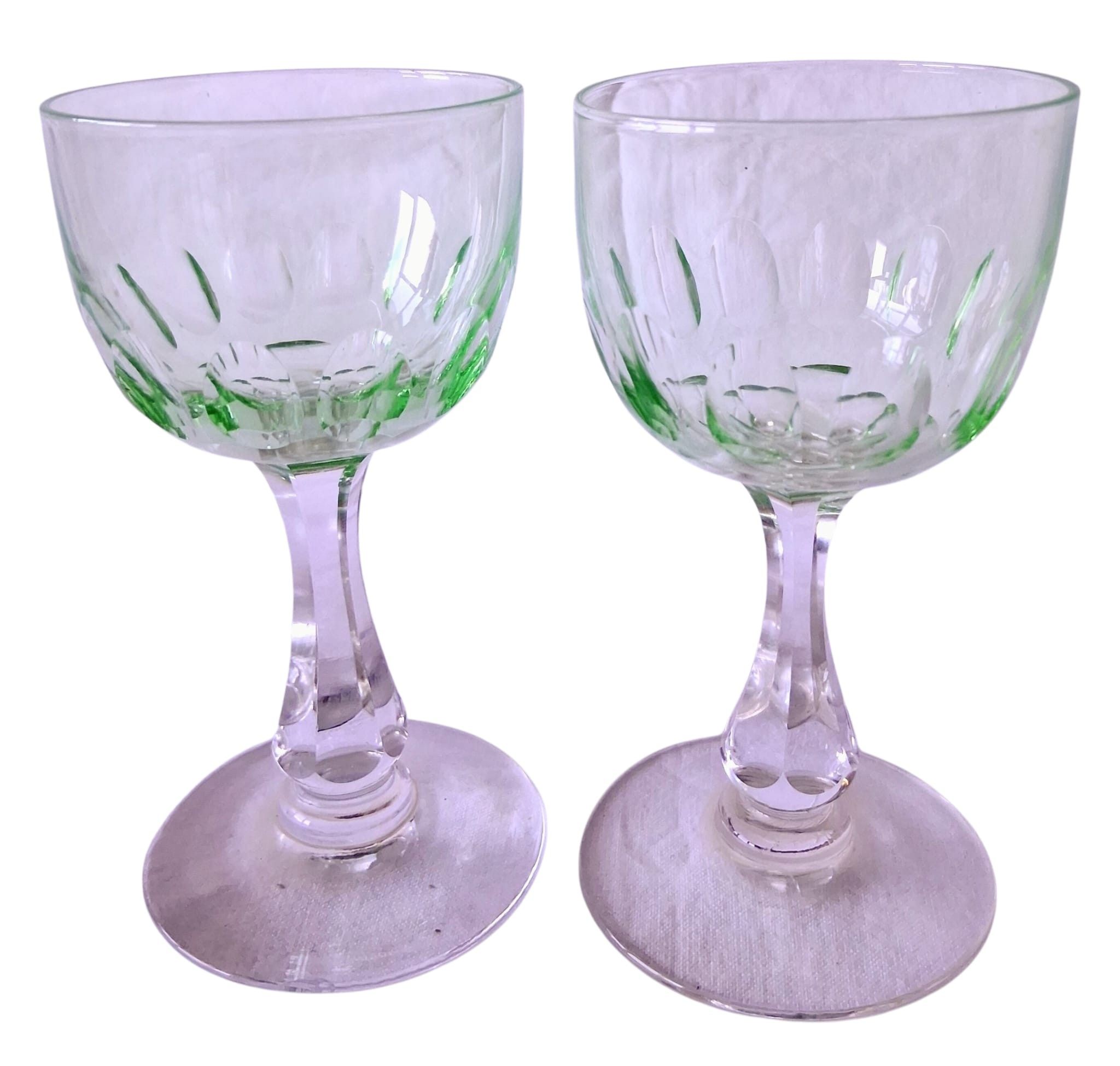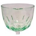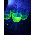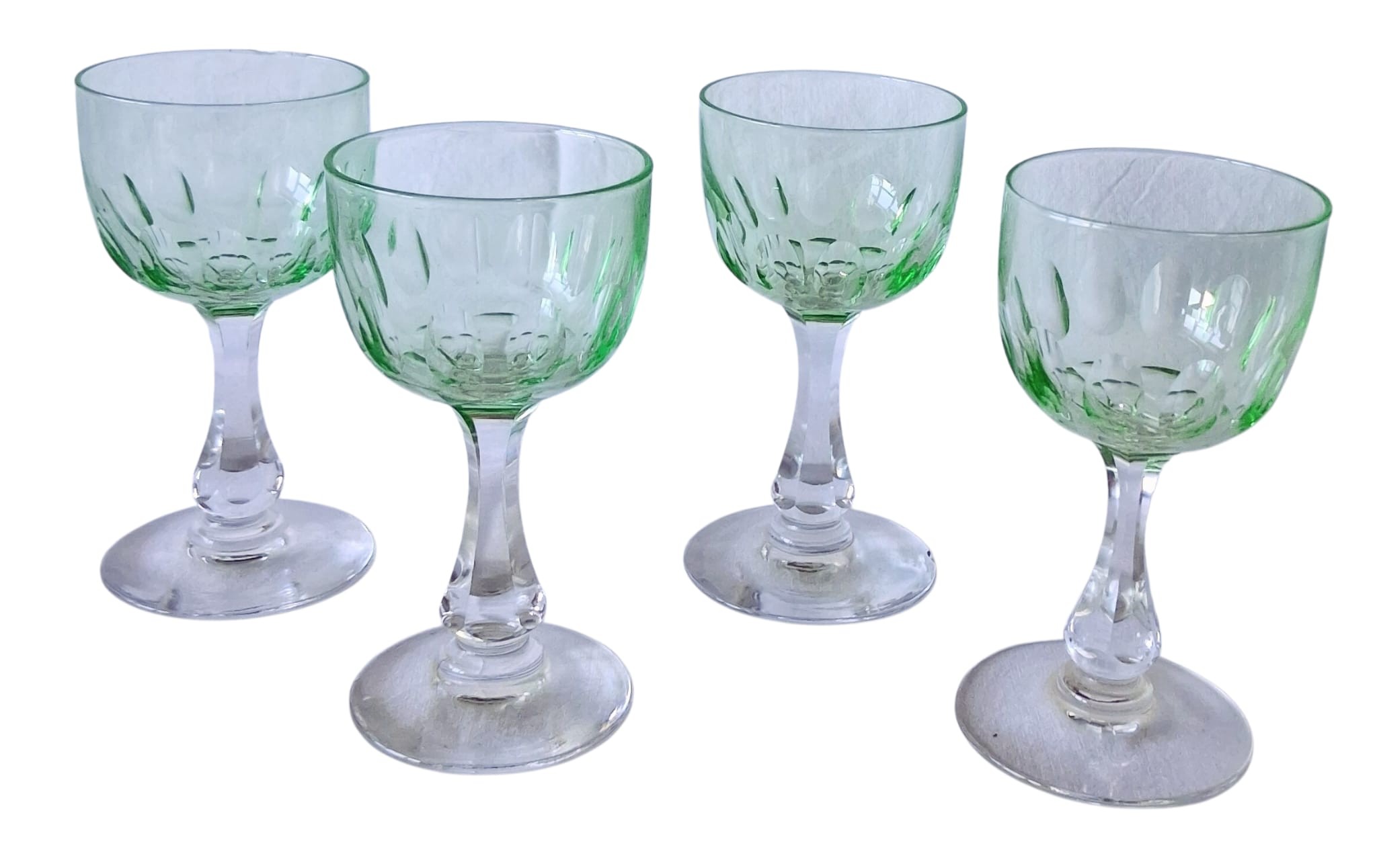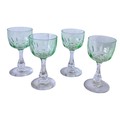 A set of four vintage, 1920's Val Saint Lambert aperitife glasses. With clear carved stems and thumbprint cut Uranium glass bowls. One has a small chip to rim.