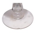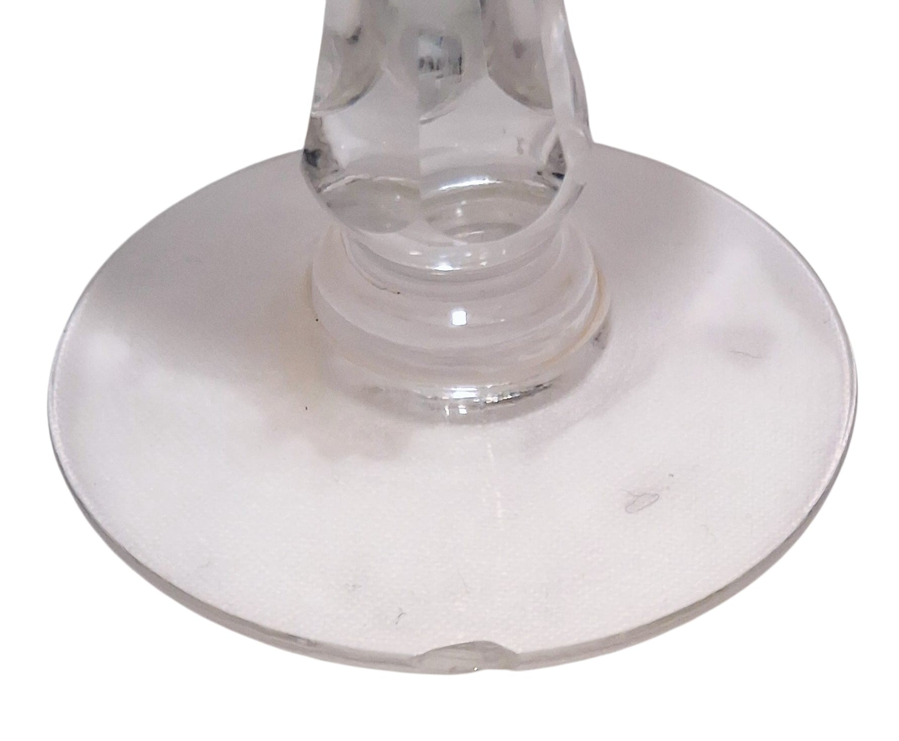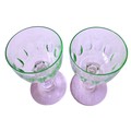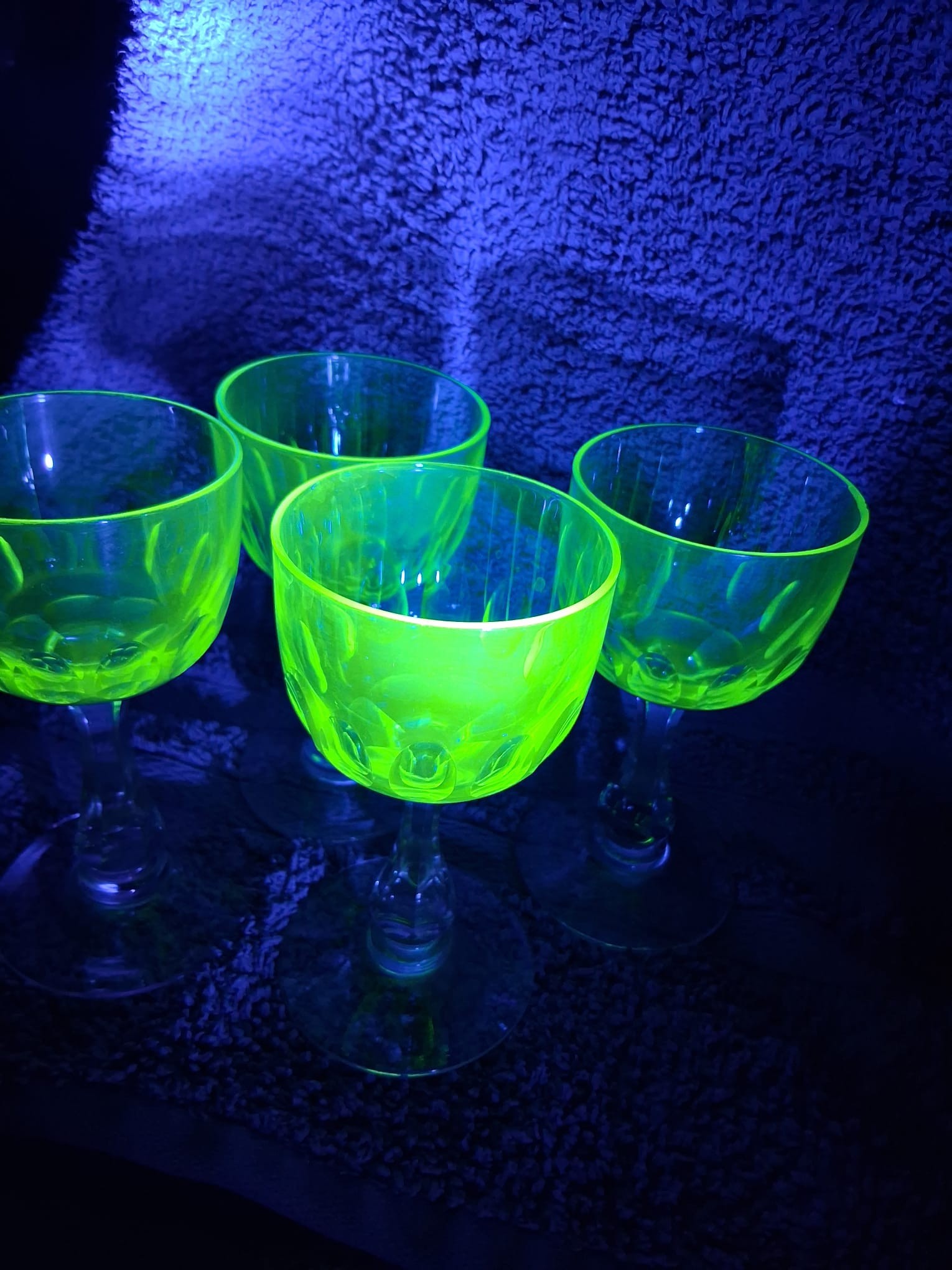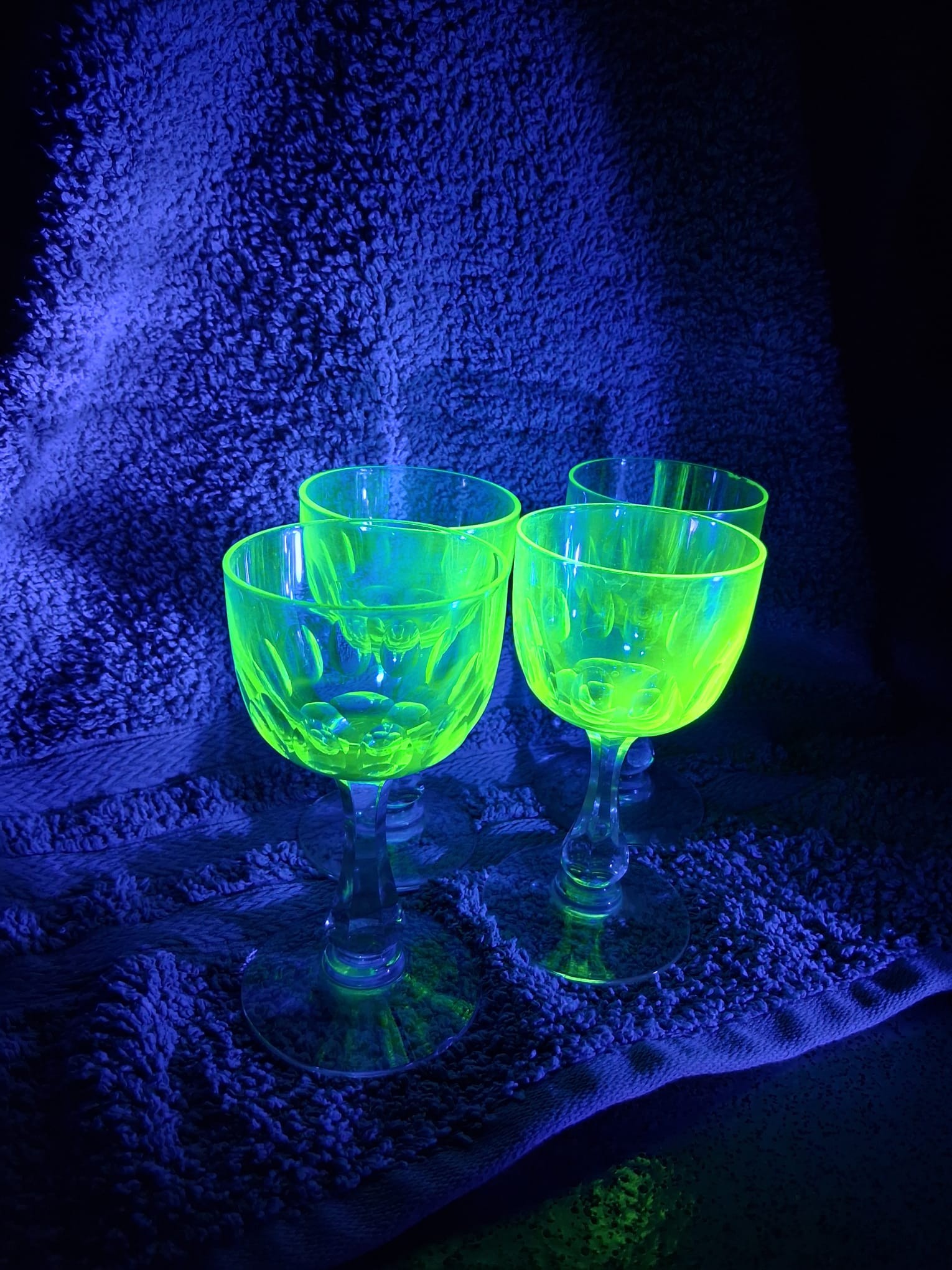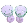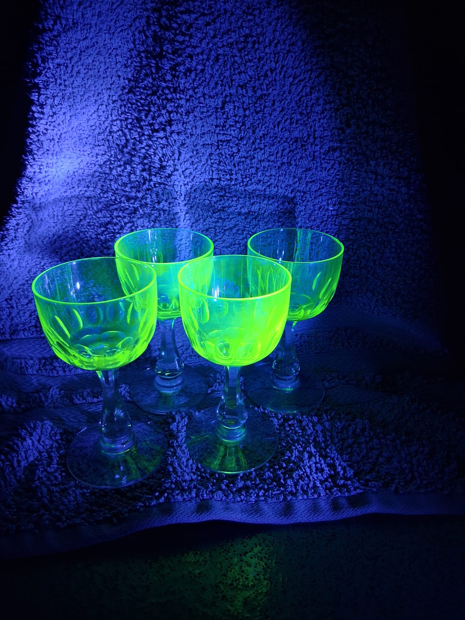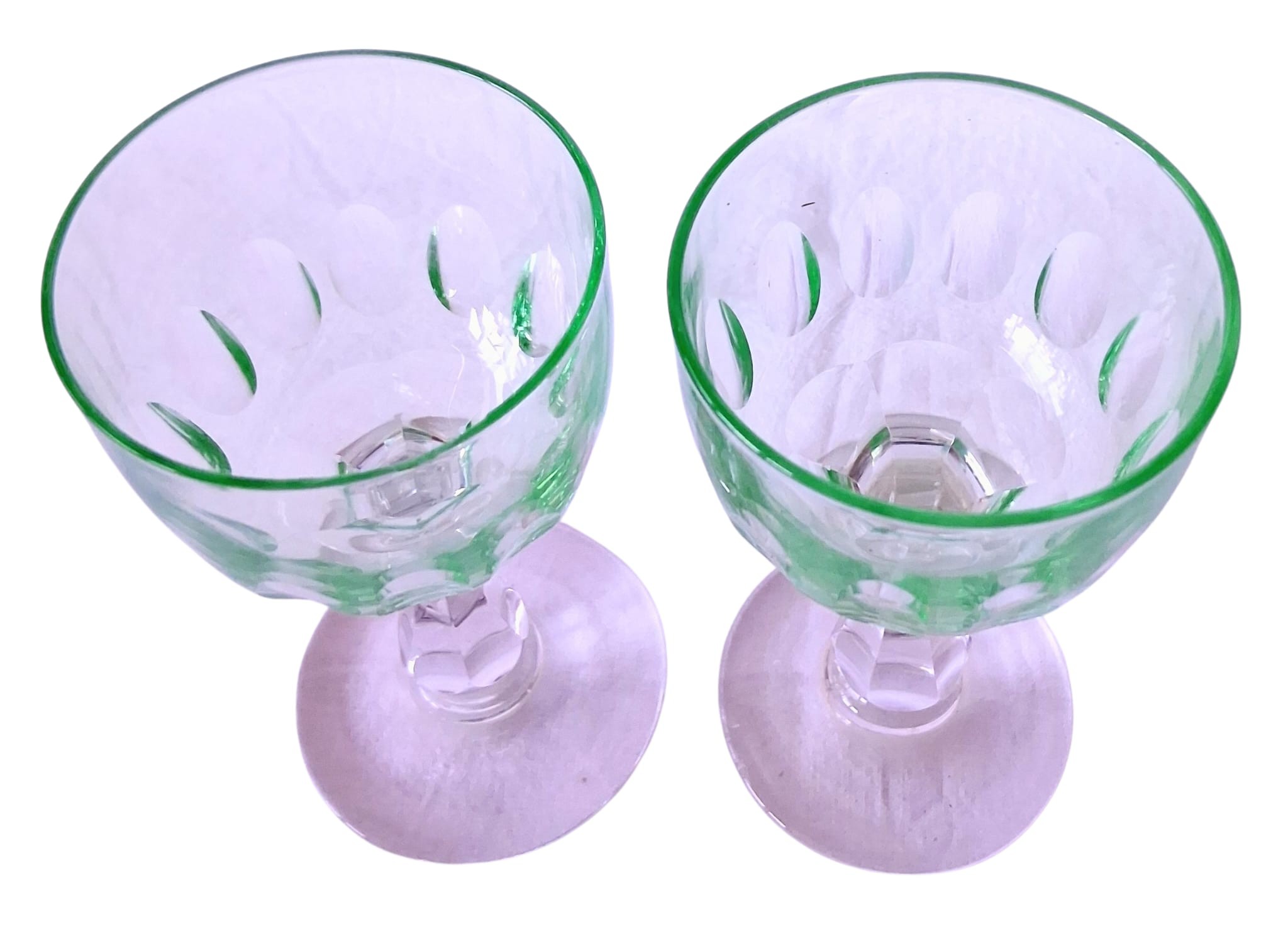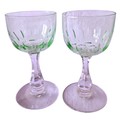 A set of four vintage, 1920's Val Saint Lambert aperitife glasses. With clear carved stems and thumbprint cut Uranium glass bowls. One has a small chip to rim.