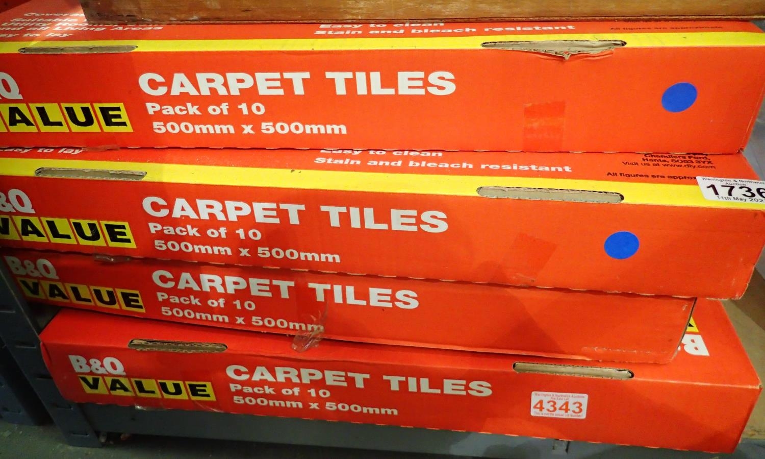Forty B&Q carpet tiles, each 500 x 500 mm. Not available for in-house P&P, contact Paul O'Hea at Mailboxes on 01925 659133