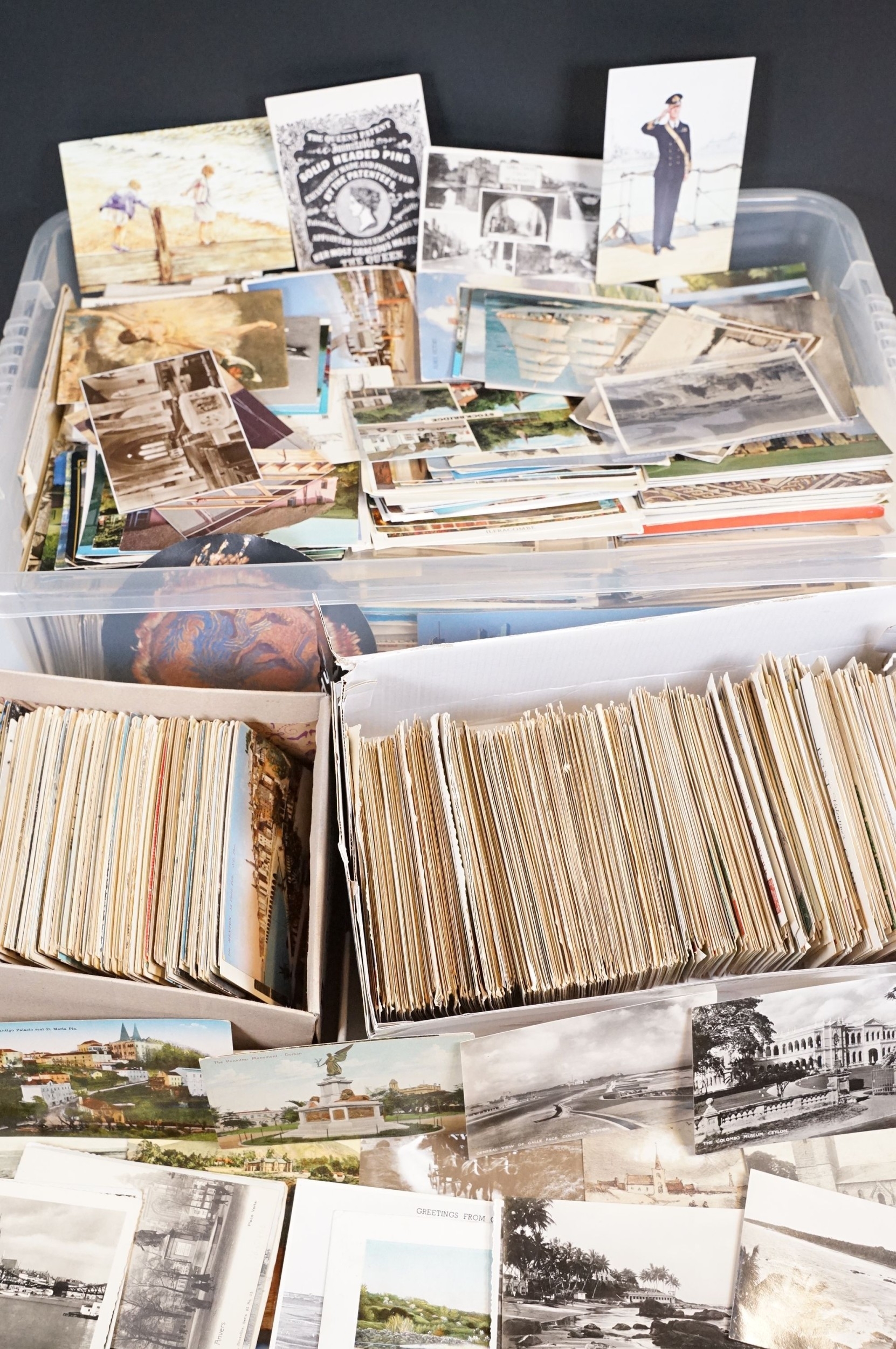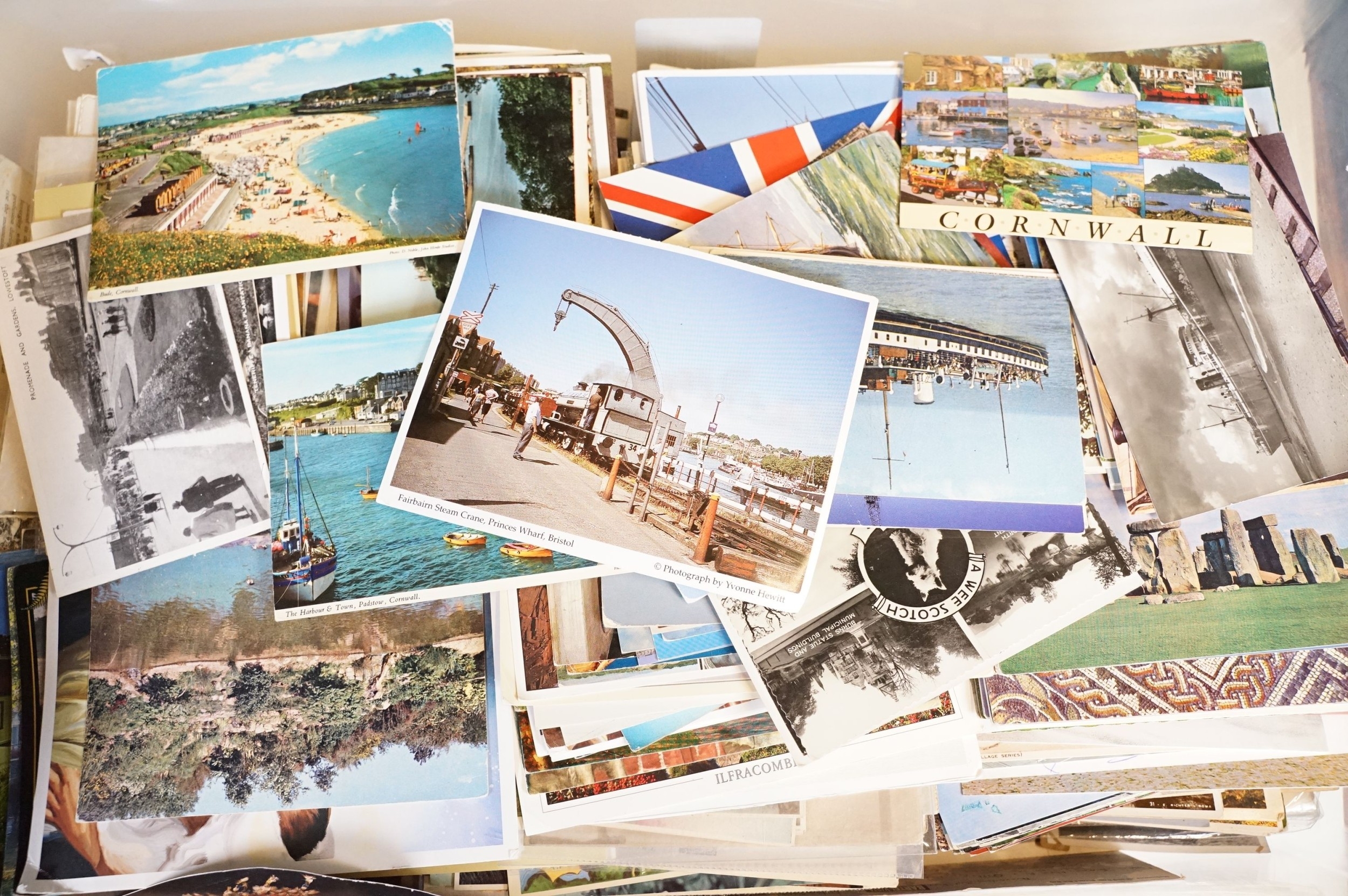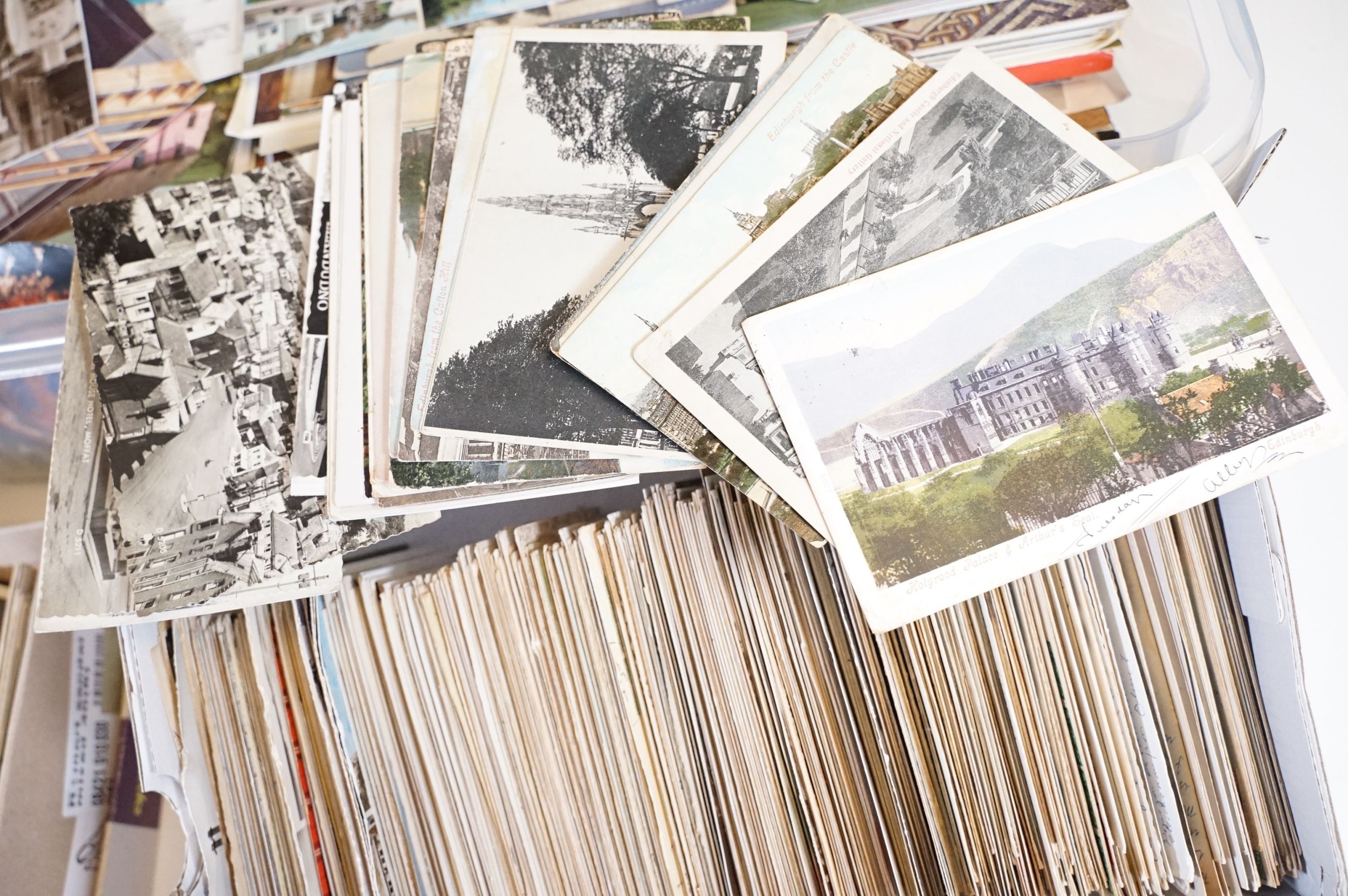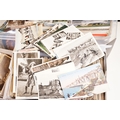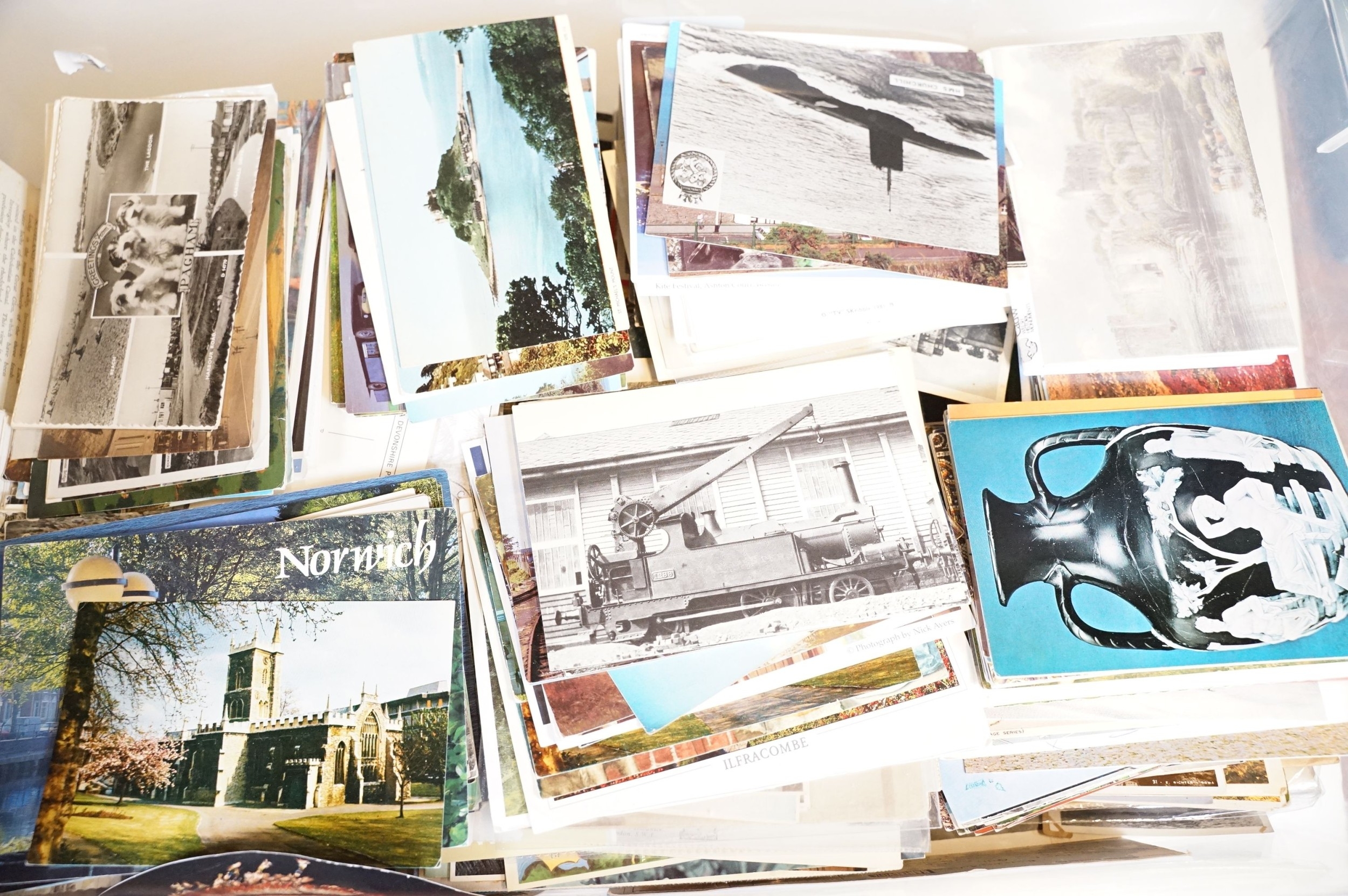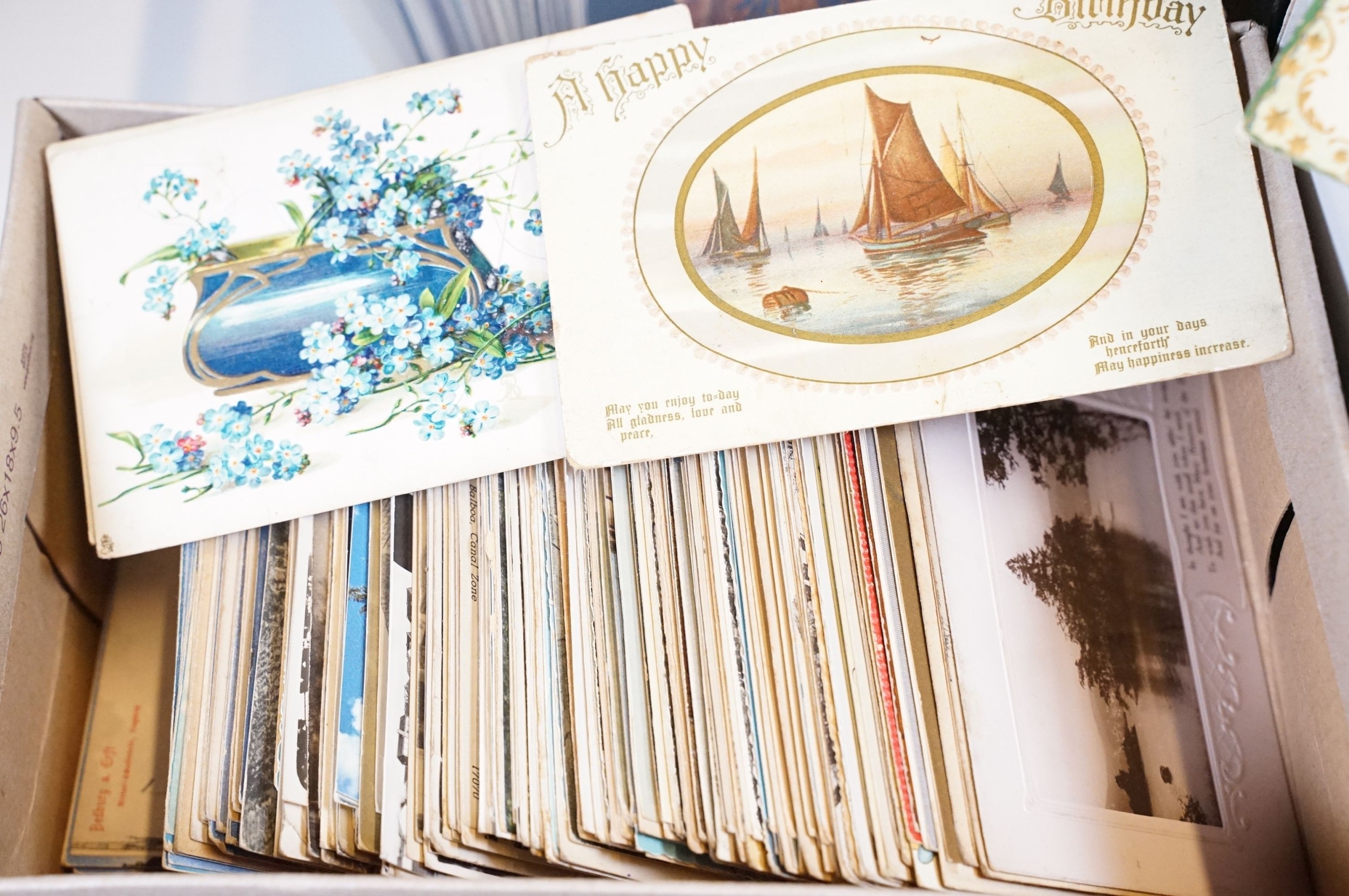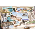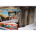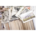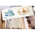 A large collection of early to mid 20th century postcards to include printed and real photo examples, mainly topographical and illustrated examples, within two boxes.