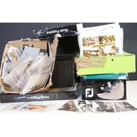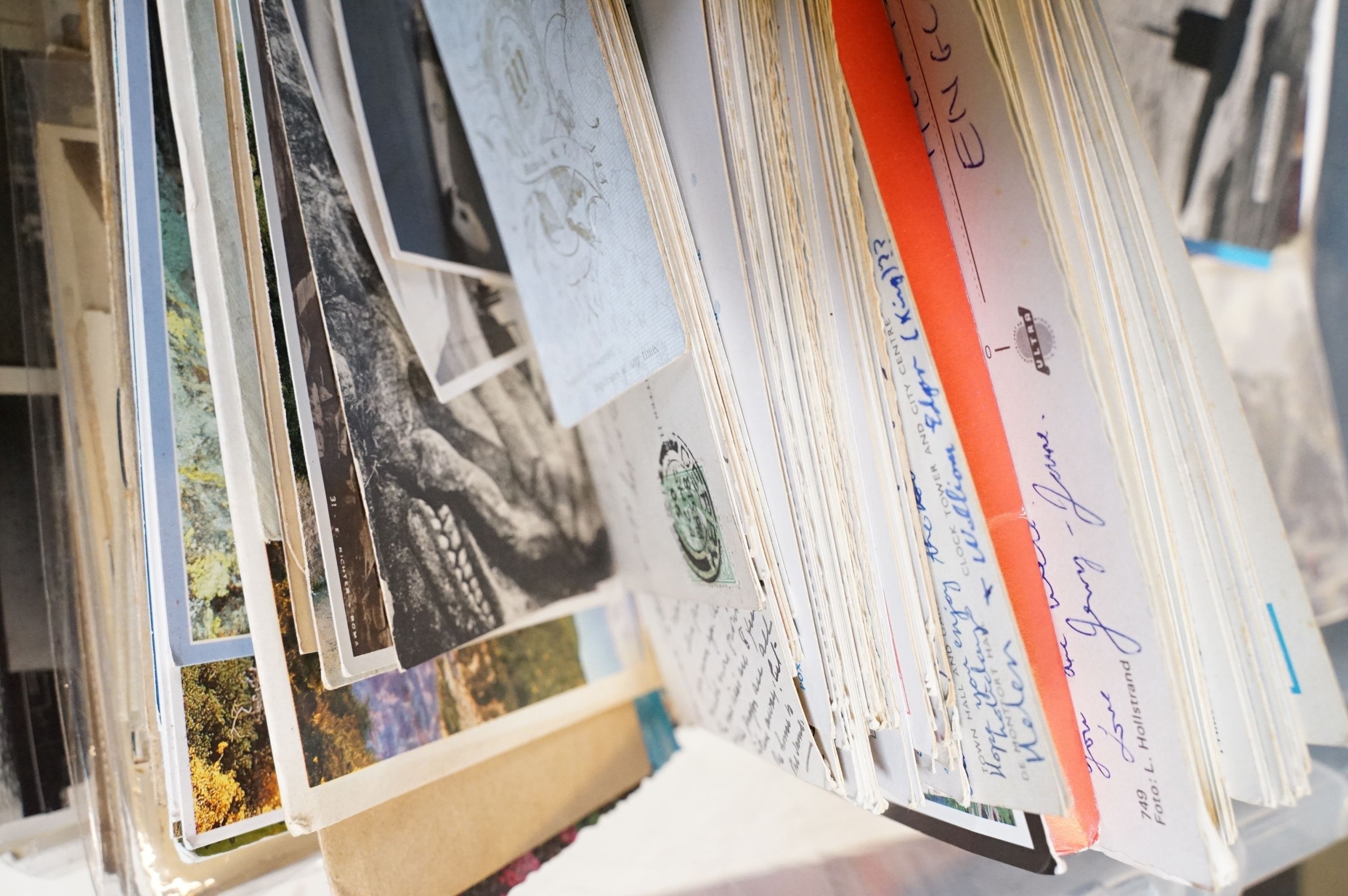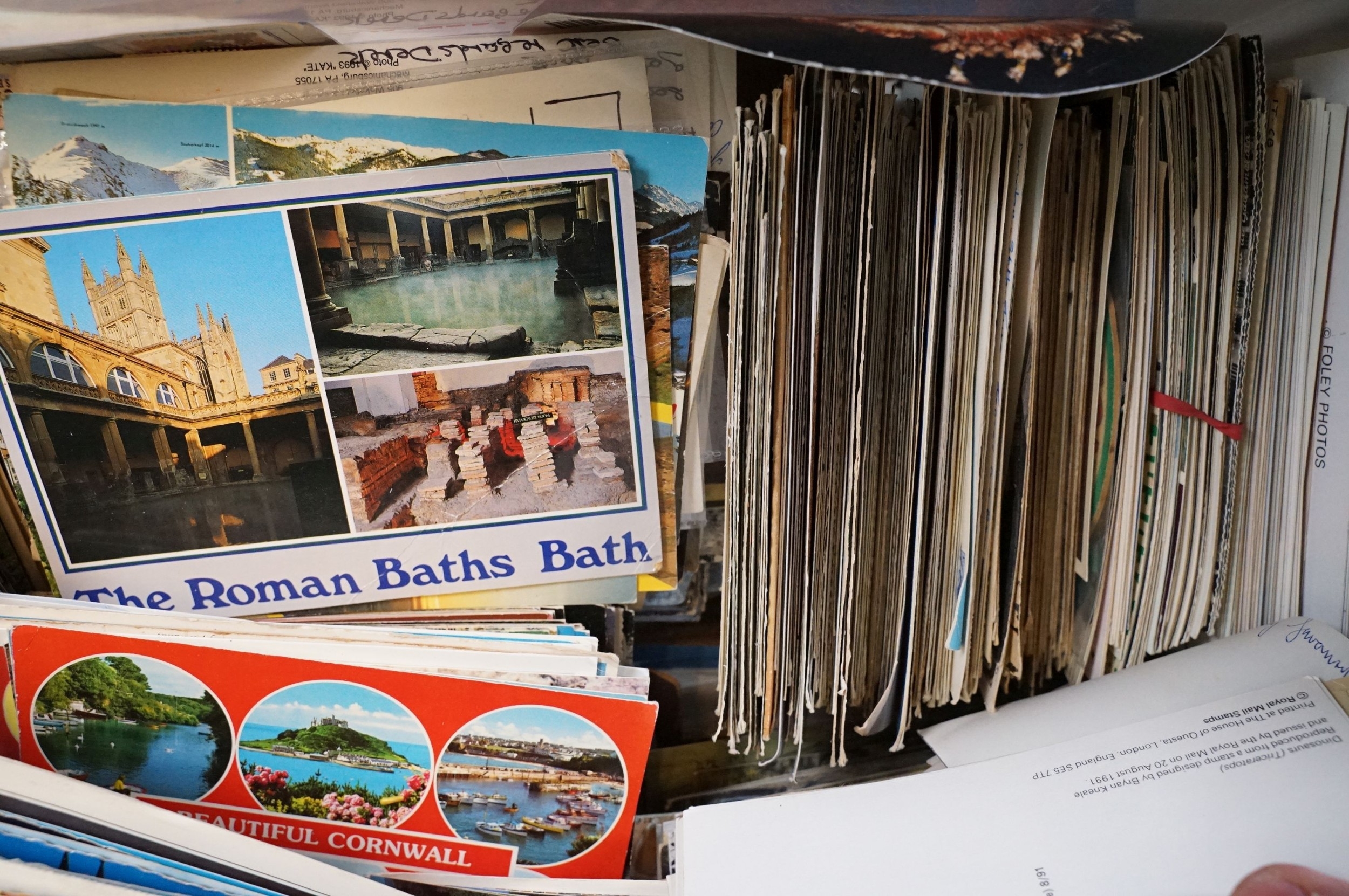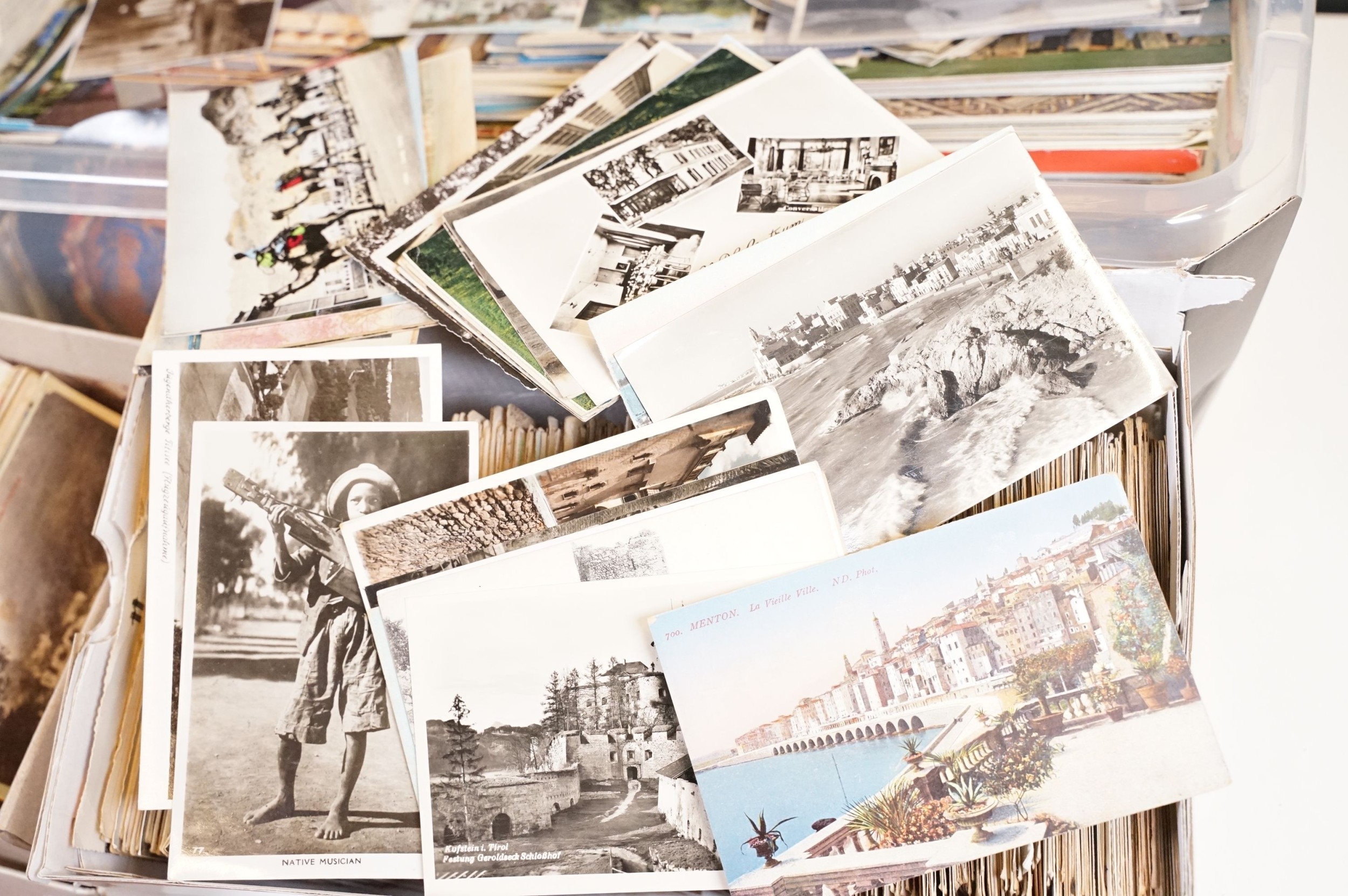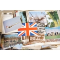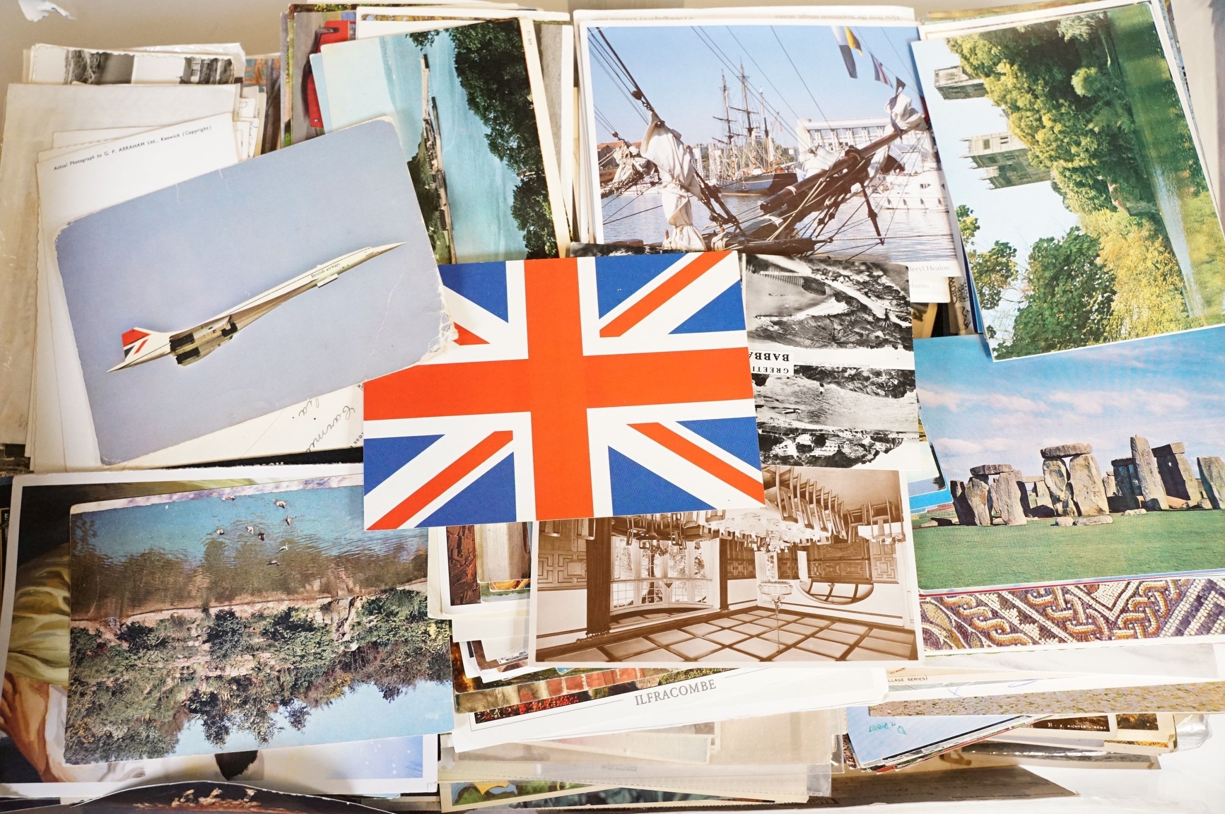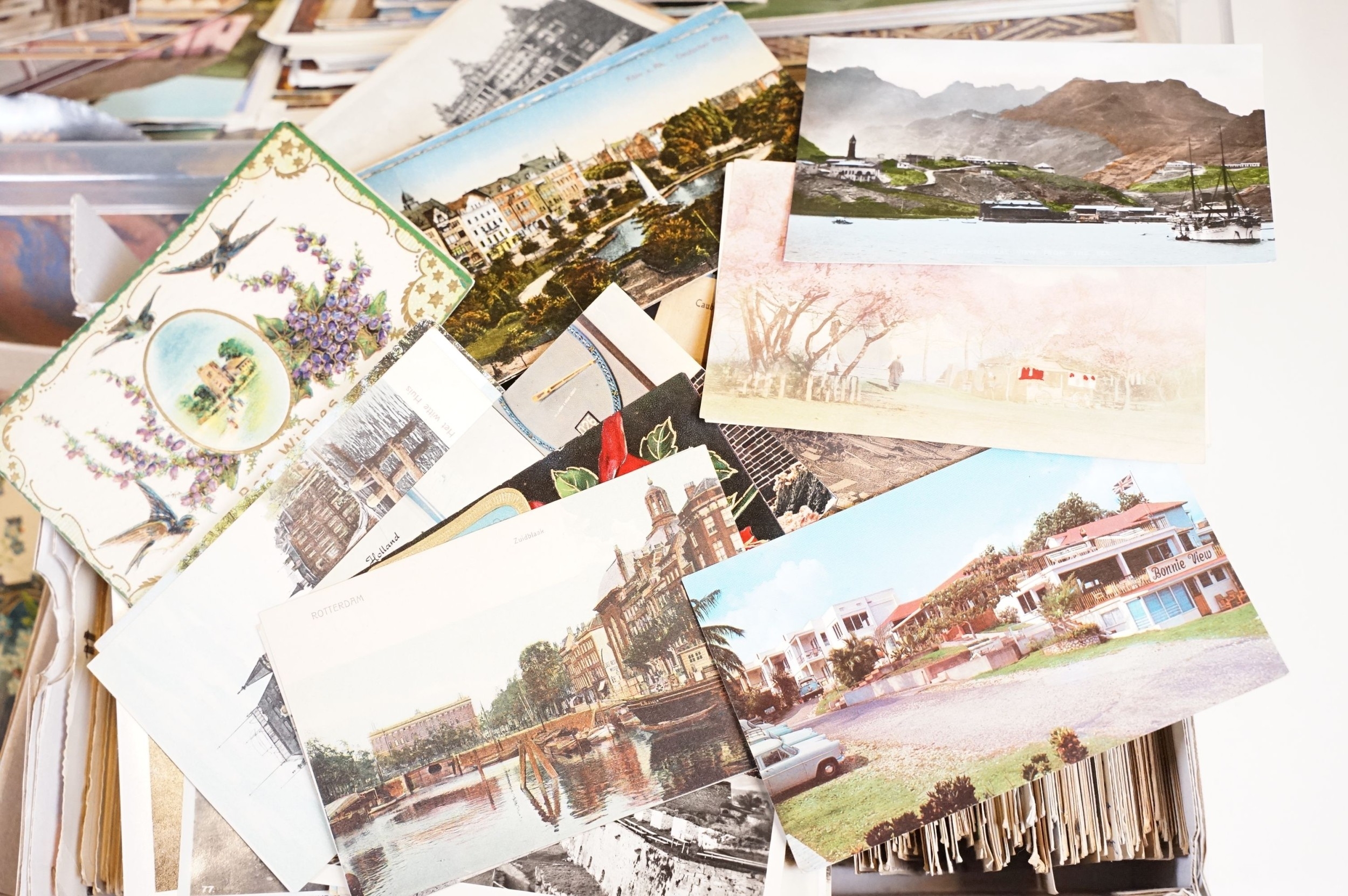 A large collection of early to mid 20th century postcards to include printed and real photo examples, mainly topographical and illustrated examples, within two boxes.