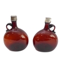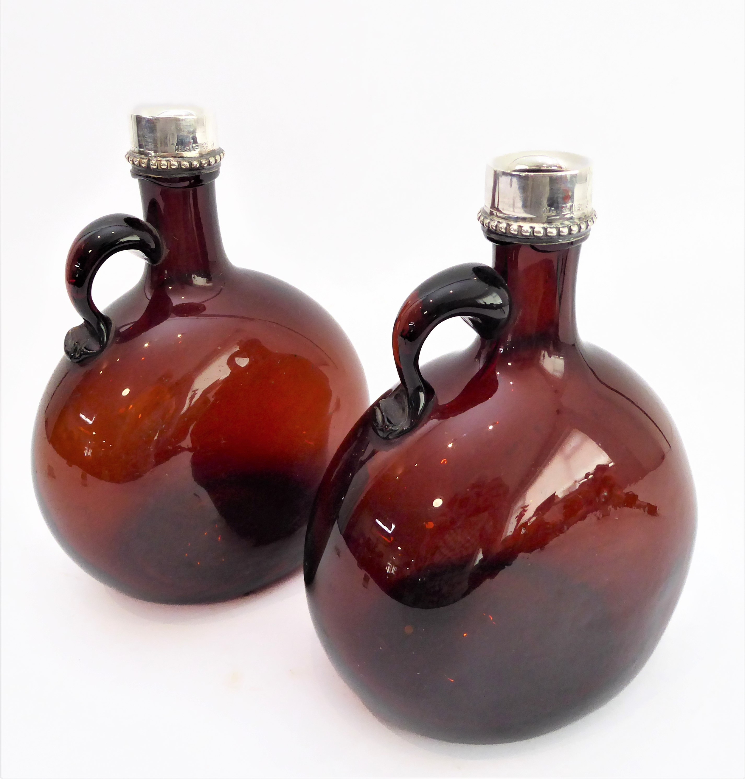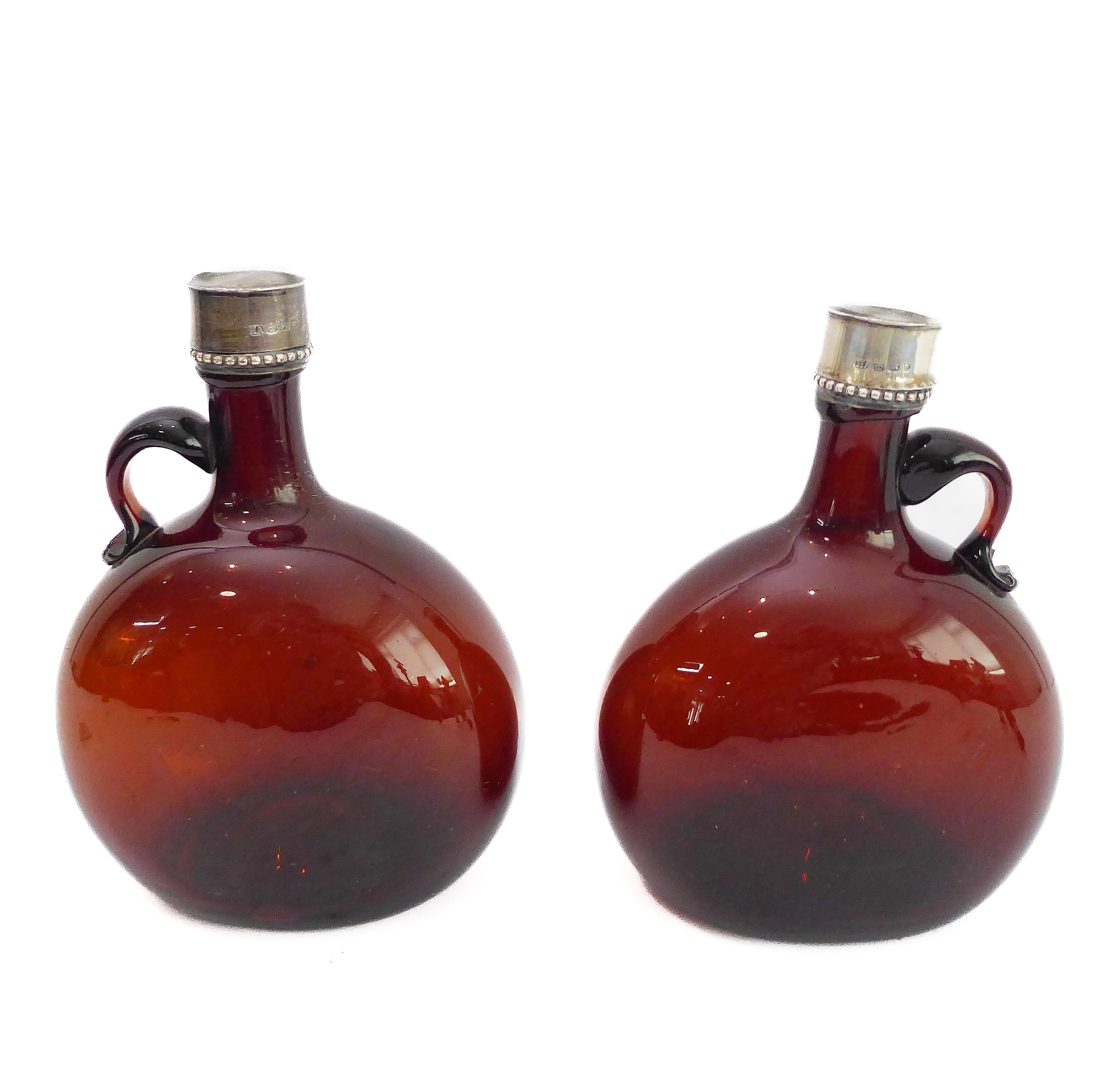 A pair of 19th century silver-mounted brown-glass flasks: the circular silver tops and neck ferrules assayed Sheffield (probably 1870s or 1880s) for Henry Atkins. (17 cm high)