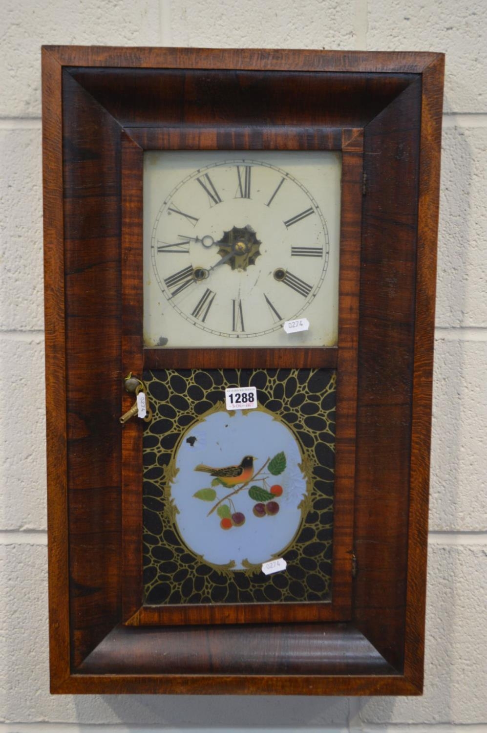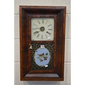A VICTORIAN ROSEWOOD AND MAHOGANY AMERICAN WALL CLOCK, 49cm x 66cm