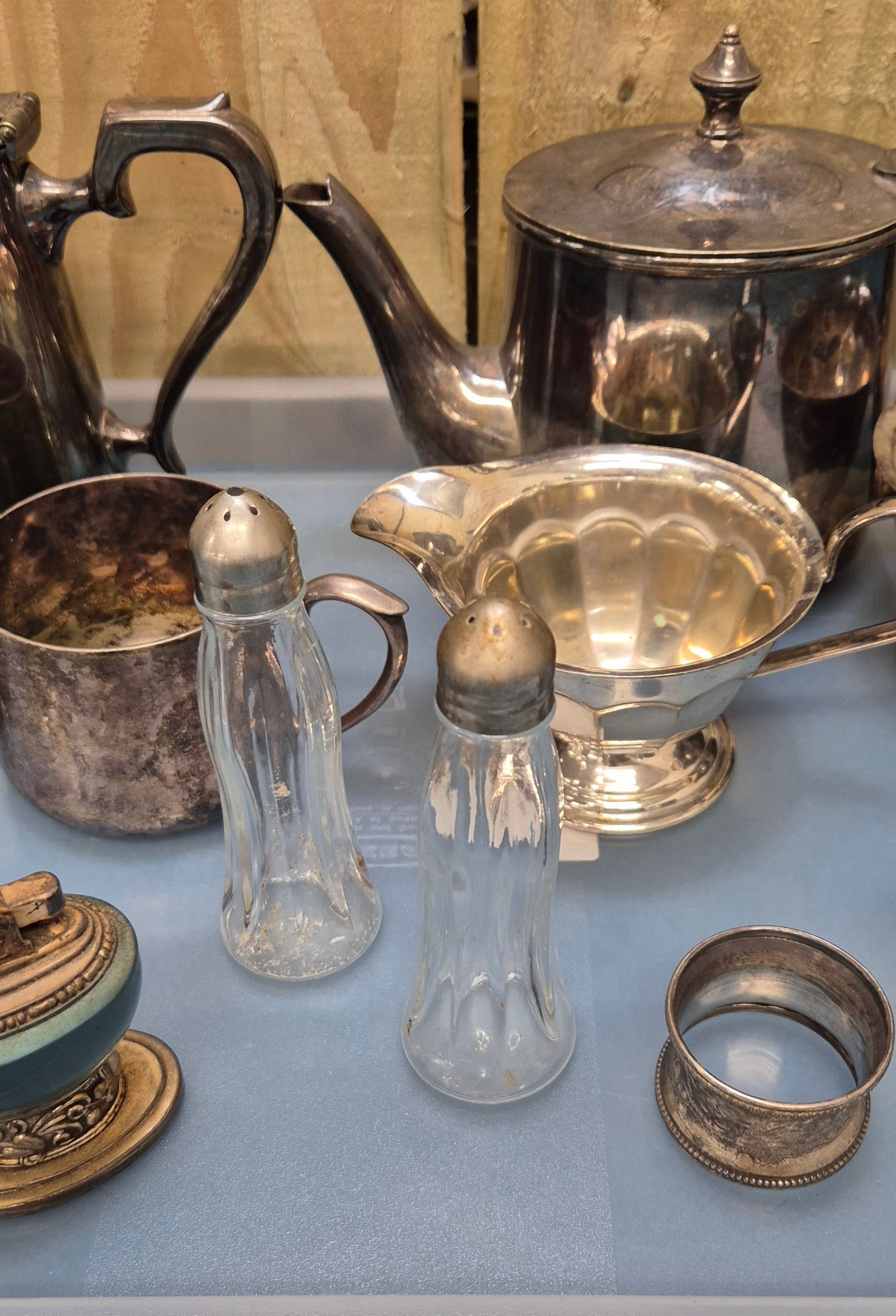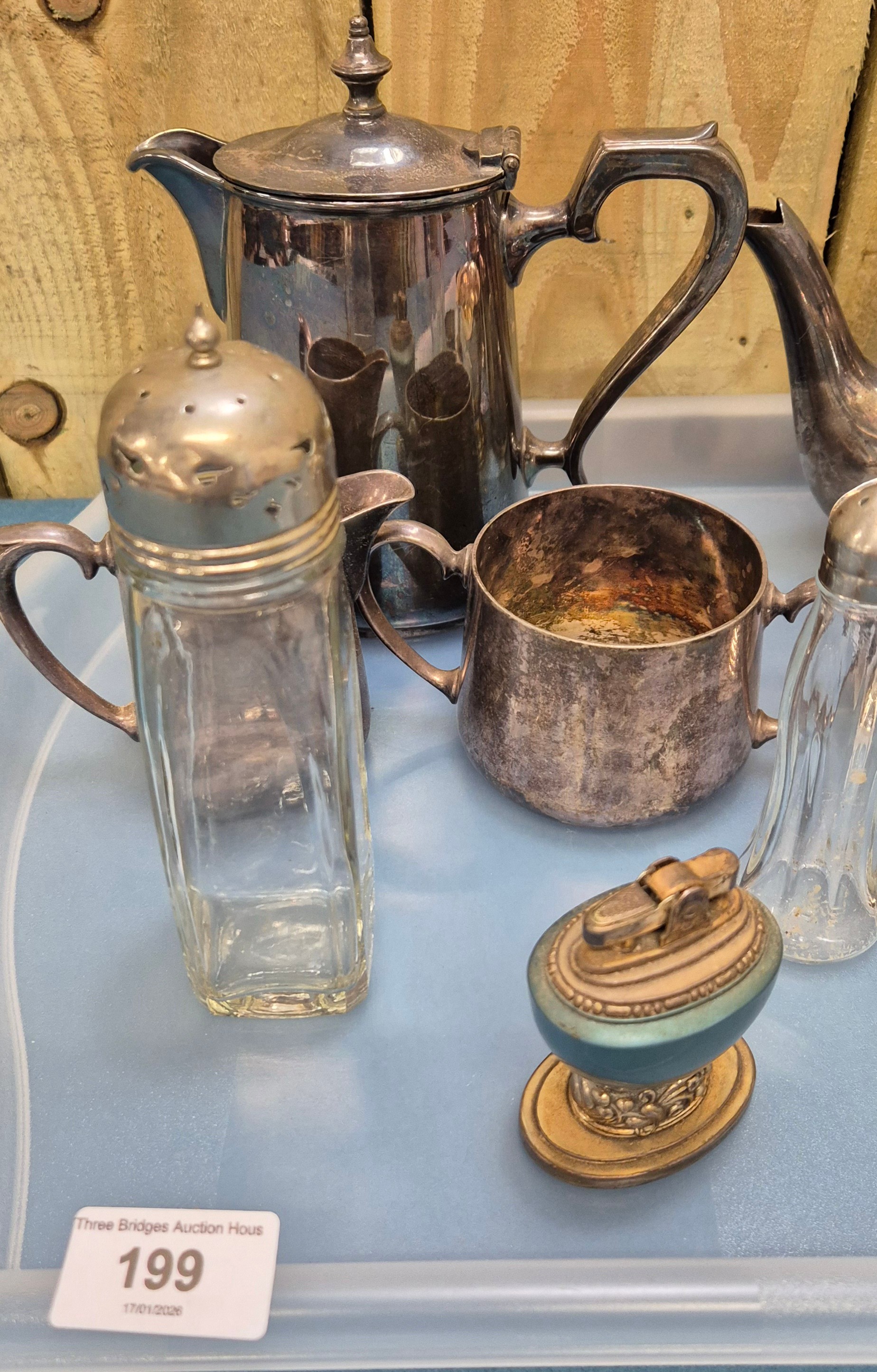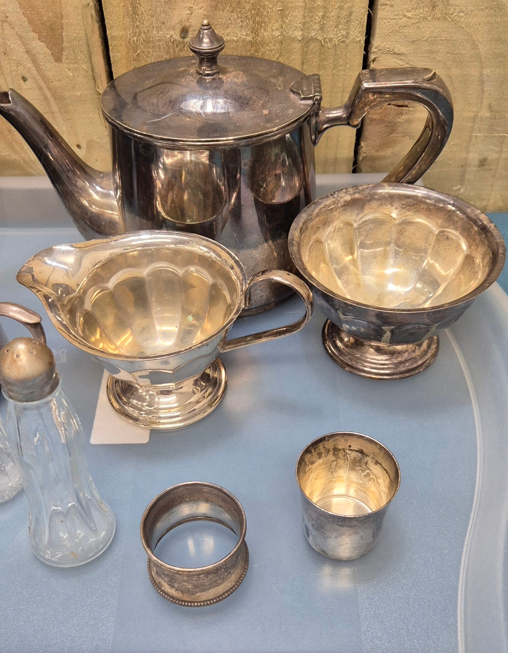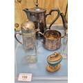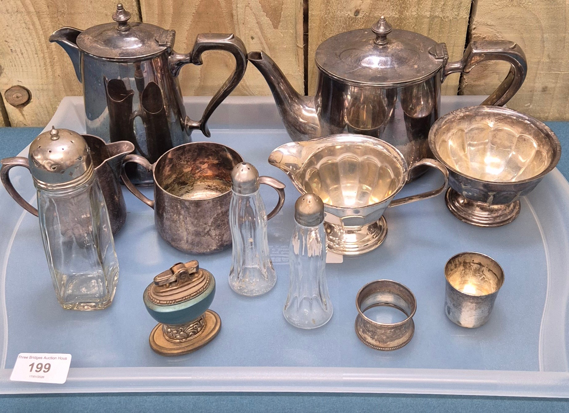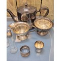 A Collection of silver plated wares and odds; Ronson Leona raised table lighter. Silver napkin ring and tea service.