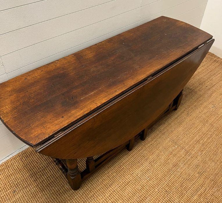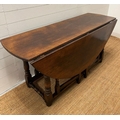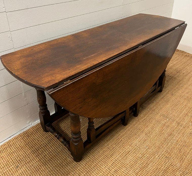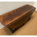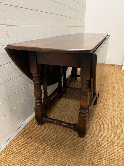 A large drop leaf table on turned legs (160 cm x 153cm max)
