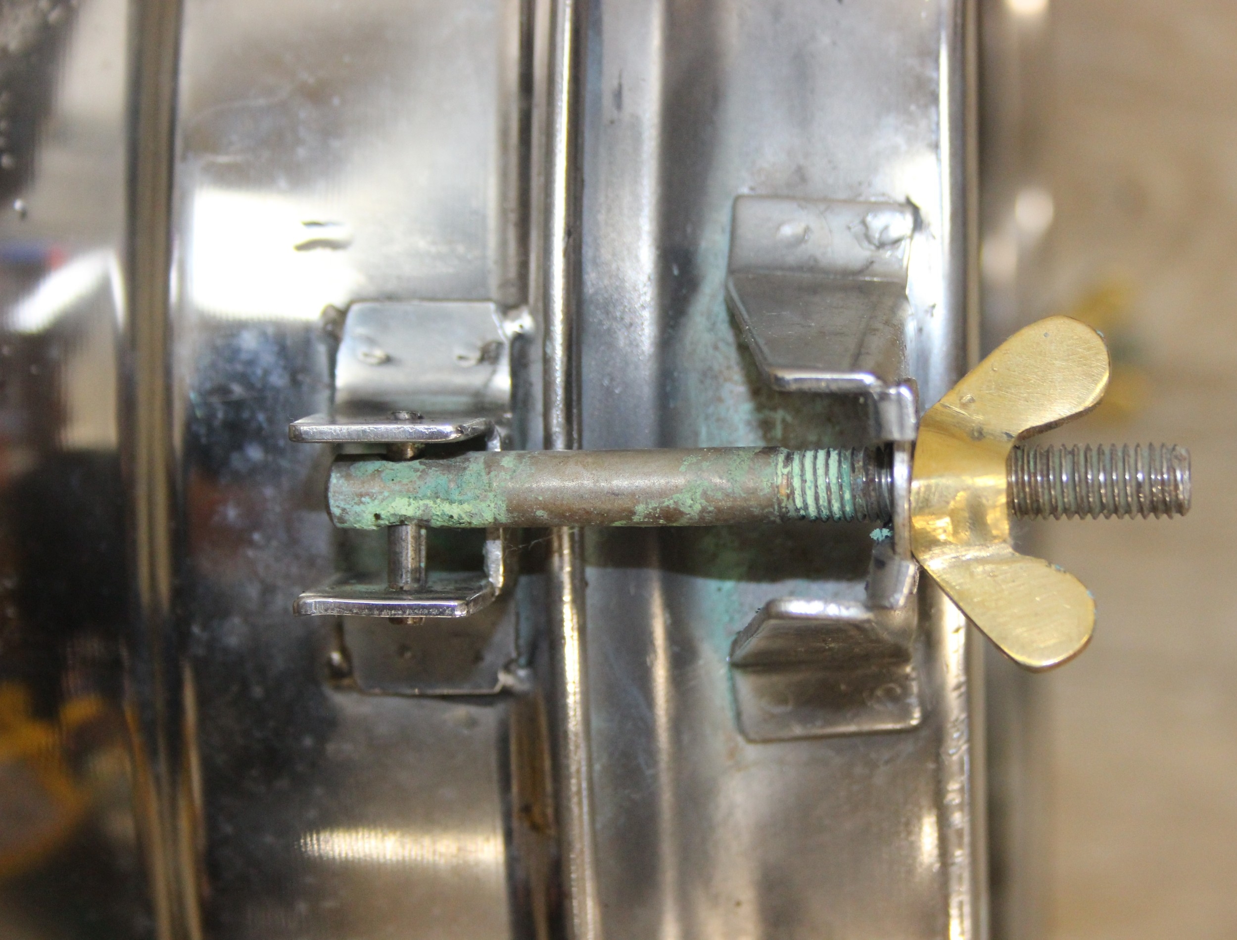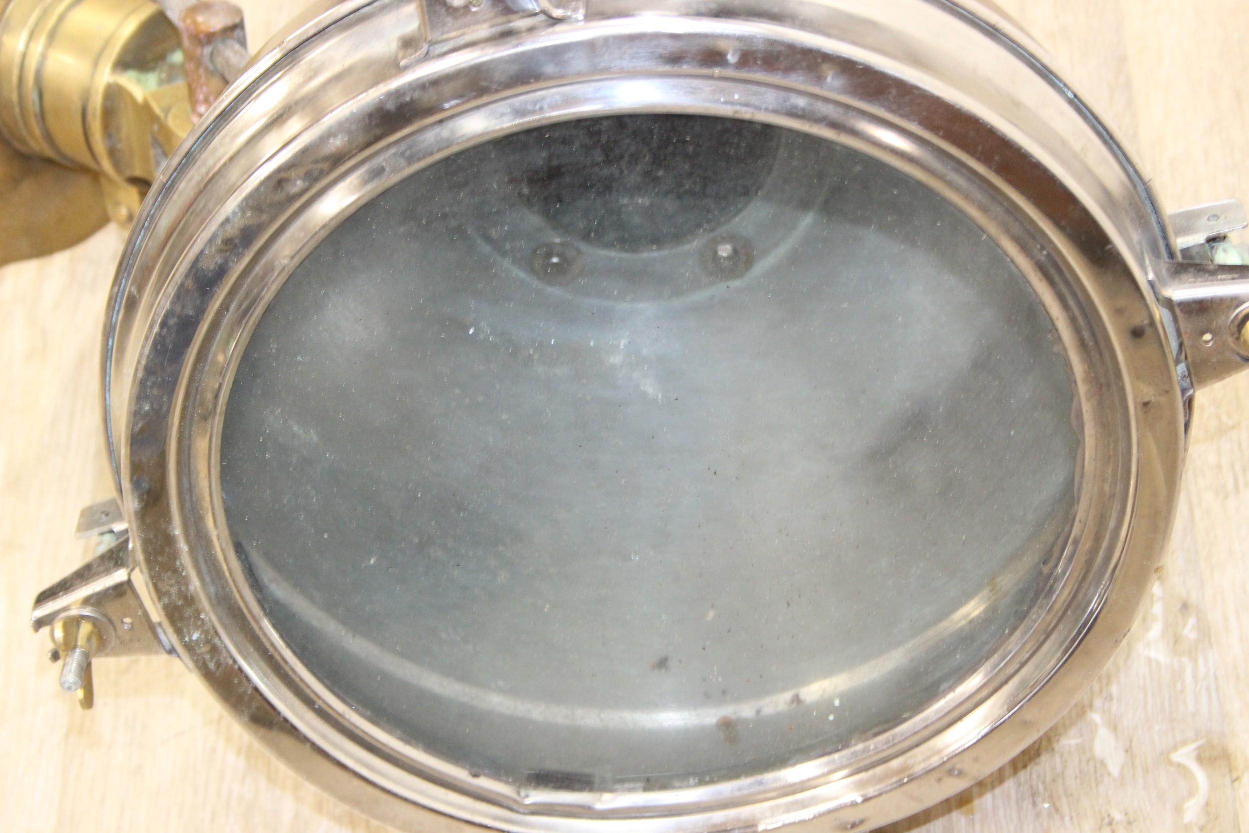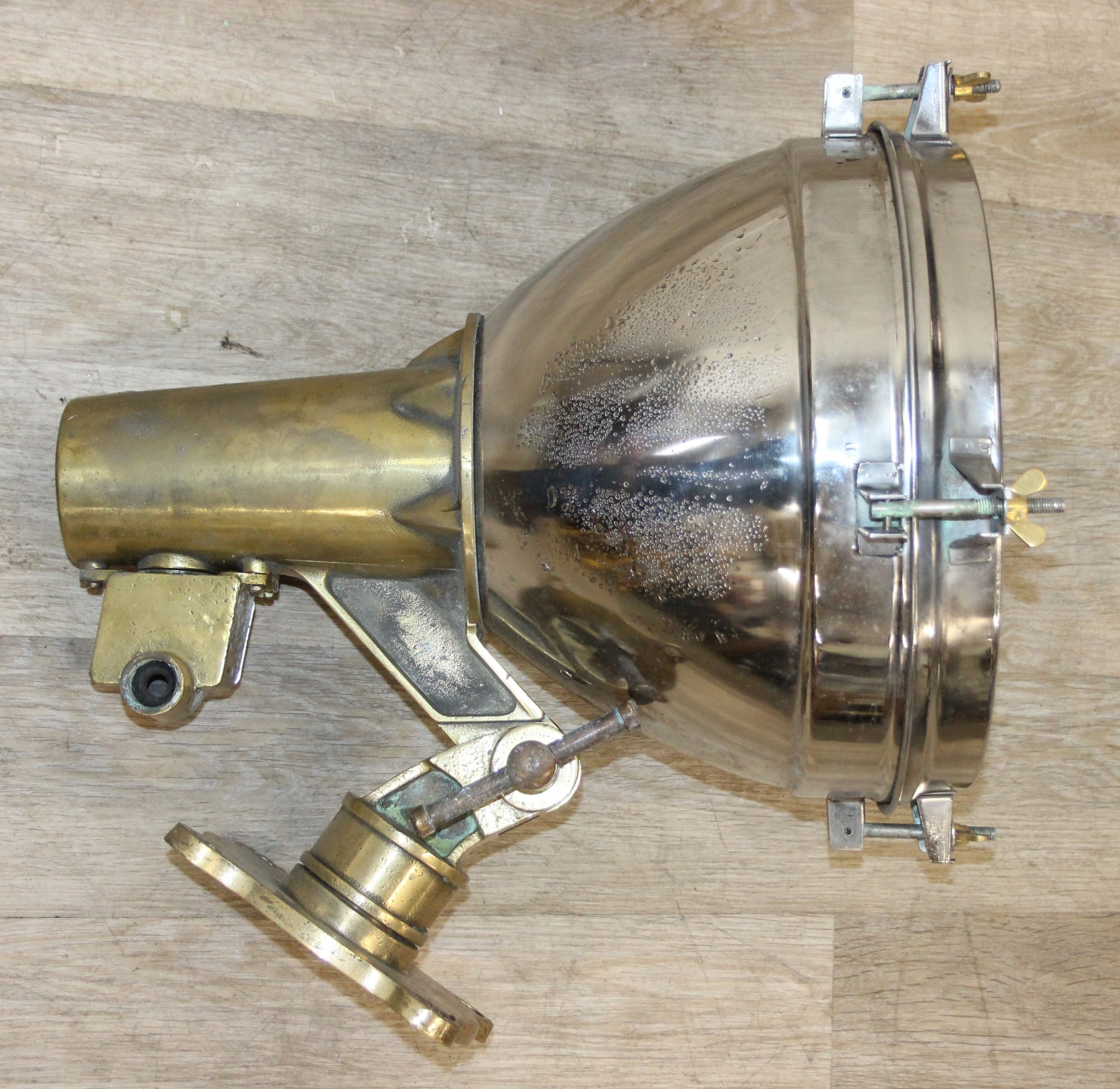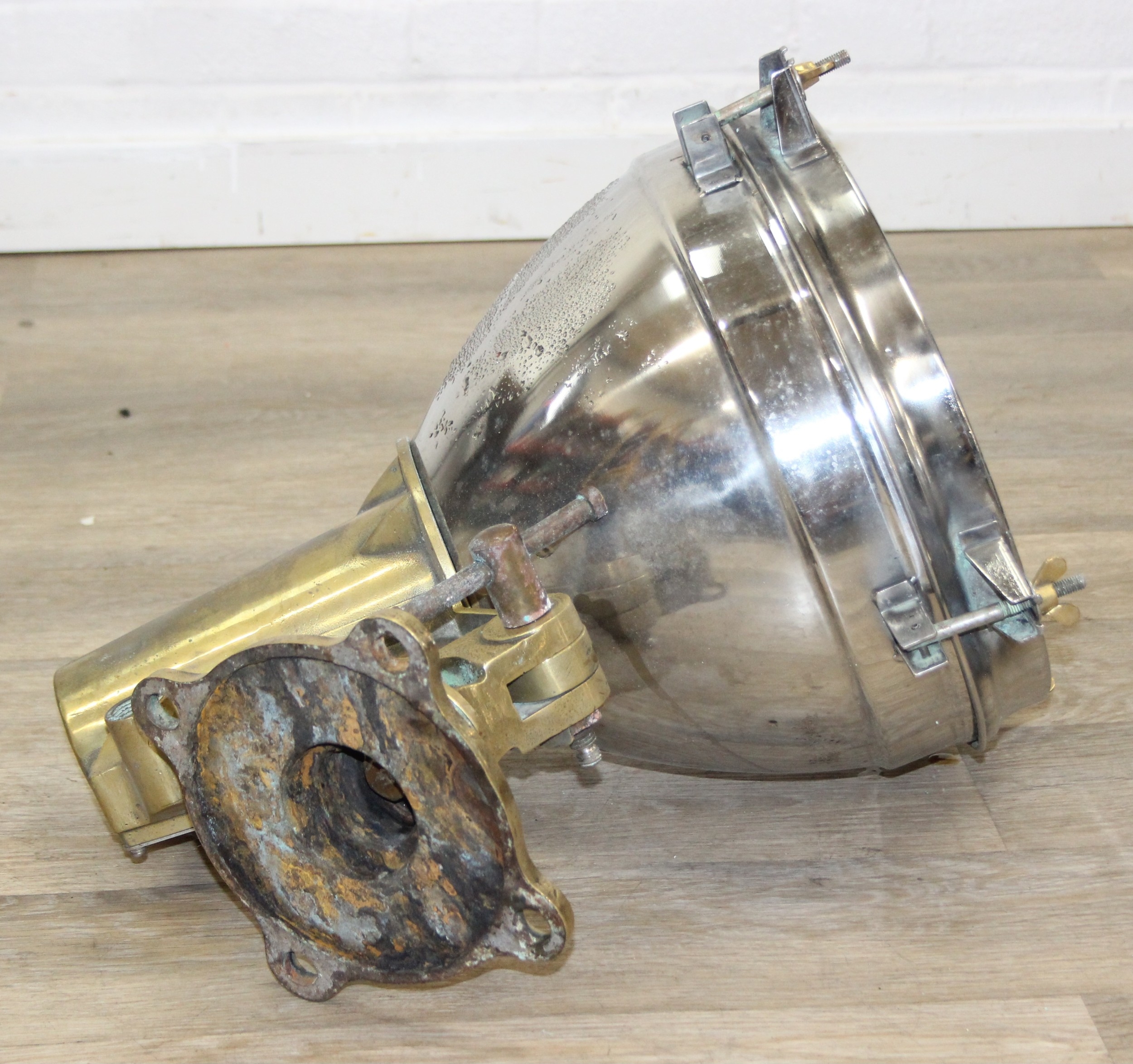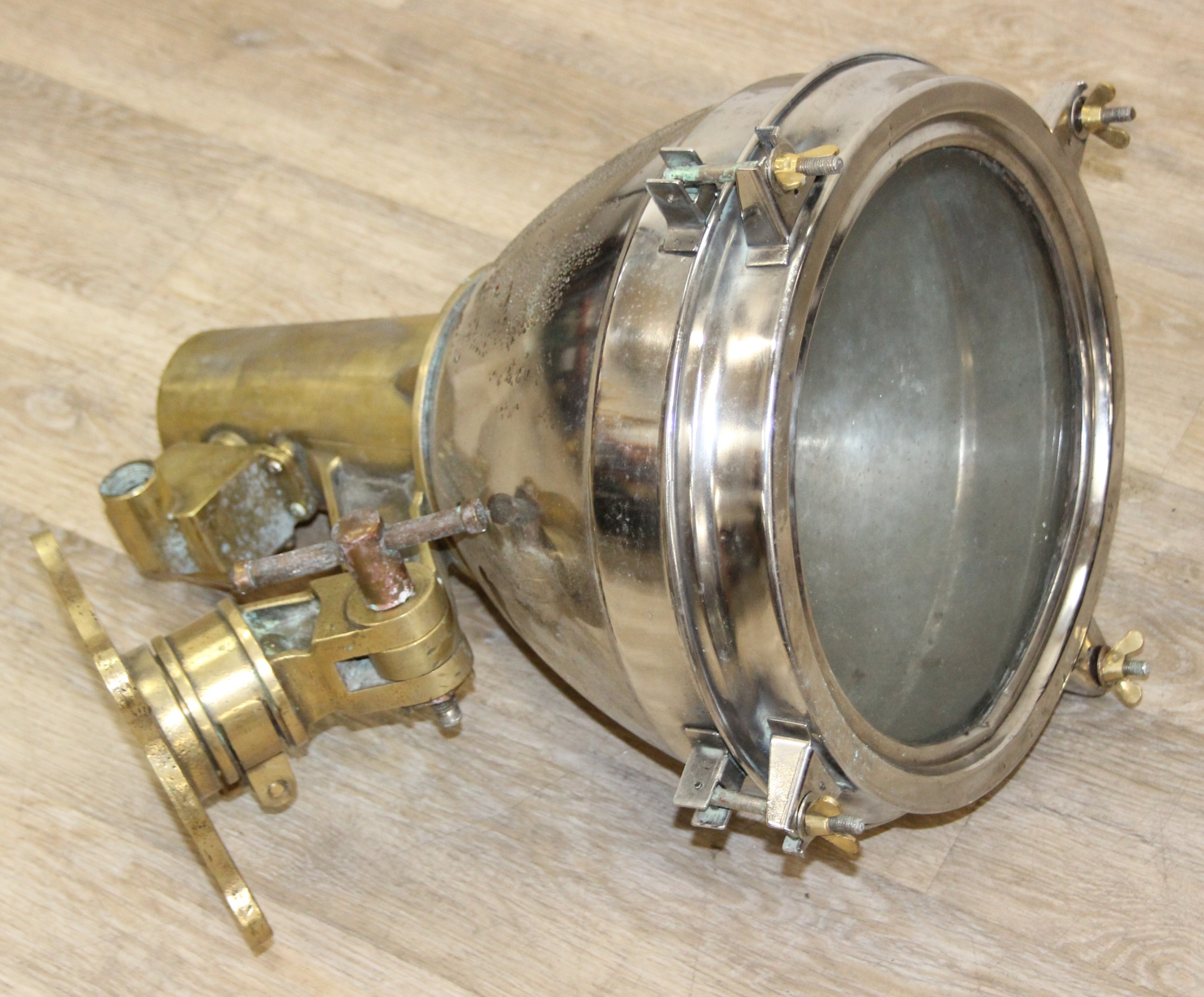 Marine lamps - chrome and brass lamp with heavy duty brass bracket and four wingnut fastenings to lens, diameter 34cm x depth 50cm excluding bracket