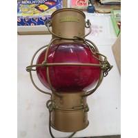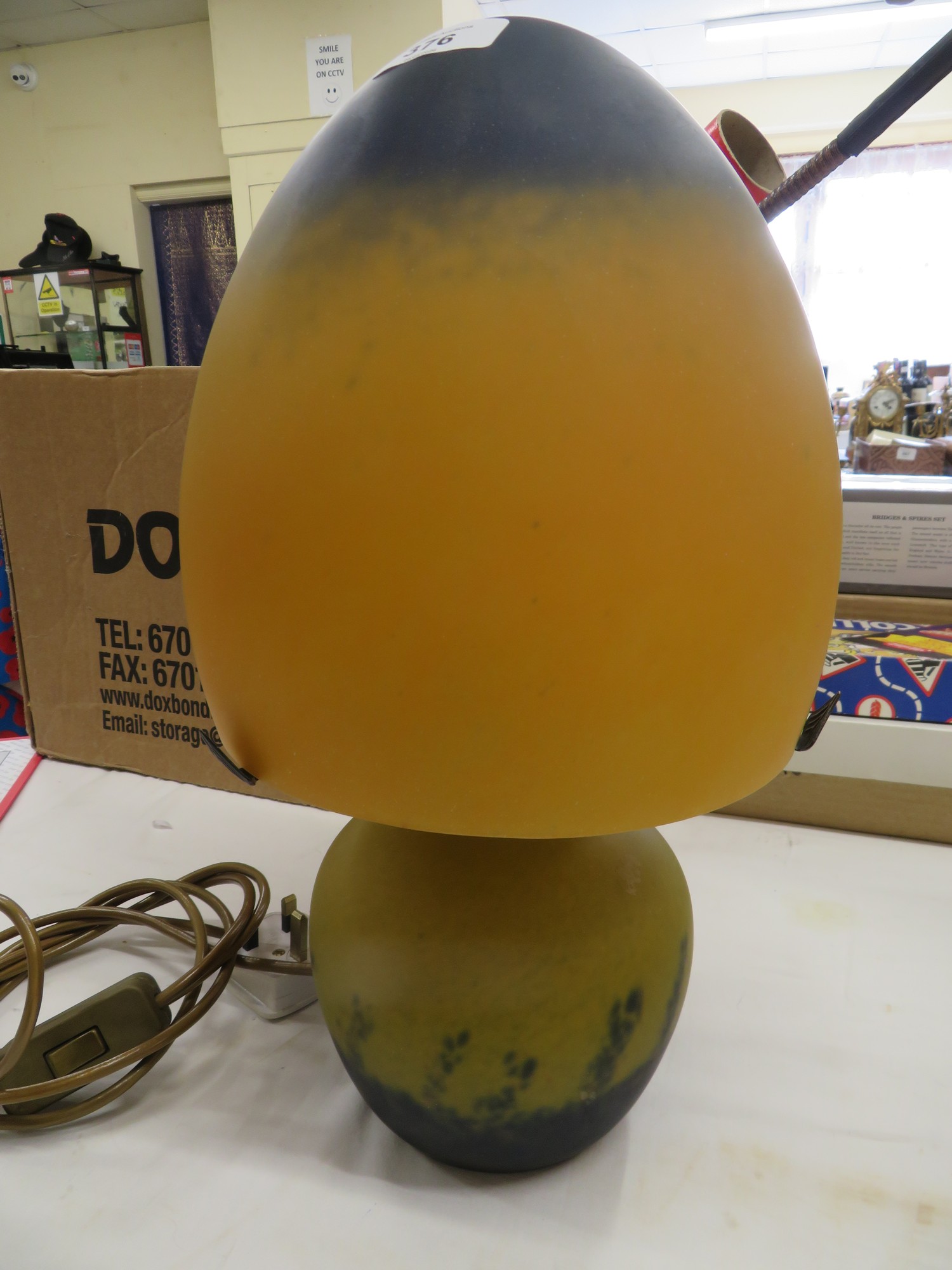 Mottled orange and blue glass mushroom lamp in the style of Galle