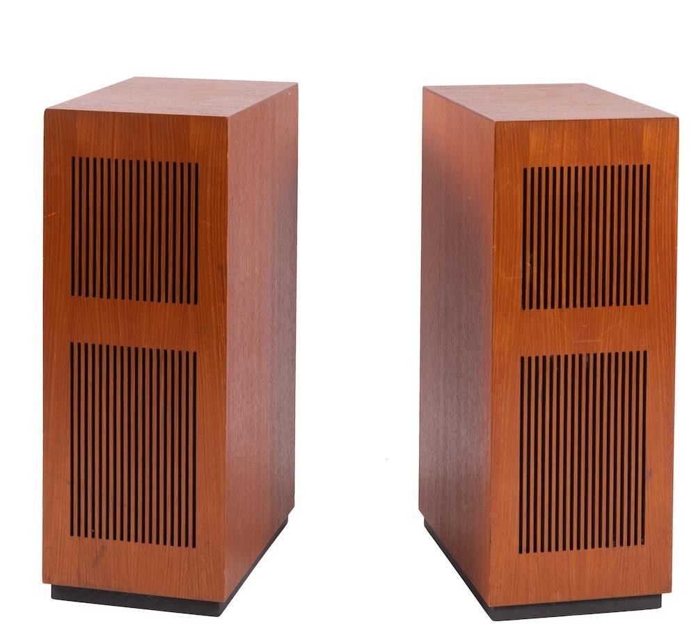 A pair of rectangular teak music speakers, circa 1960s; the fronts with two tiers of pierced fluting; 68cm high, 26cm wide, 38cm deep
