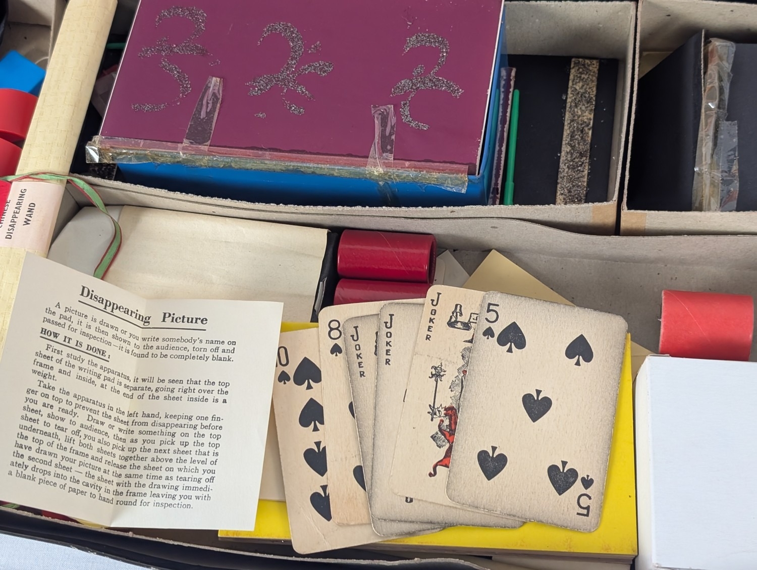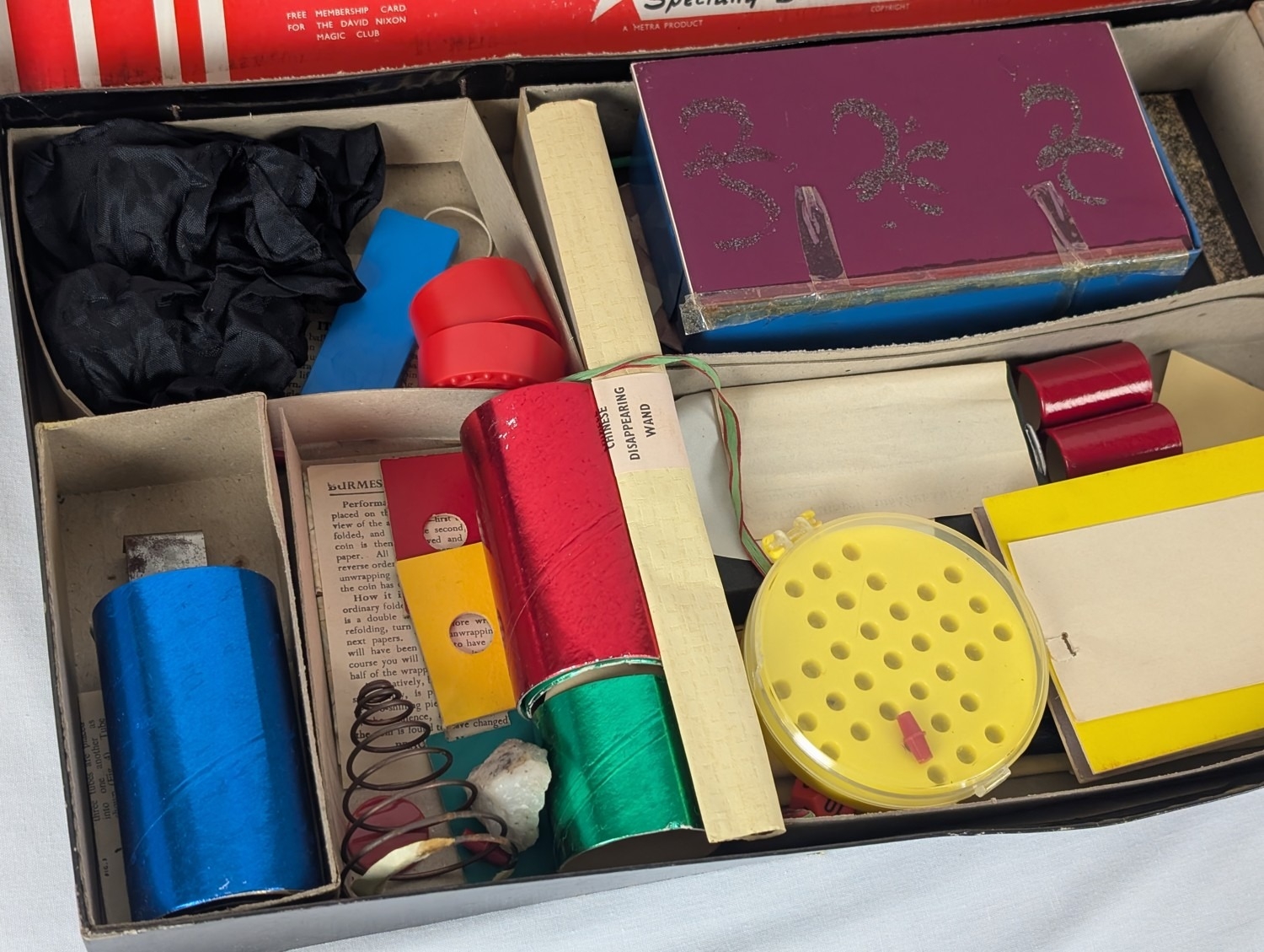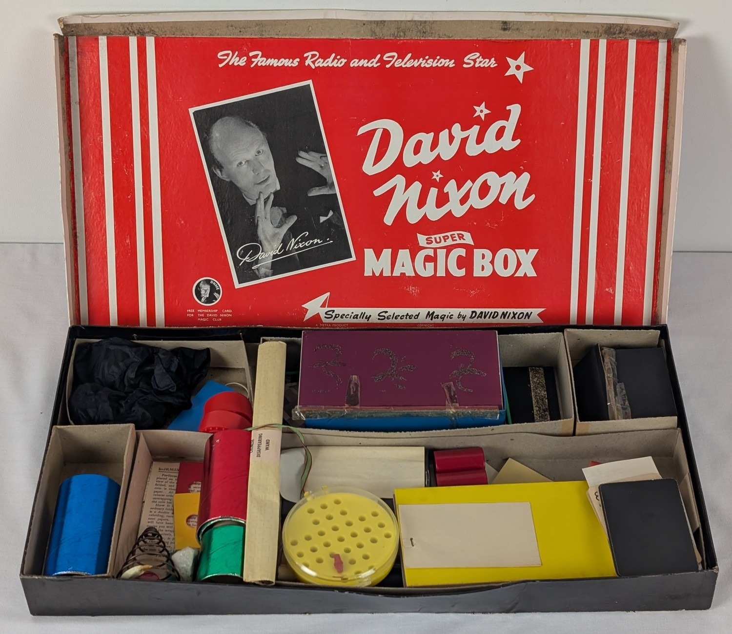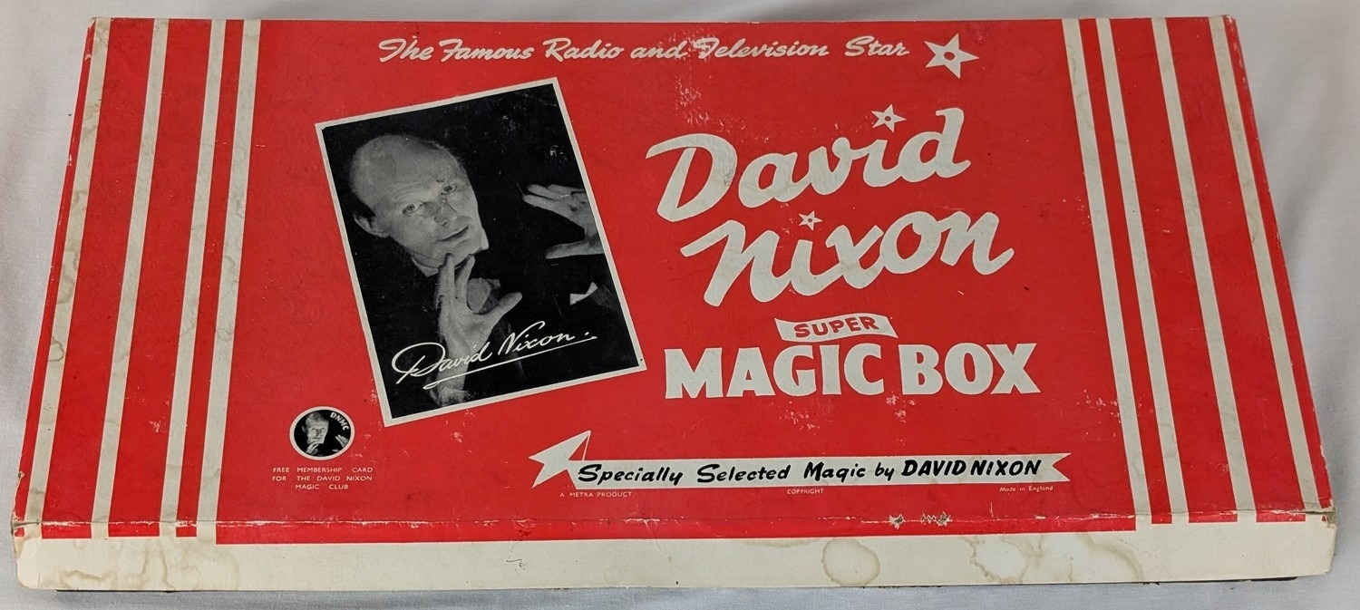 Vintage David Nixon "Super Magic Box" boxed magic set, containing various magic trick props.