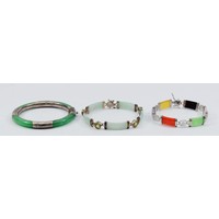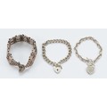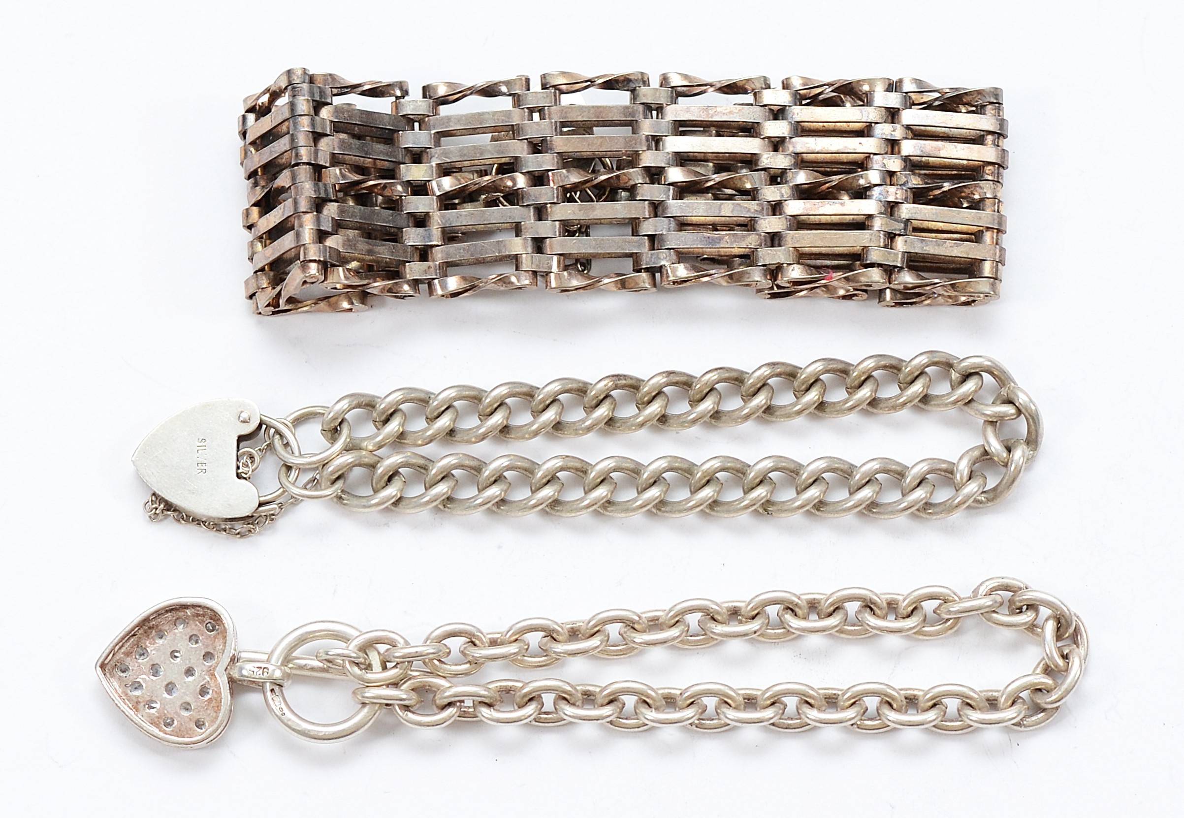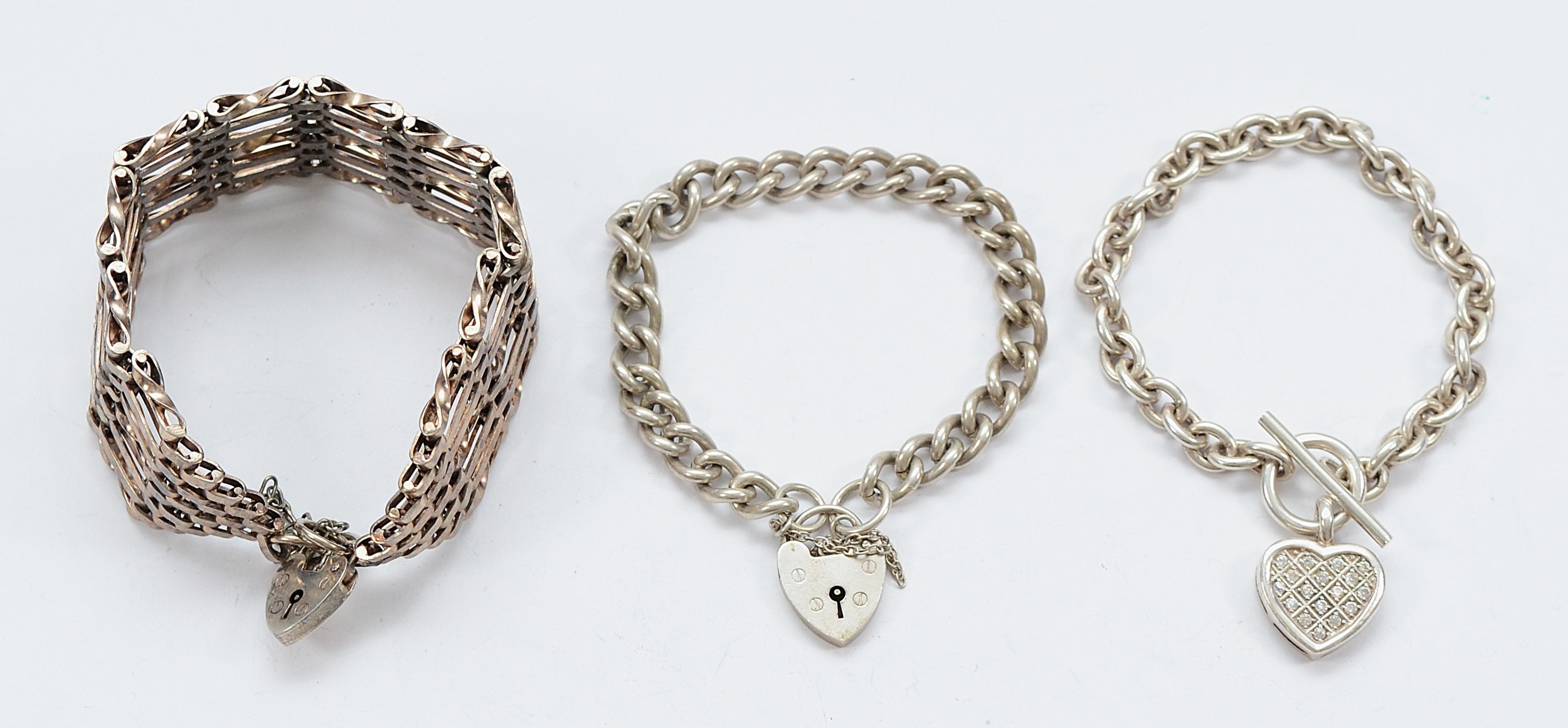 A 925 silver gemset curb link bracelet with heart tag, with two silver bracelets with heart padlock clasps, 83g