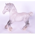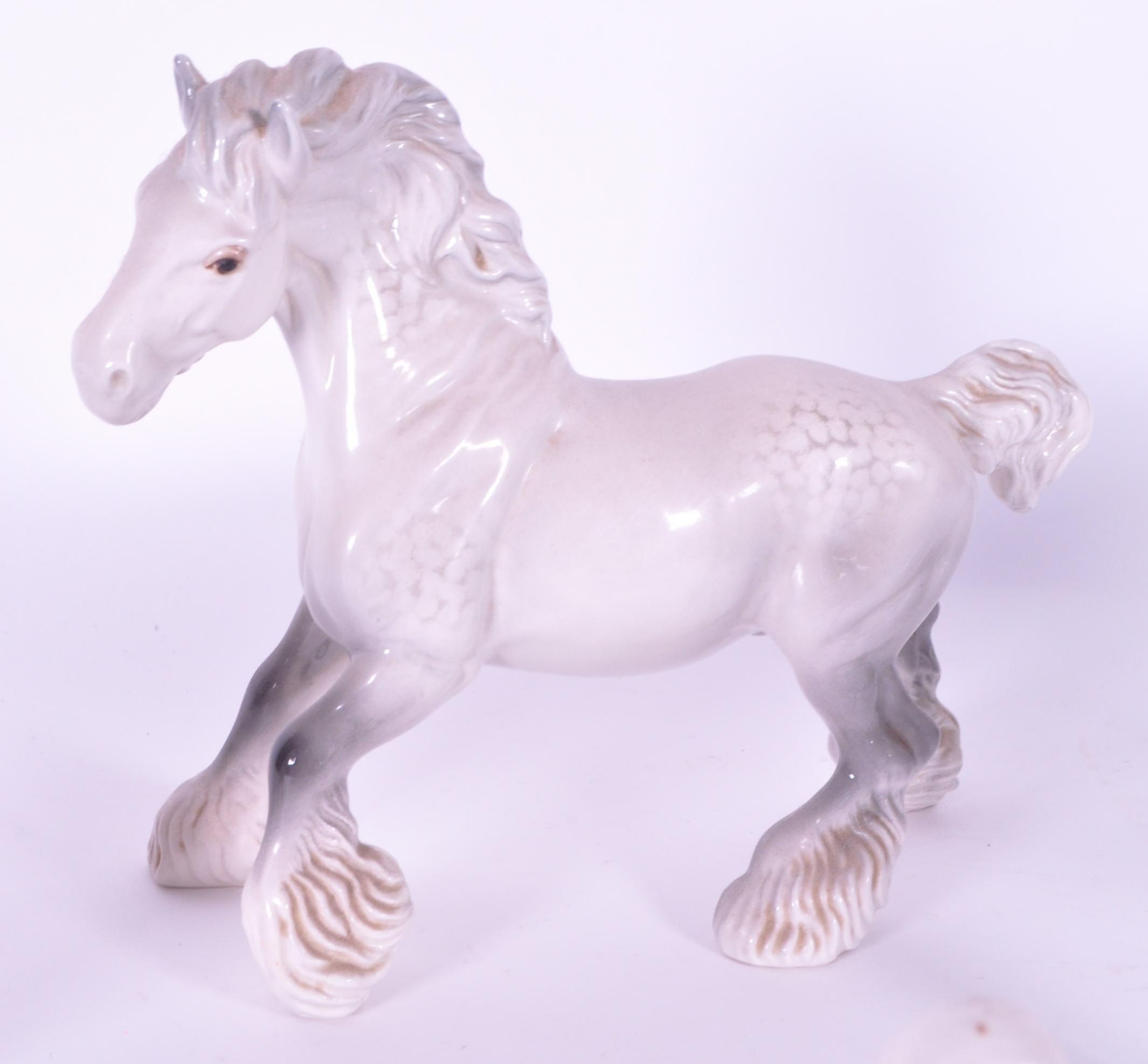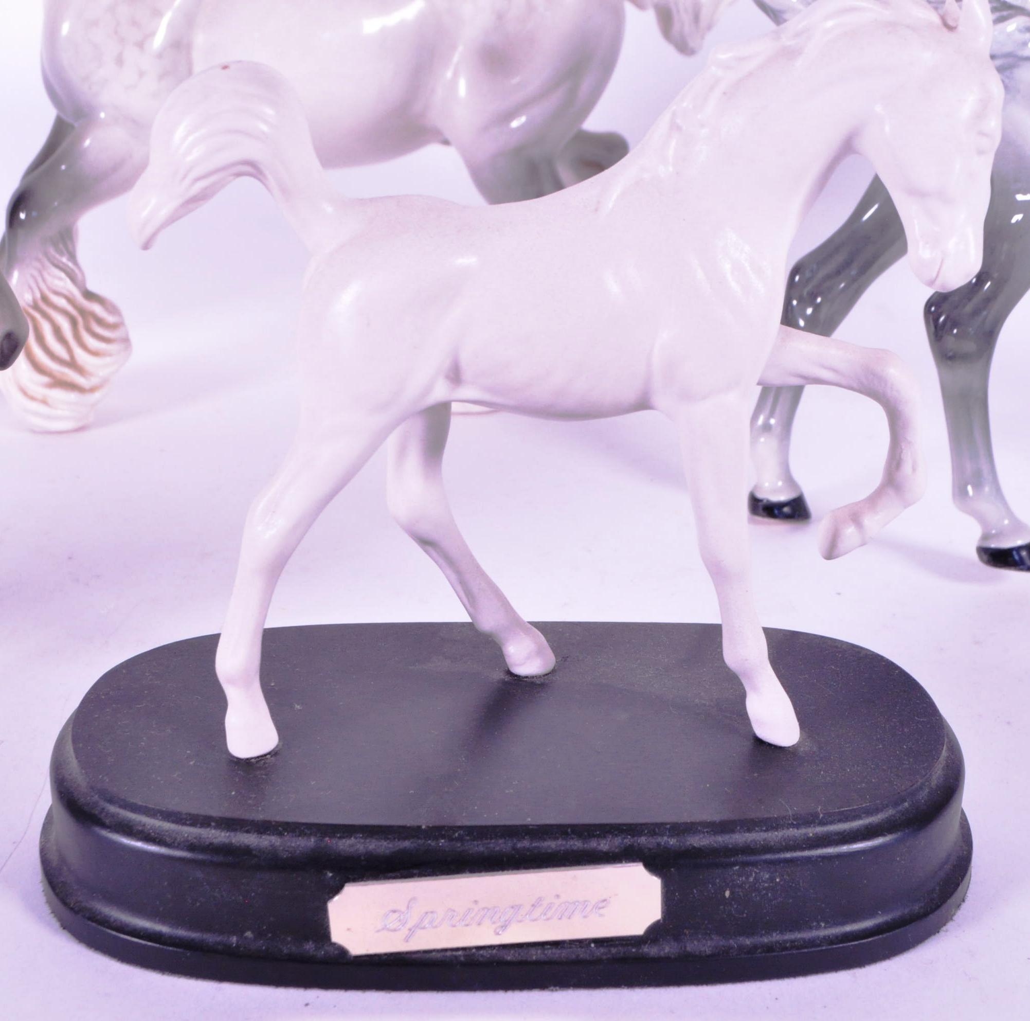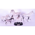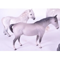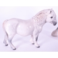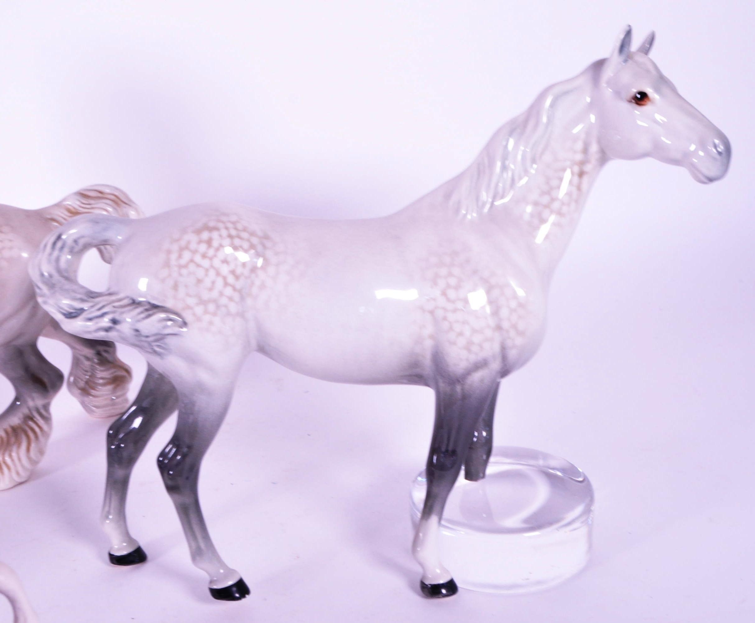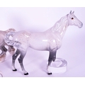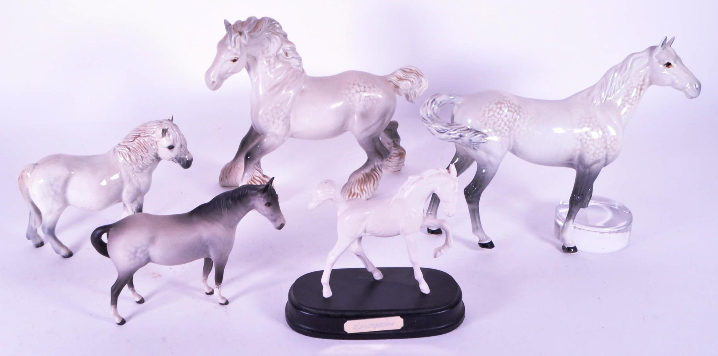 Beswick / Royal Doulton - A collection of porcelain china horse figurines / statues. Including a grey Shetland Royal Doulton pony, cantering shire horse 975, dapple grey horse and another dapple grey, AF. Together with a springtime horse on plinth stand.