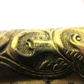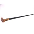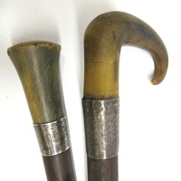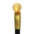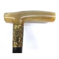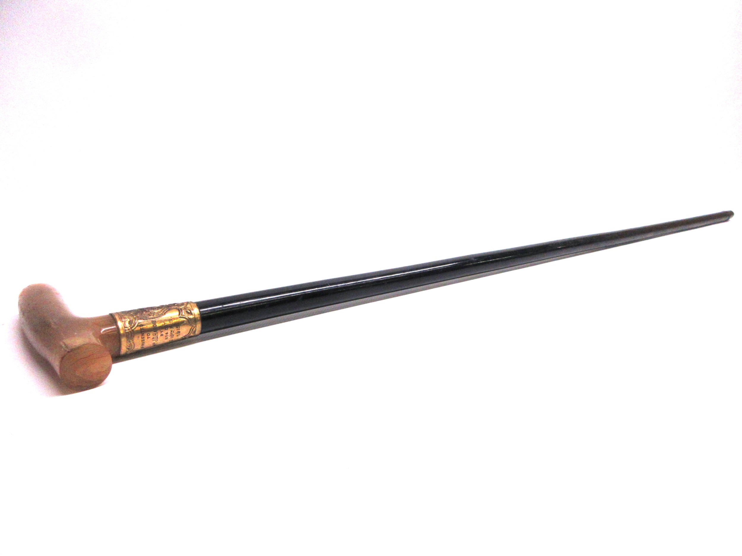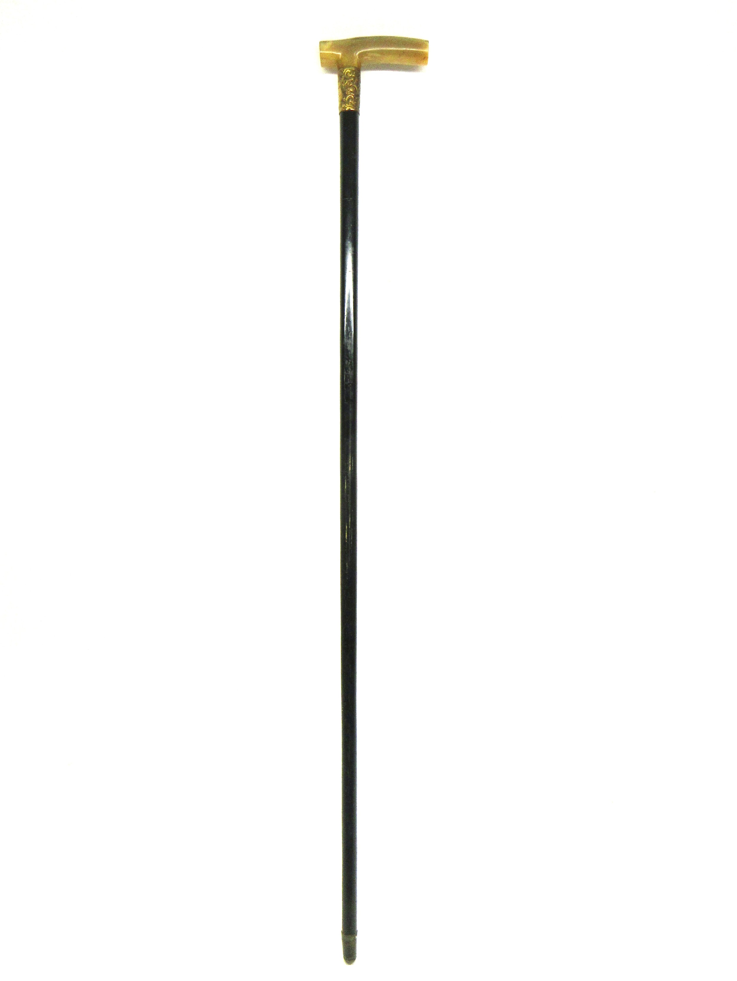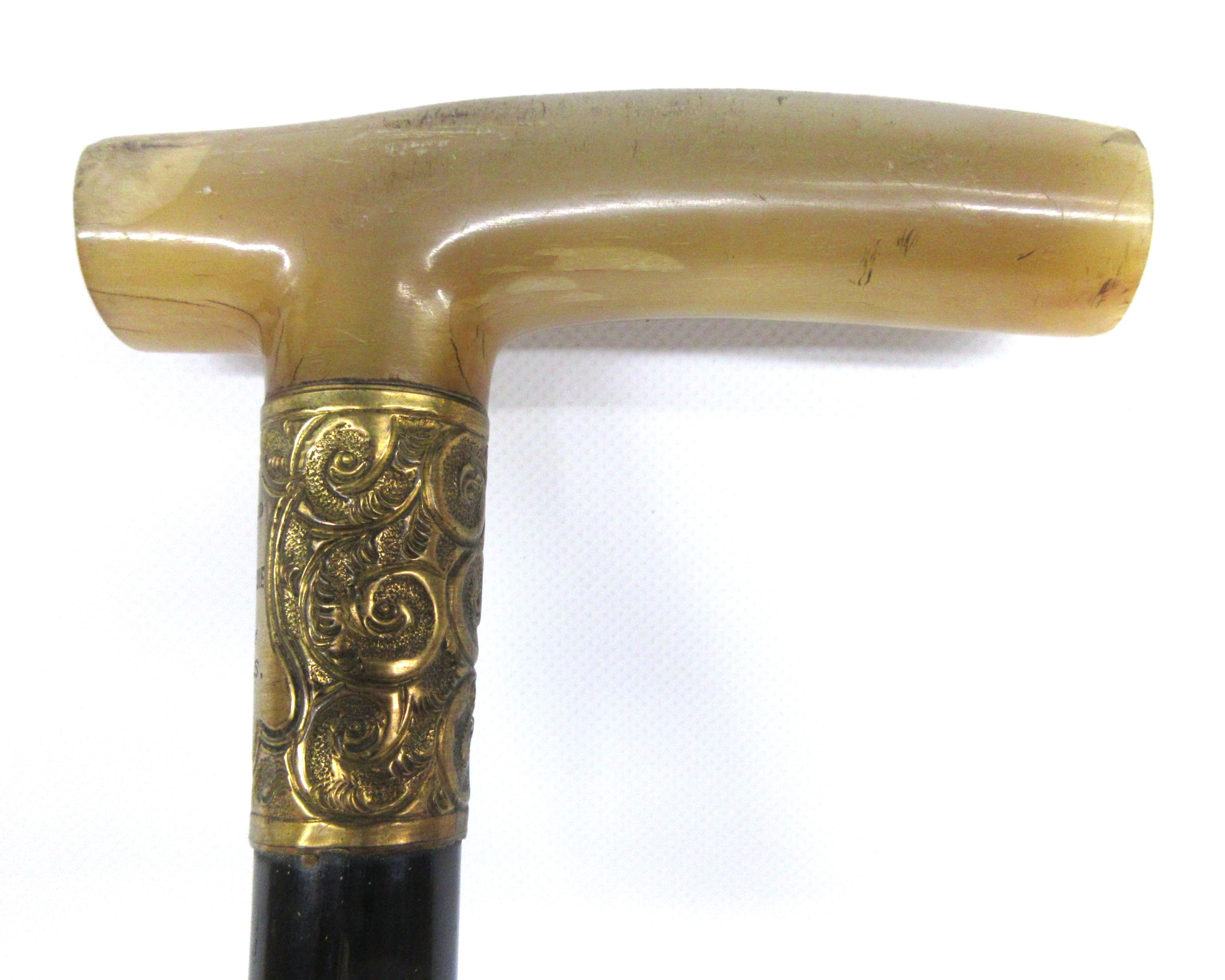 George V WWI solid ebony L-shaped walking stick with hallmarked 18kt rolled gold collar by Henry Perkins & Sons, London, c1915; metal mounted ferrule & polished pale horn handle; approx. H 91cm, collar further features ornate filigree scrollwork & escutcheon inscribed 'Presented to Mr J D Hardie by No. 4 COY (Company) 2/10th RS (Royal Scots) 1915'; believed to be gifted to the father of Private John T Hardie, killed in action on 12th July 1915, Gallipoli during 'the Charge' on the Turkish trenches at Achi Baba Nullah; his brother, Lance Corporal James Hardie, was also killed in action on 30th July 1916 during Battle of the Somme, France, Qty. 1