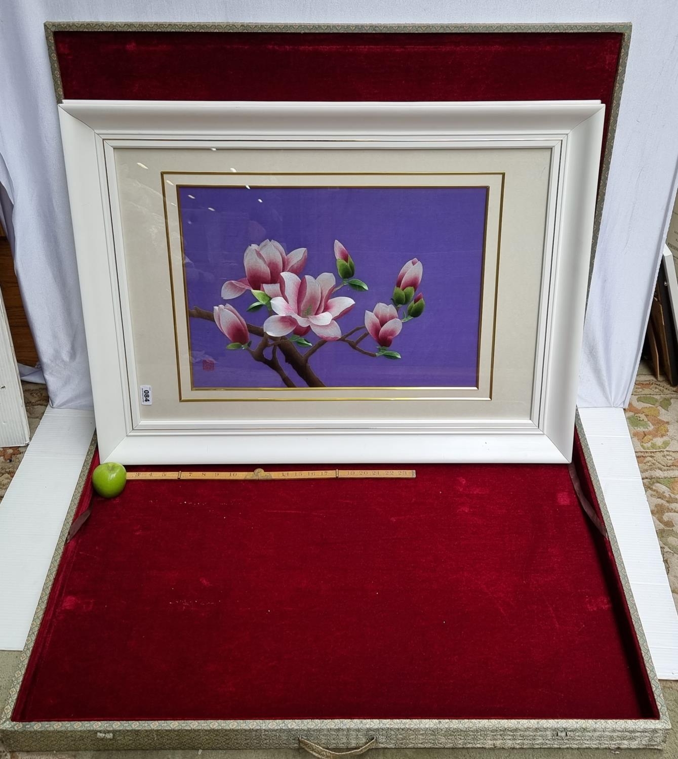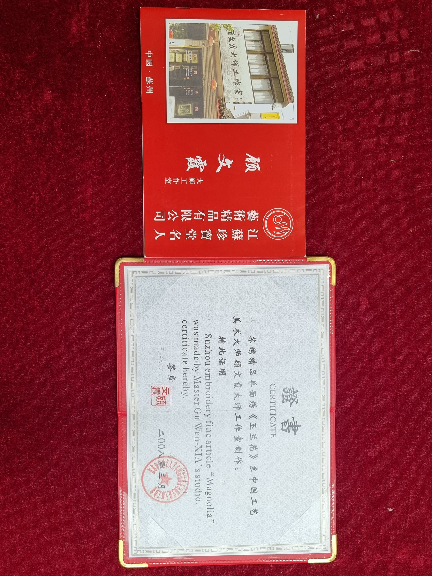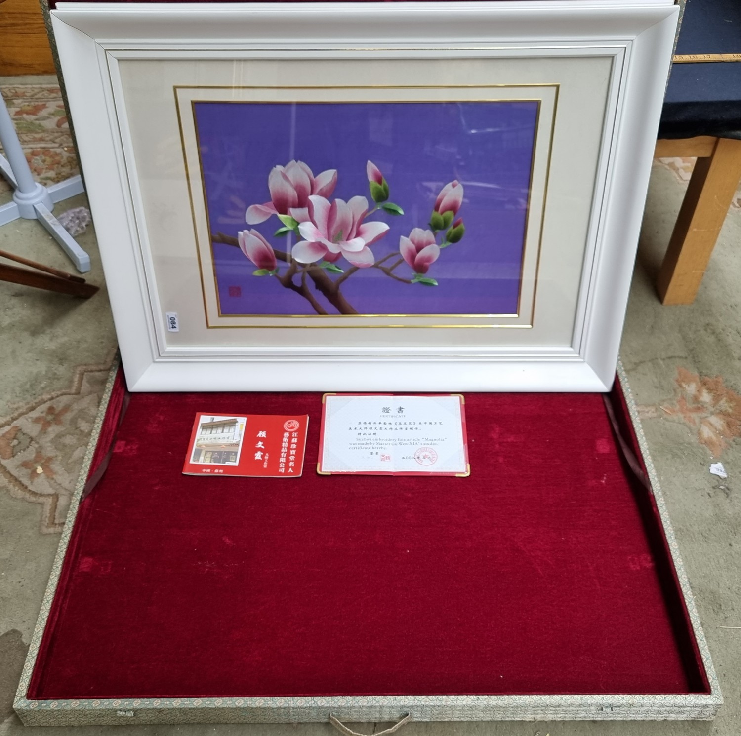 Suzhou embroidery fine article "Magnolia" was made by master Gu Wen-XIA's studio. Includes information booklet and certificate of authenticity. Comes in large original carry case. Super Item. The carry case measures 97cm x 73cm x 10cm.