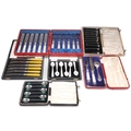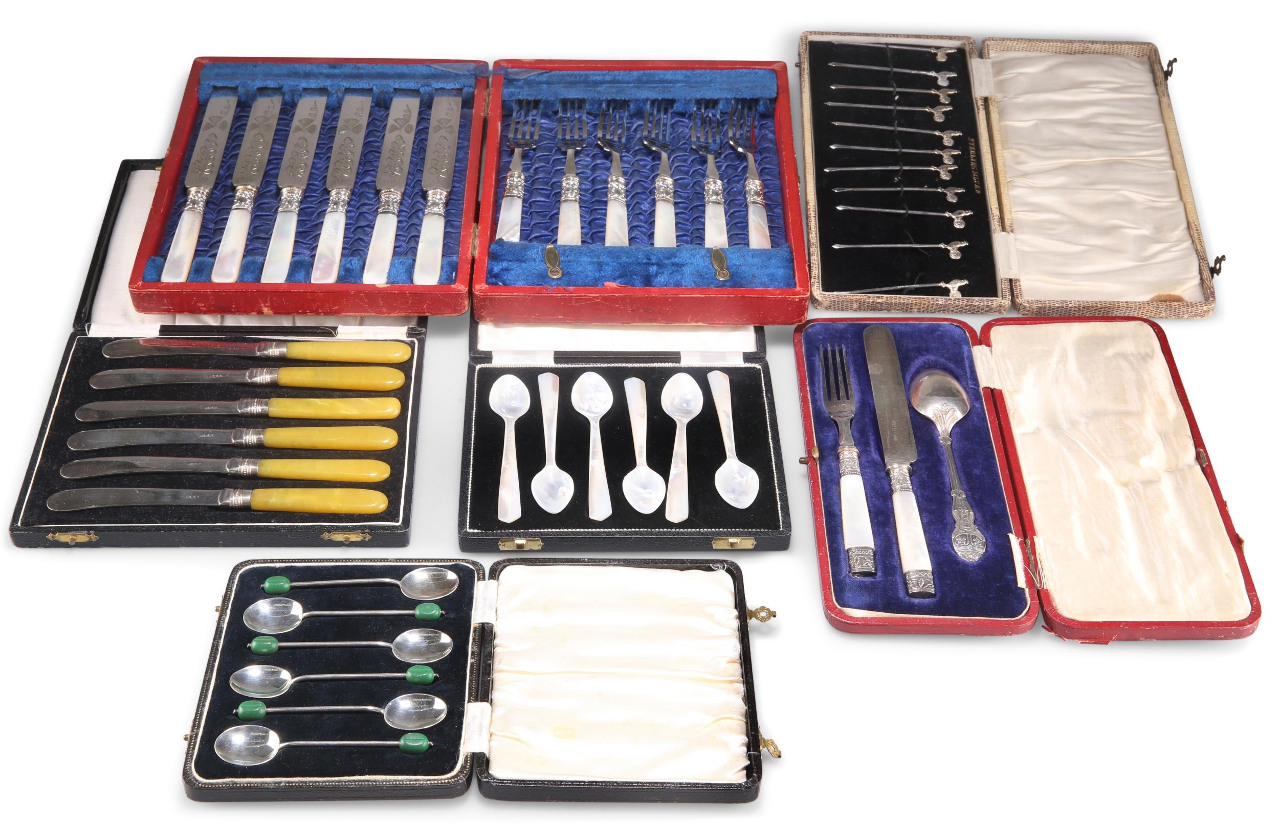 A SET OF SIX GEORGE VI SILVER COFFEE BEAN SPOONS, byÊWilliam Suckling Ltd, Birmingham 1938, each with green composite coffee bean to terminal, cased; andÊA SET OF ELEVEN STERLING SILVER COCKTAIL STICKS, cast with cockerel terminals, stamped 'STERLING SILVER', cased; together with assorted cased sets of silver-plated and mother-of-pearl flatware.Ê(6 cases) Coffee bean spoons 9.2cm, weighable silver 2.2 troy ounces gross
