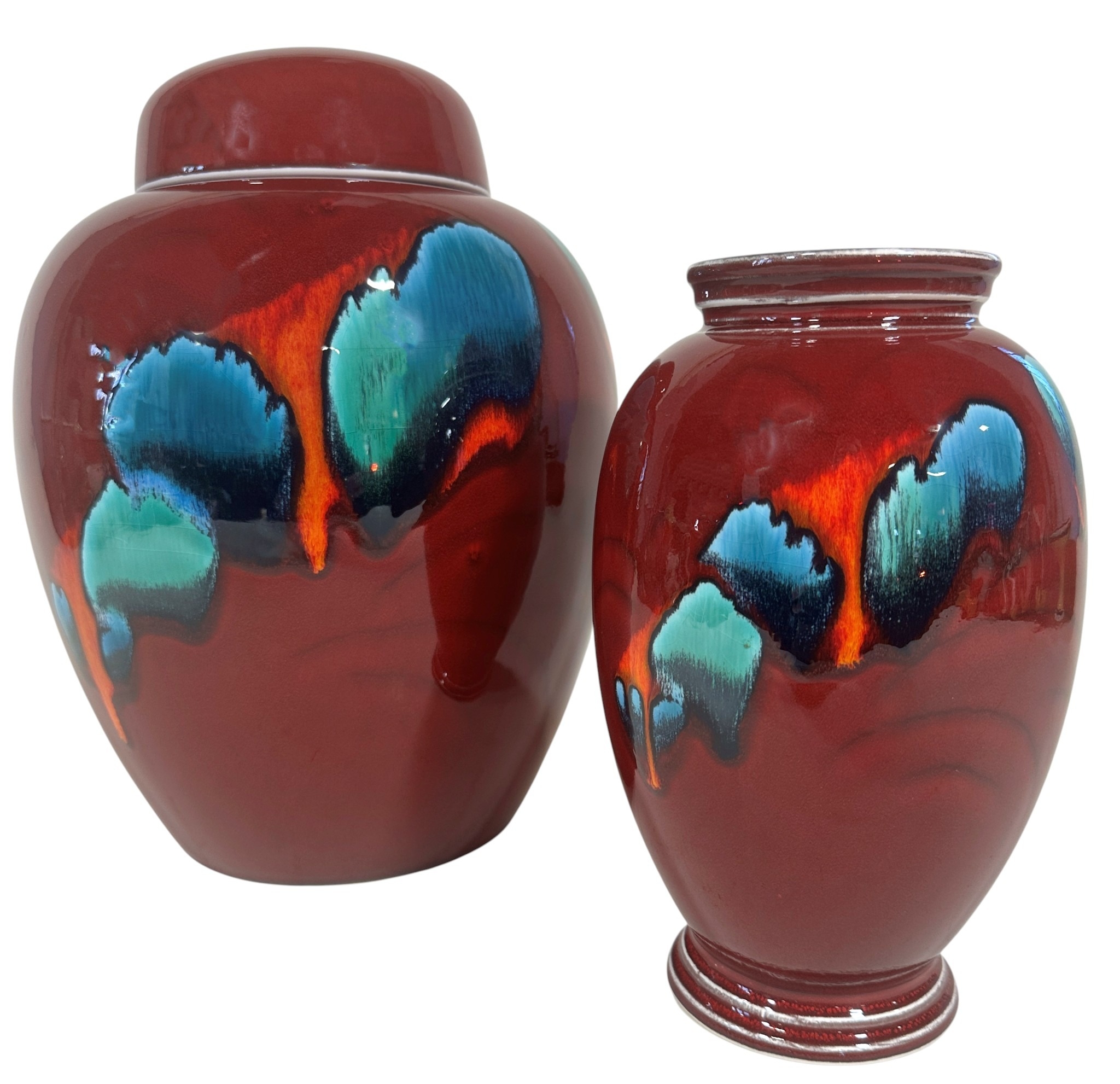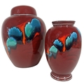 Poole pottery ginger jar and cover, Volcano Peacock pattern, together with a matching oviform vase, both signed and dated "Alan/Adam Delarke 30/4/99" with Liberty labels, 32cm maximum (2)