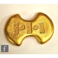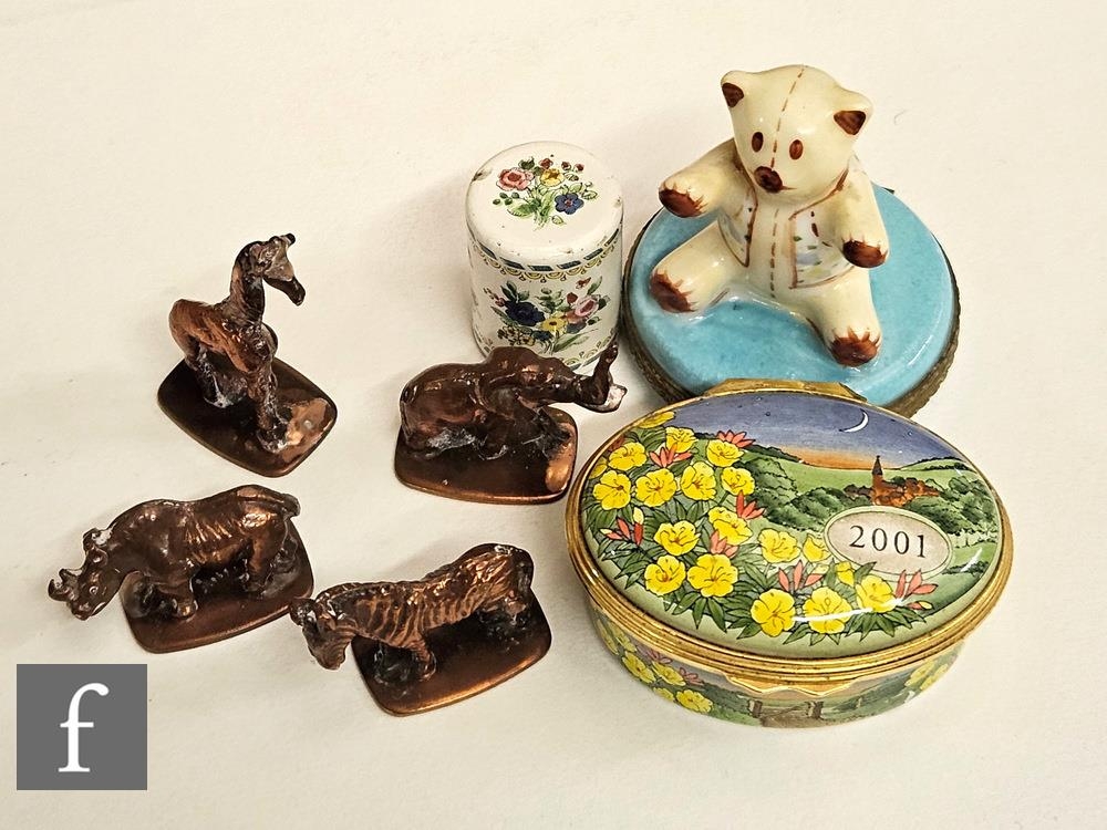 A 2001 Halcyon days enamel floral patch box, a similar box mounted with a bear, an enamelled cane top and four miniature copper figures, damages. (7)